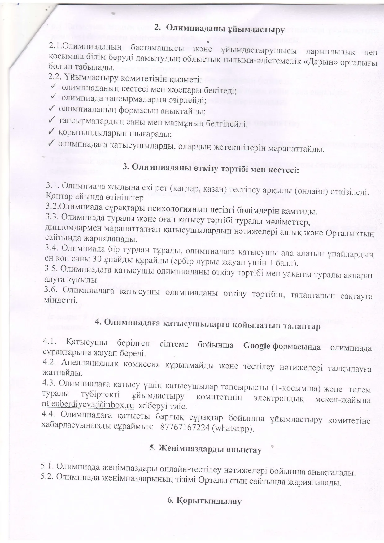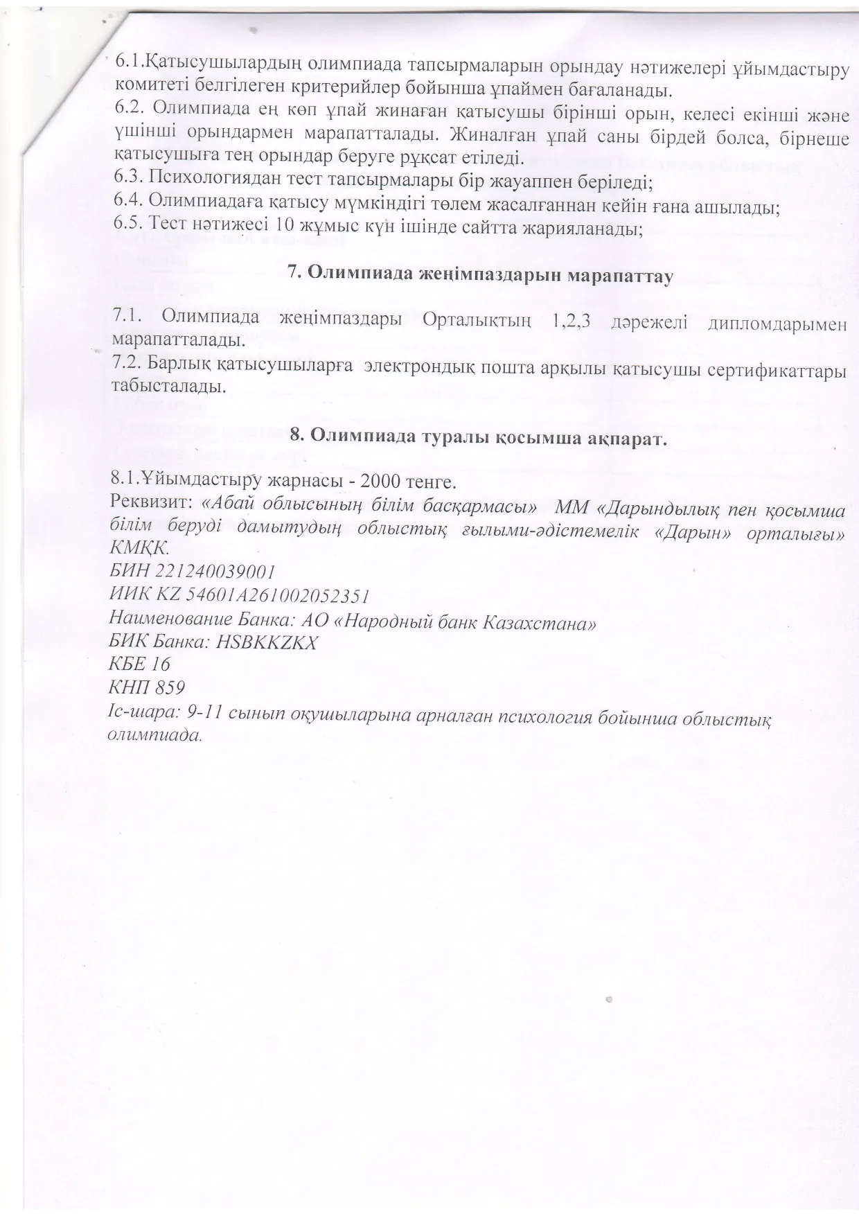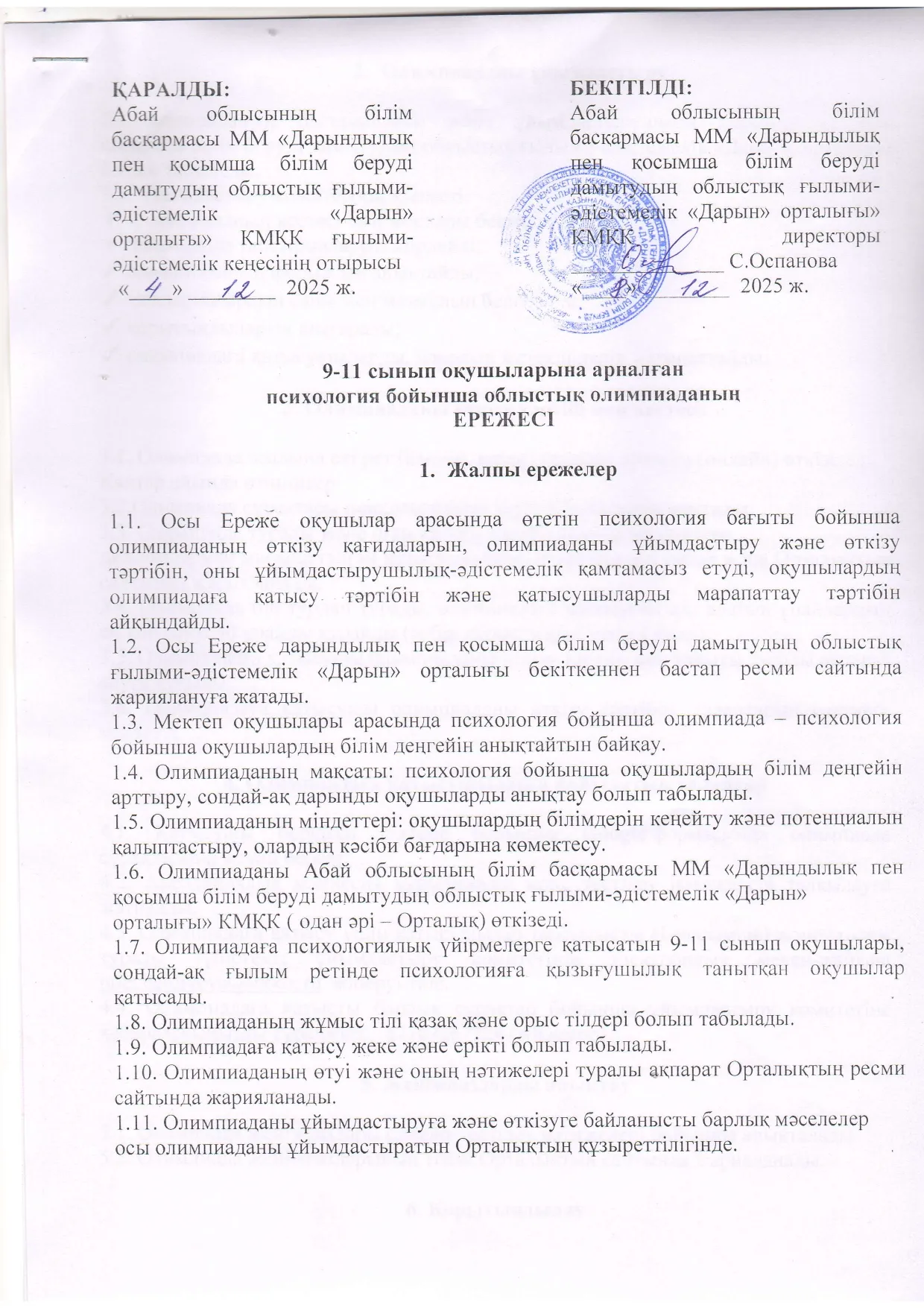 9-11 сынып оқушыларына арналған психология бойынша облыстық олимпиаданың ережесі Дарын Орталығы 17.02.2026