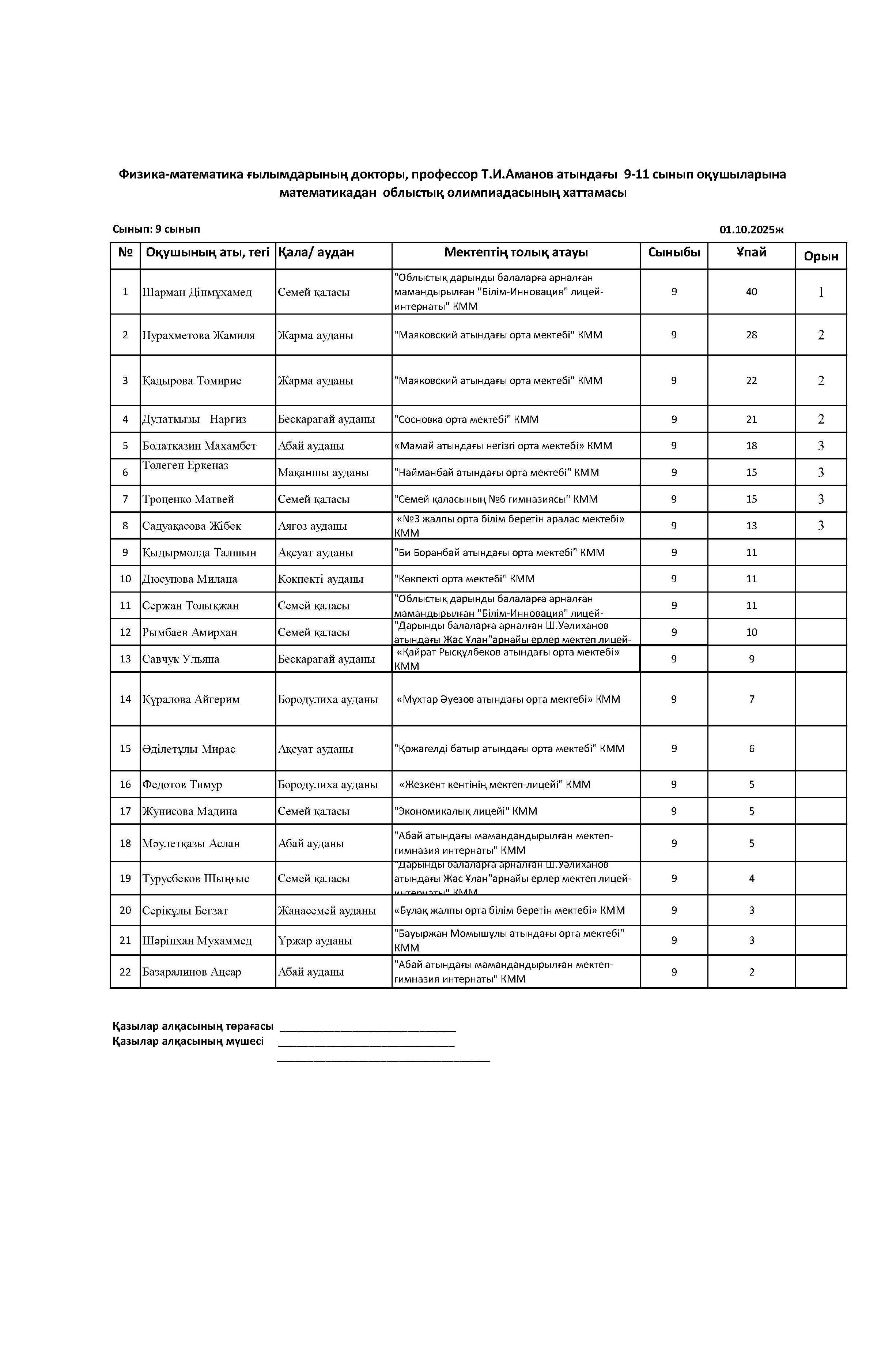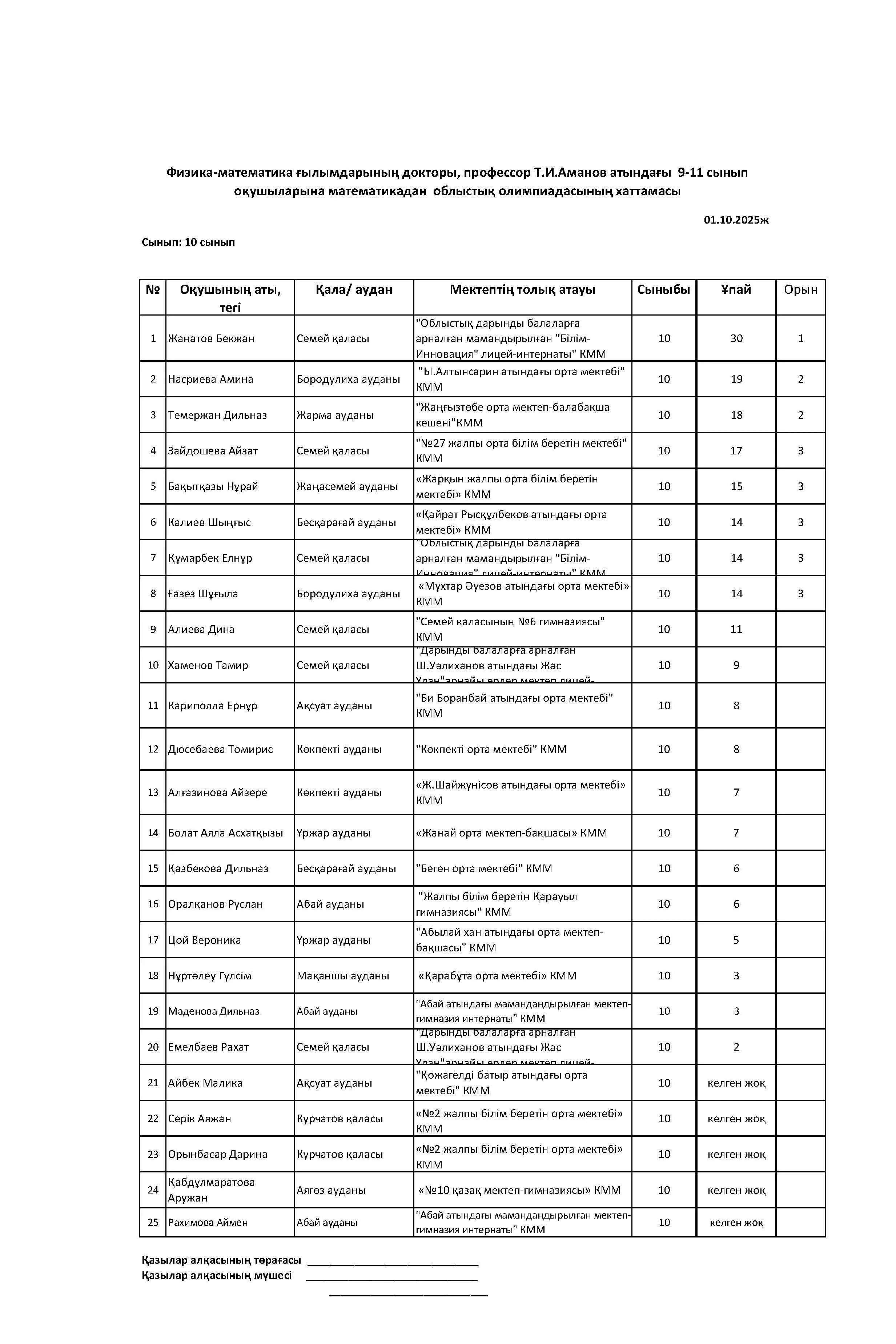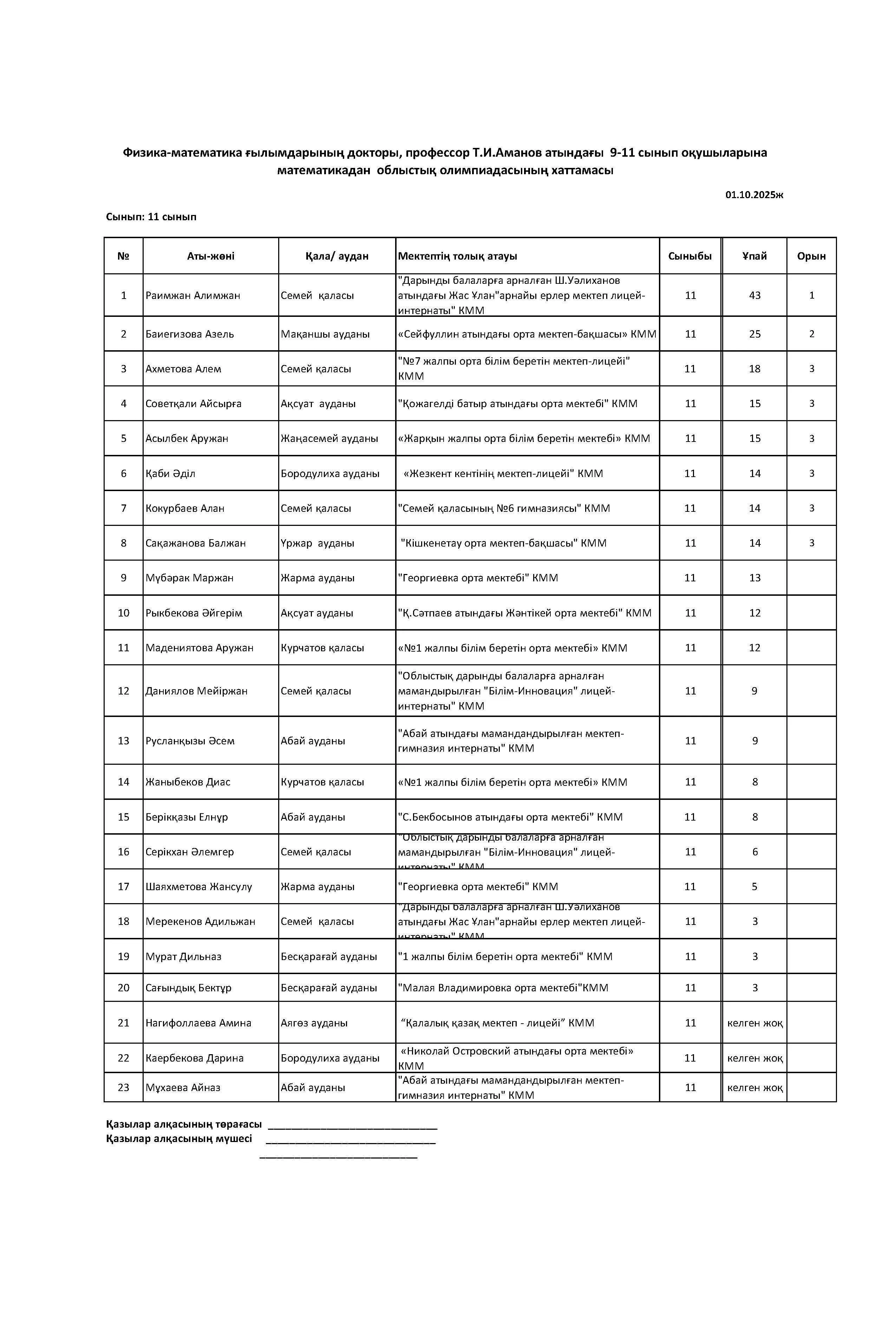 Физика-математика ғылымдарының докторы, профессор Т.И.Аманов атындағы жалпы білім беретін мектептердің 9-11 сынып оқушыларына математика пәнінен облыстық олимпиаданың қорытындысы