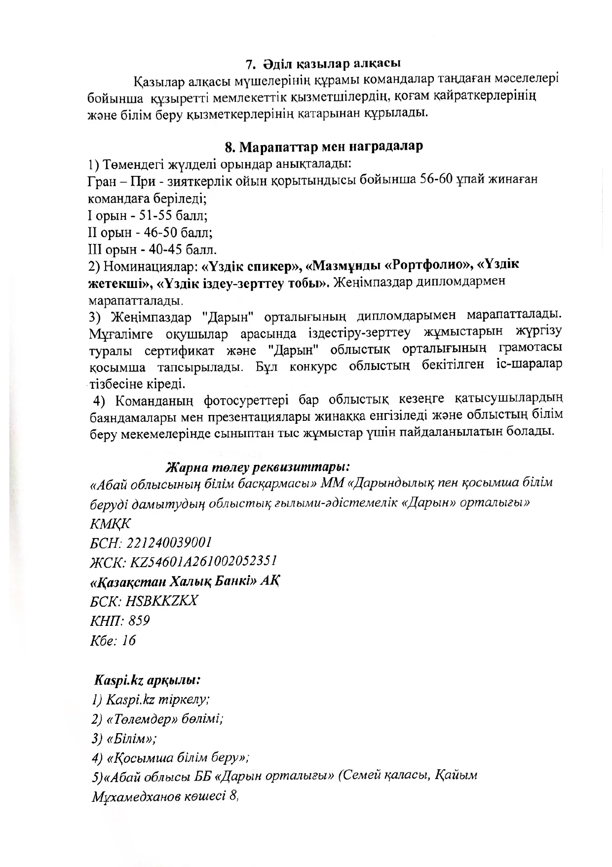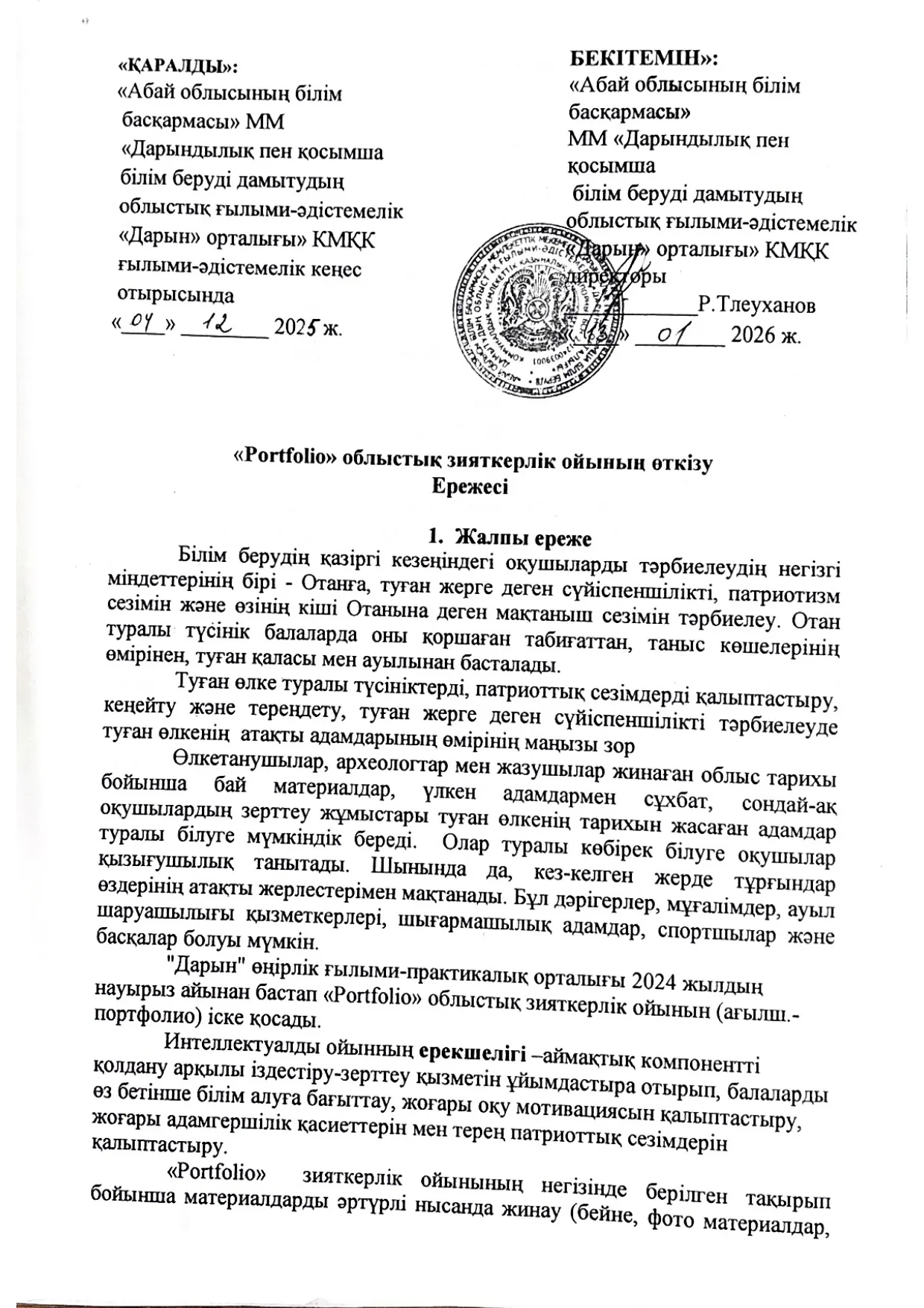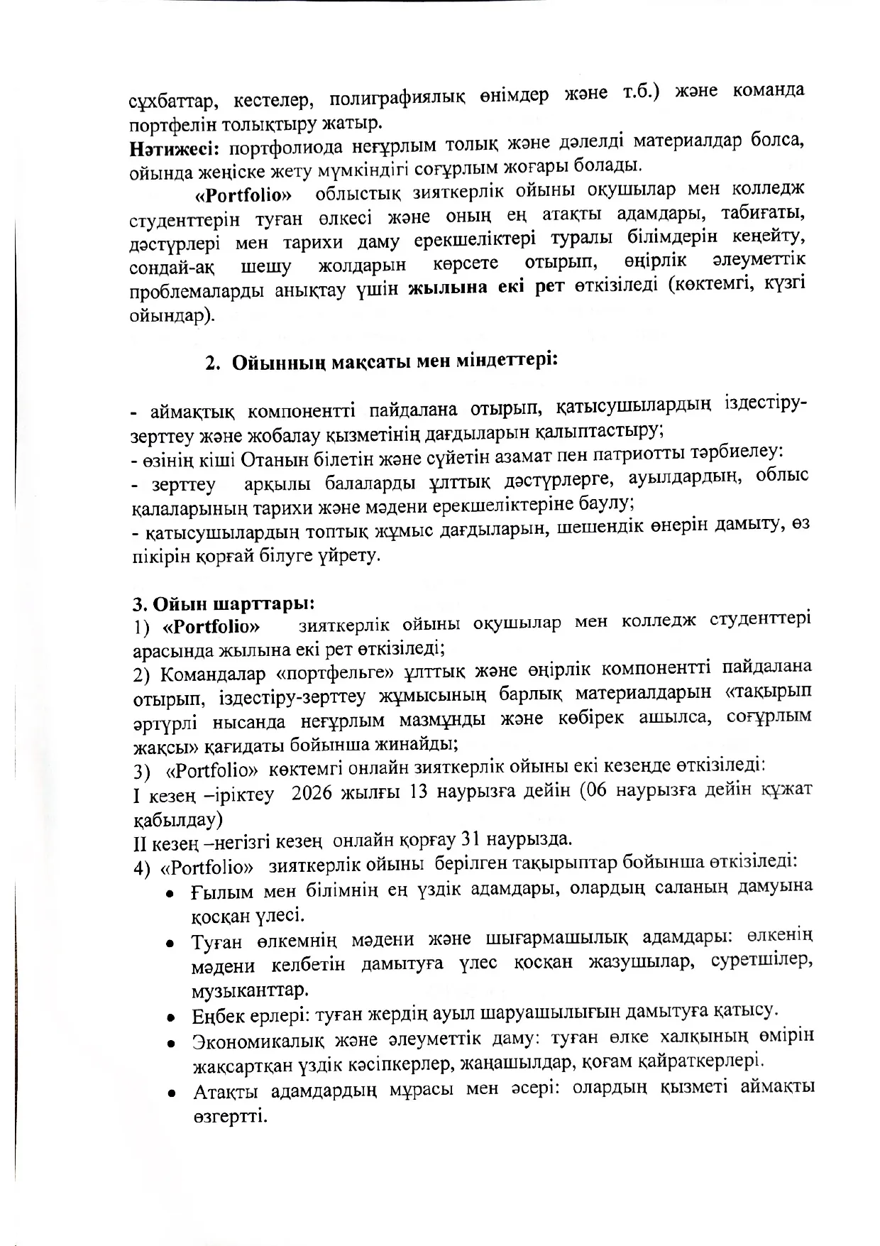 «Portfolio» облыстық зияткерлік ойынын өткізу Ережесі
