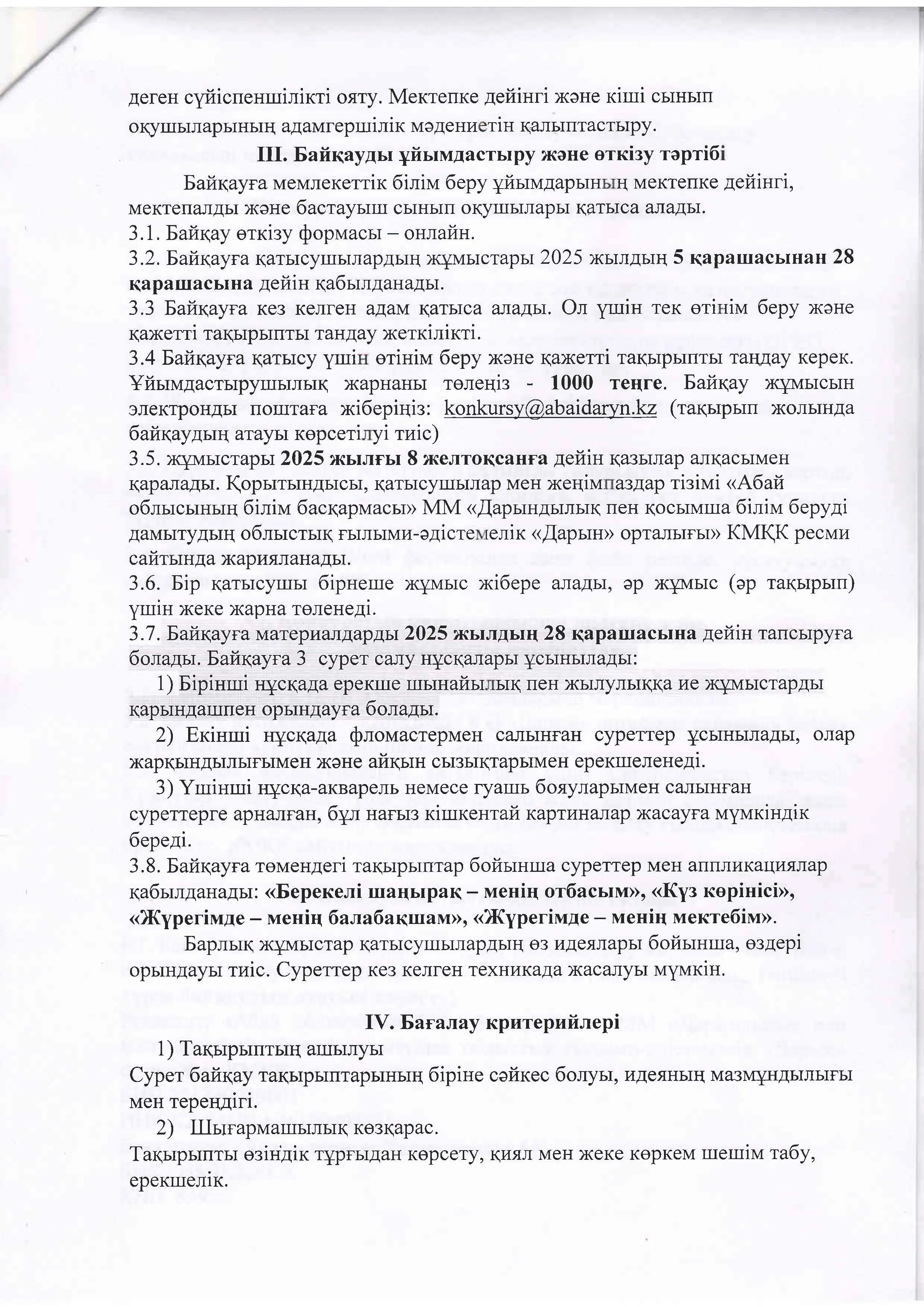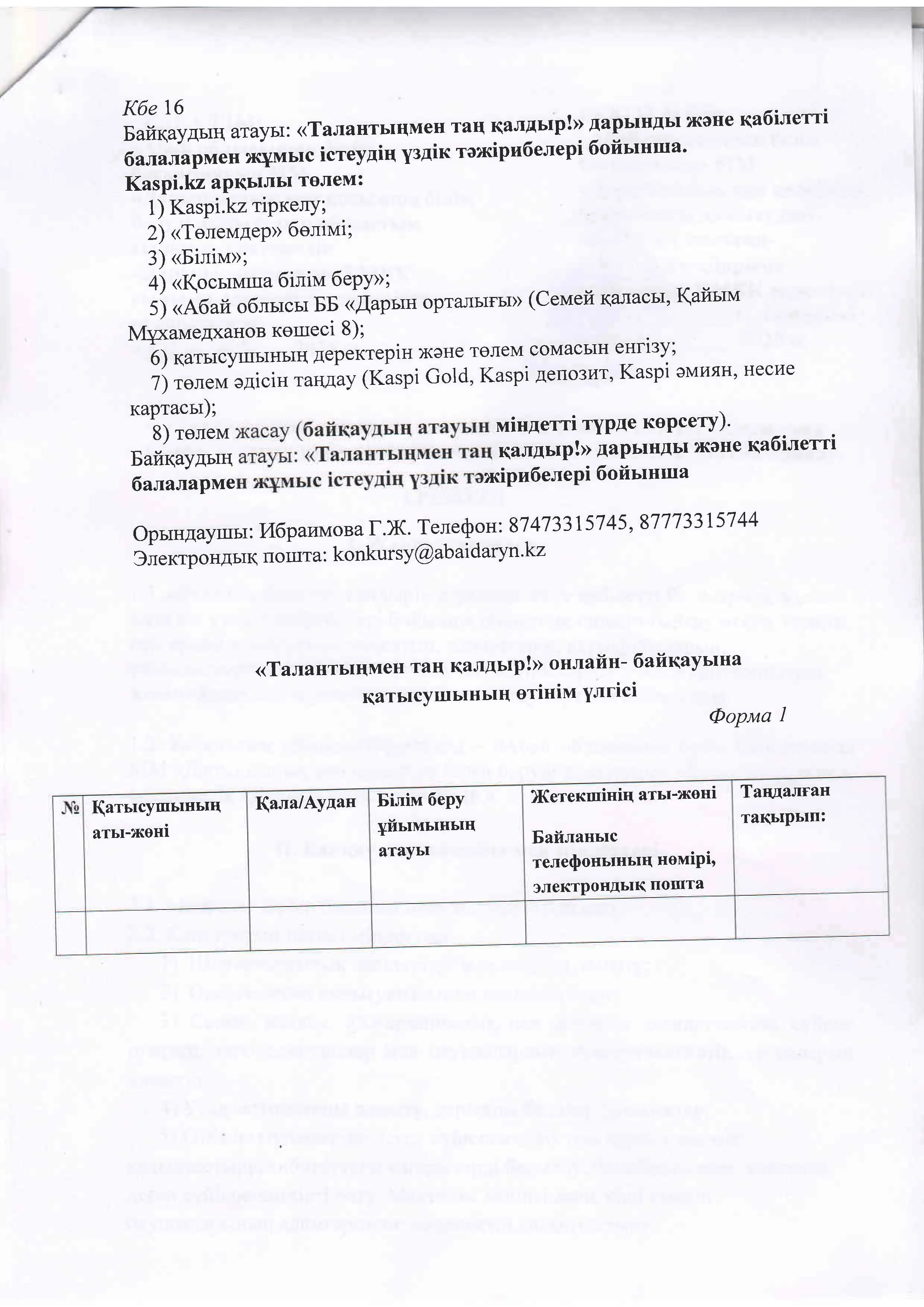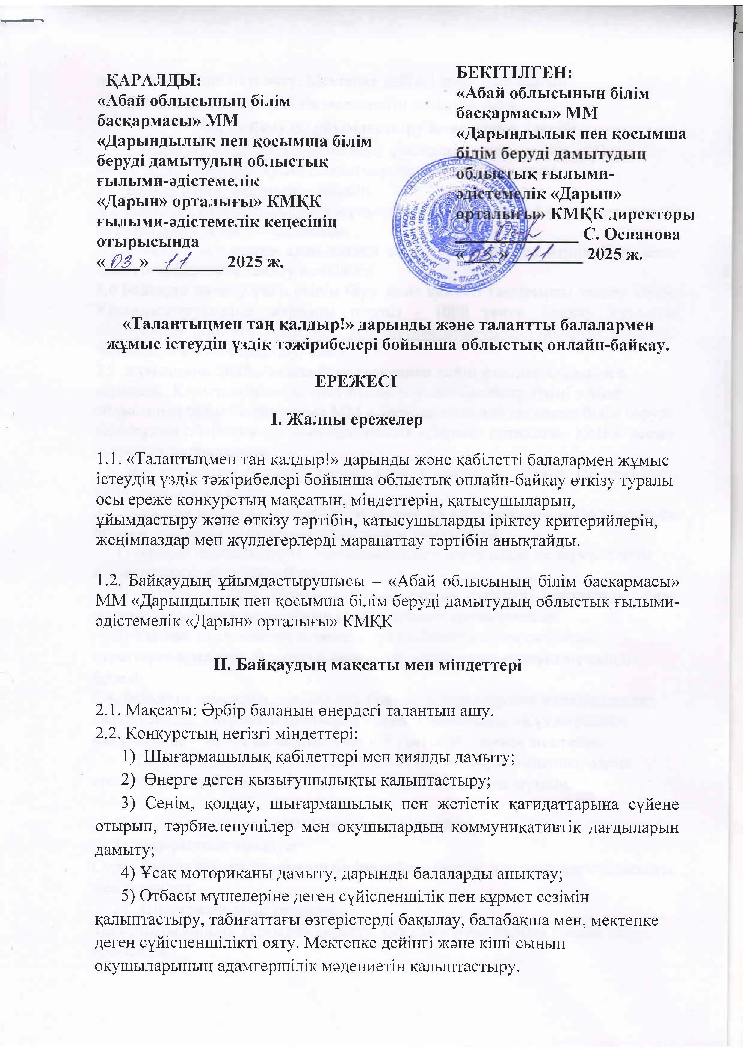 «Талантыңмен таң қалдыр!» дарынды және талантты балалармен жұмыс істеудің үздік тәжірибелері бойынша облыстық онлайн-байқау ЕРЕЖЕСІ Дарын Орталығы 04.11.2025