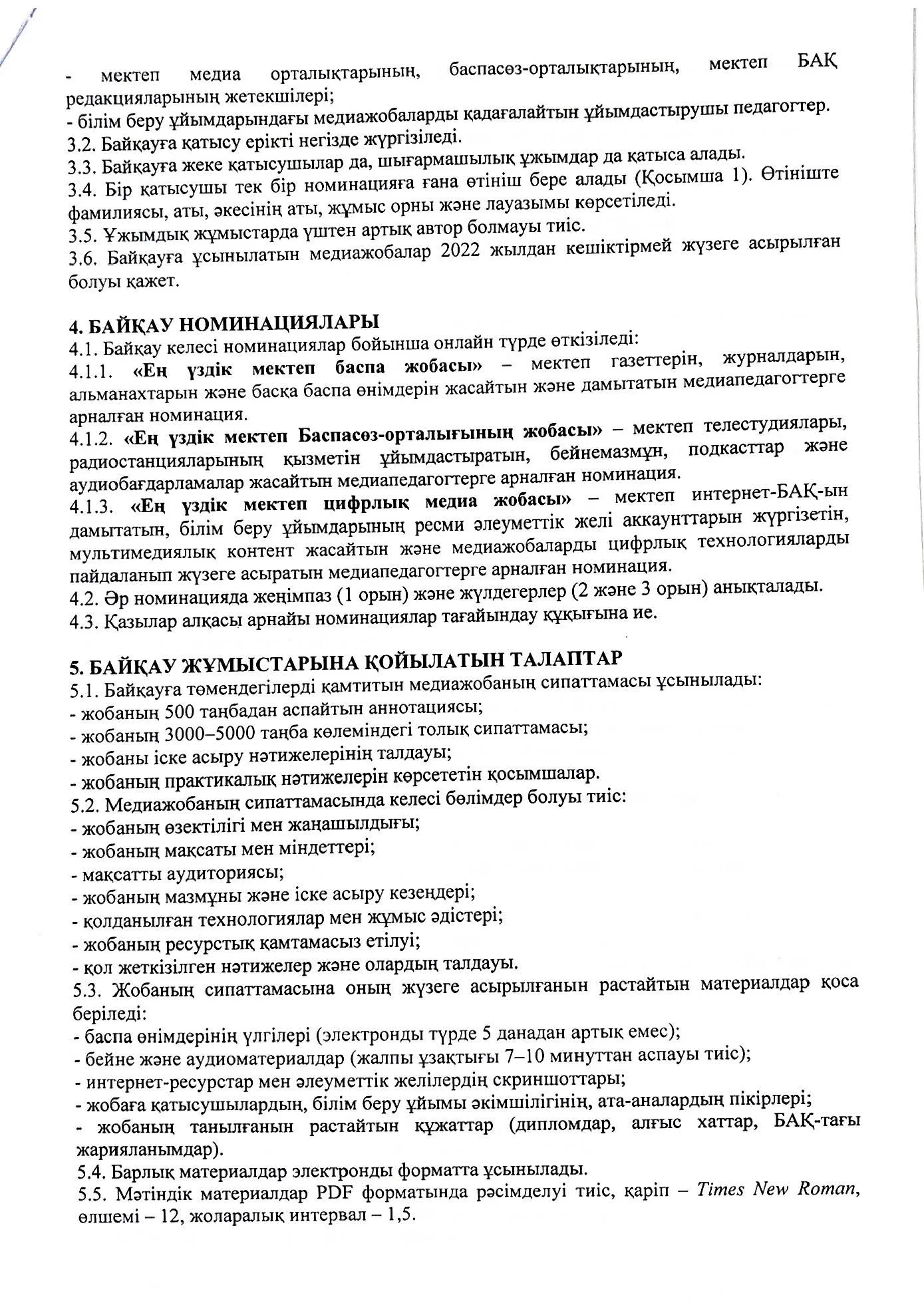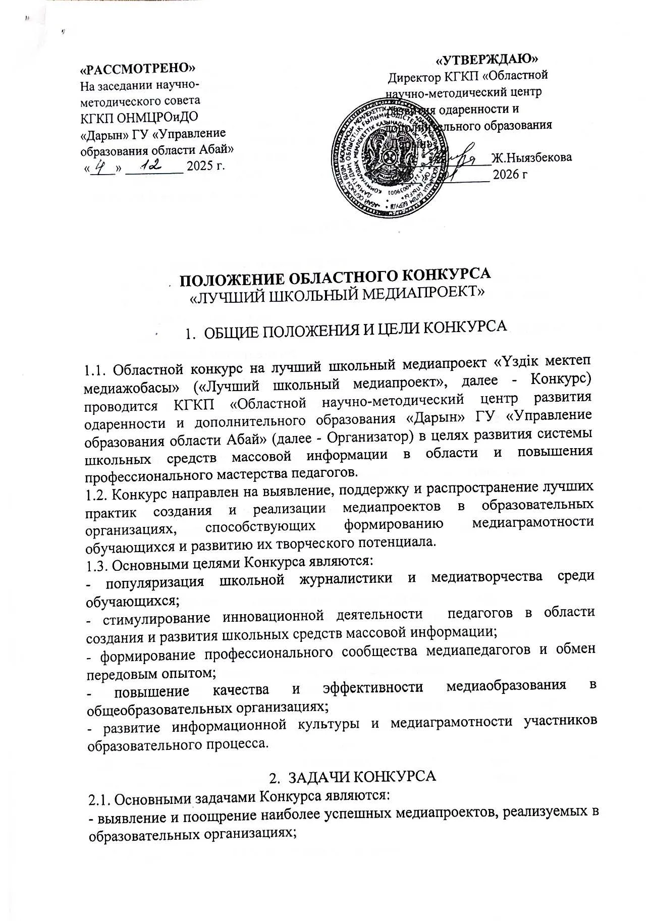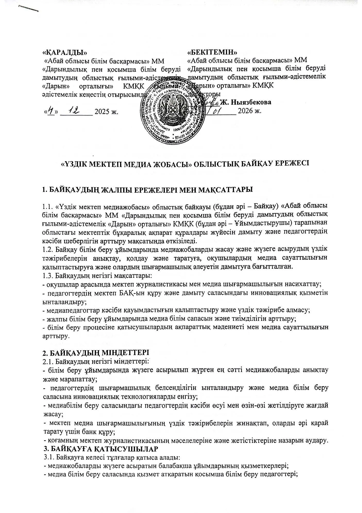 "ҮЗДІК МЕКТЕП МЕДИА ЖОБАСЫ" ОБЛЫСТЫҚ БАЙҚАУЫНЫҢ ЕРЕЖЕСІ