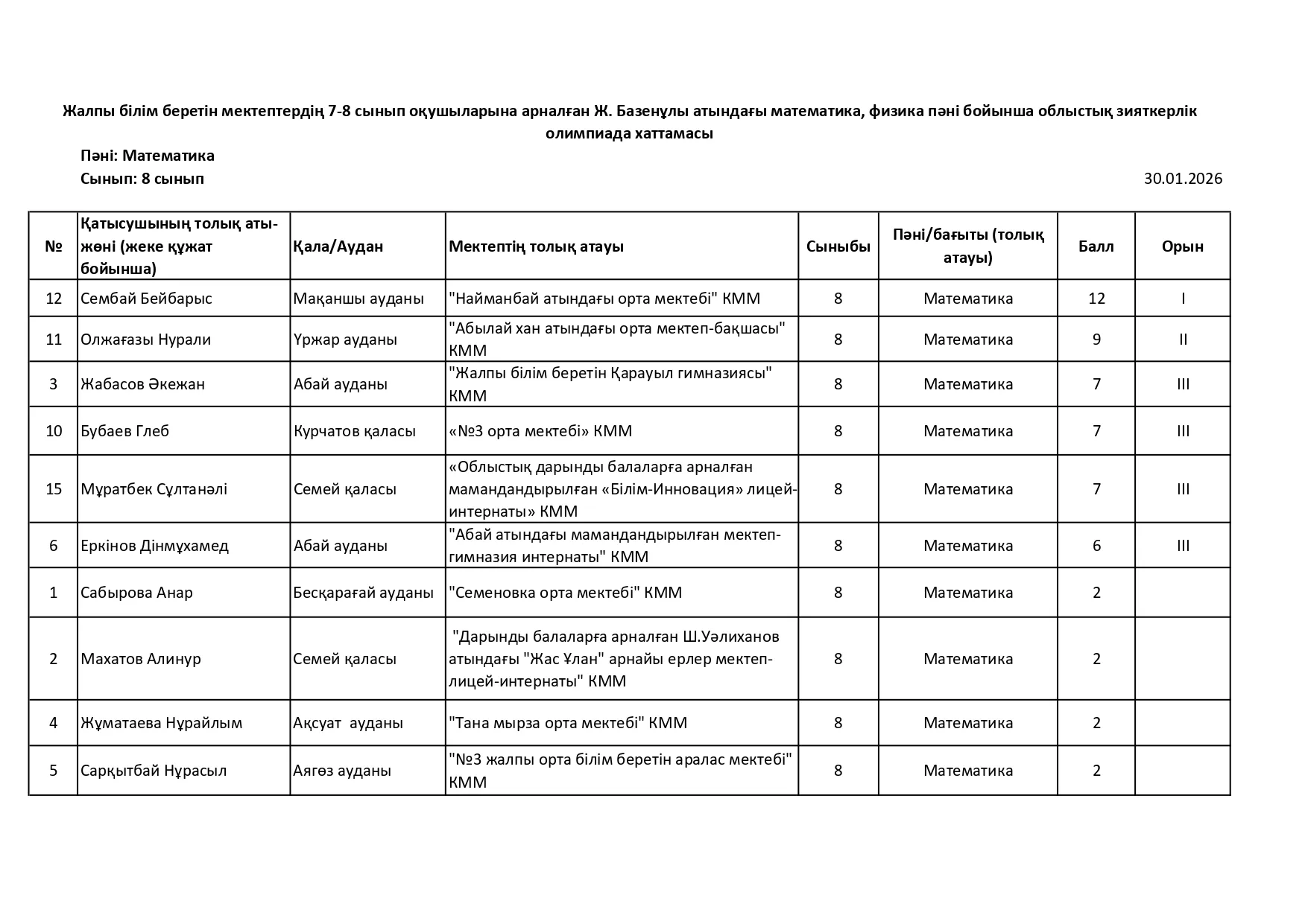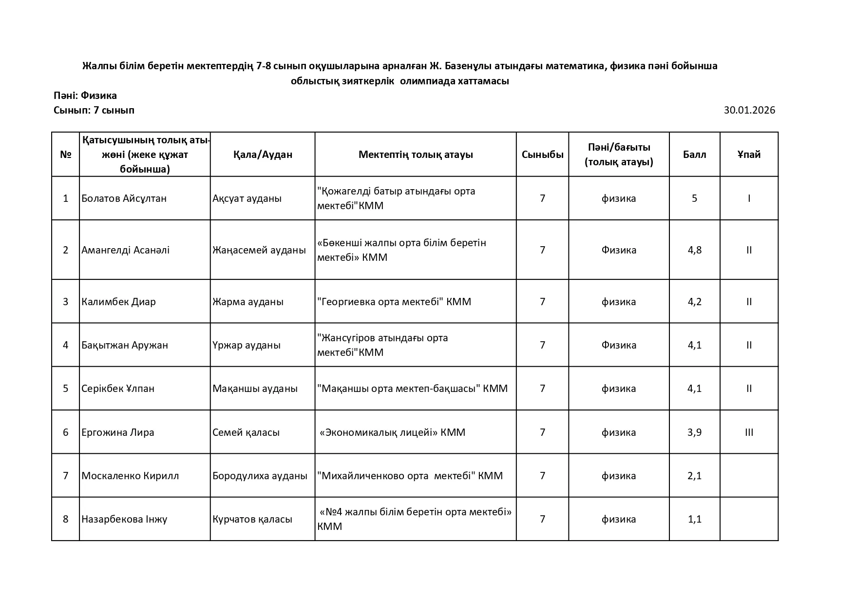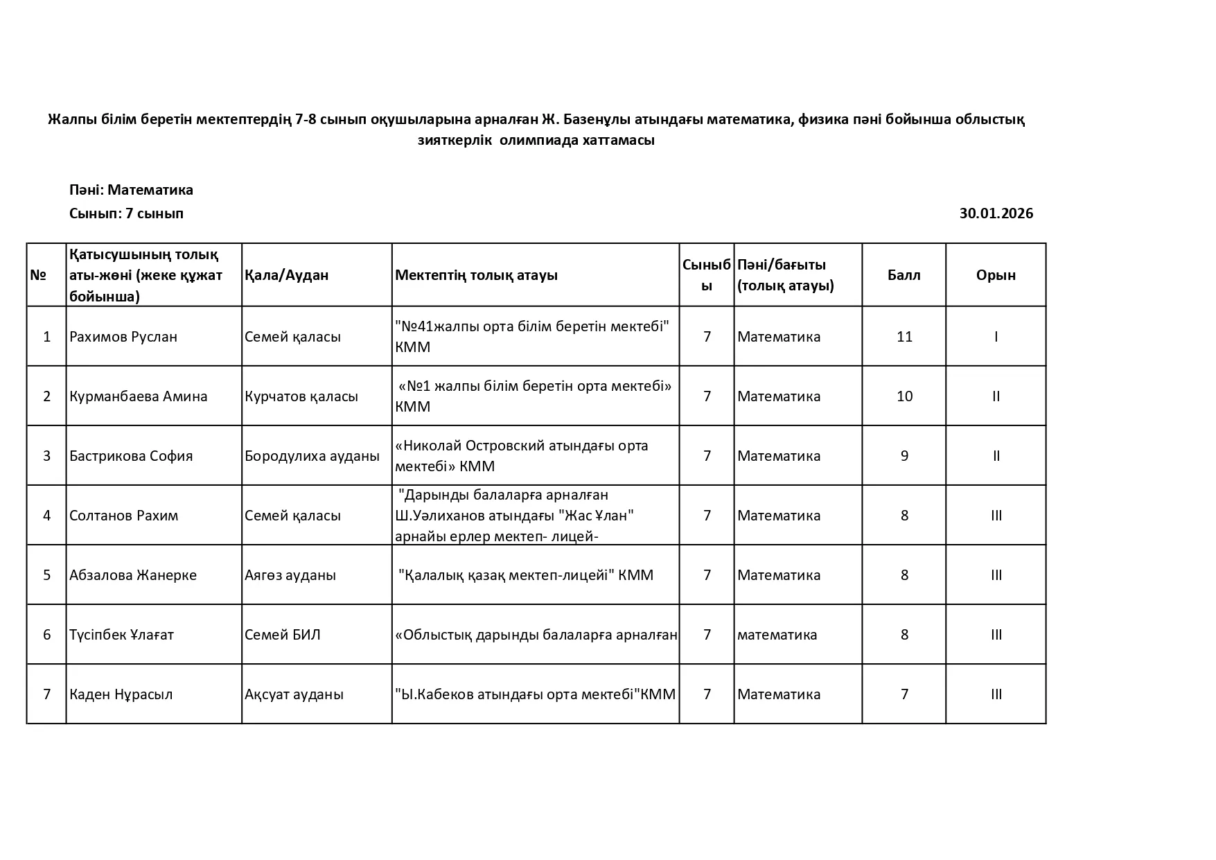 Жалпы білім беретін мектептердің 7-8 сынып оқушыларына арналған Ж. Базенұлы атындағы математика, физика пәні бойынша облыстық зияткерлік  олимпиада хаттамасы