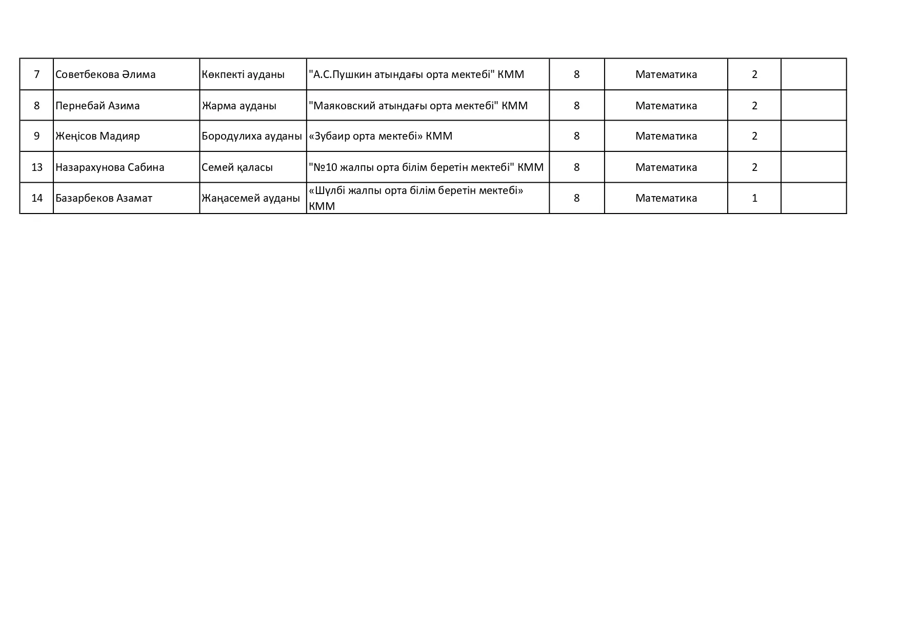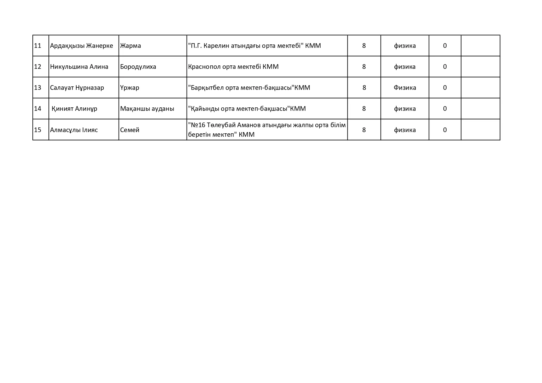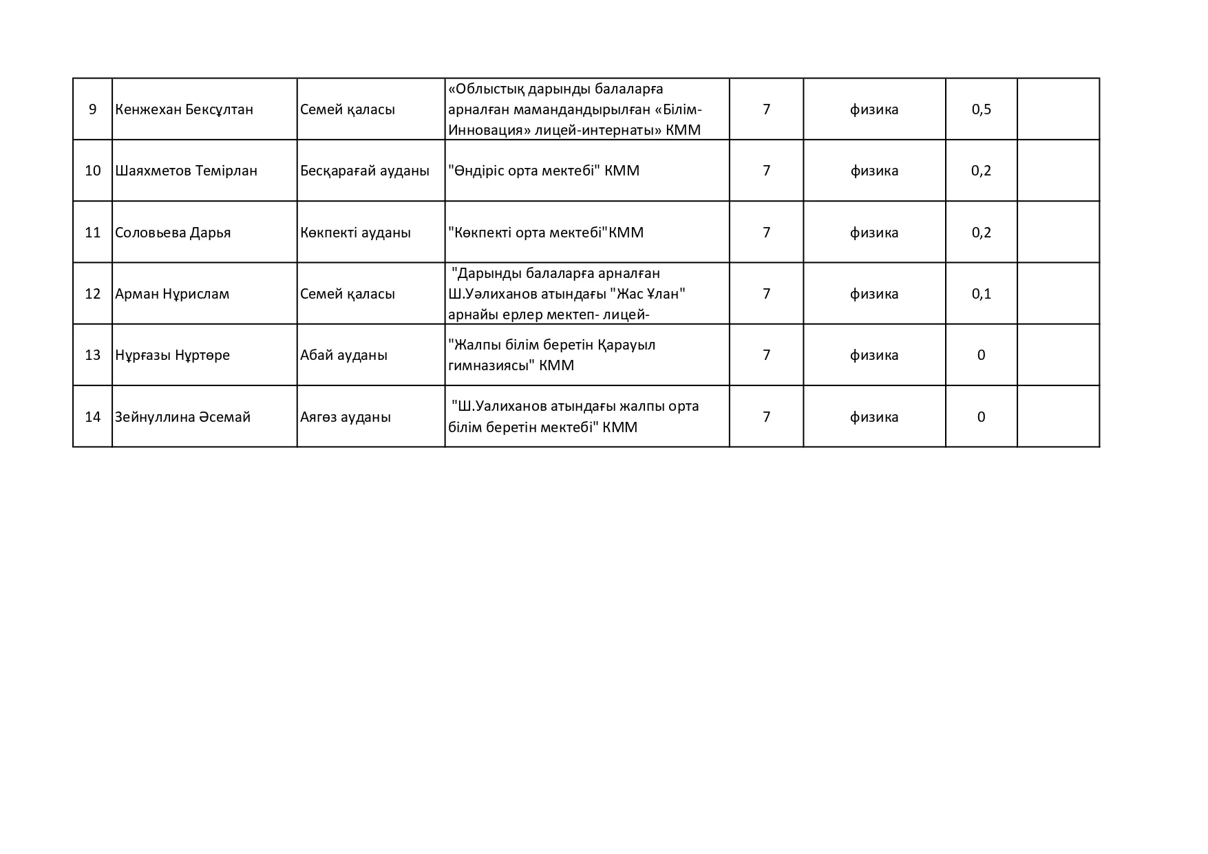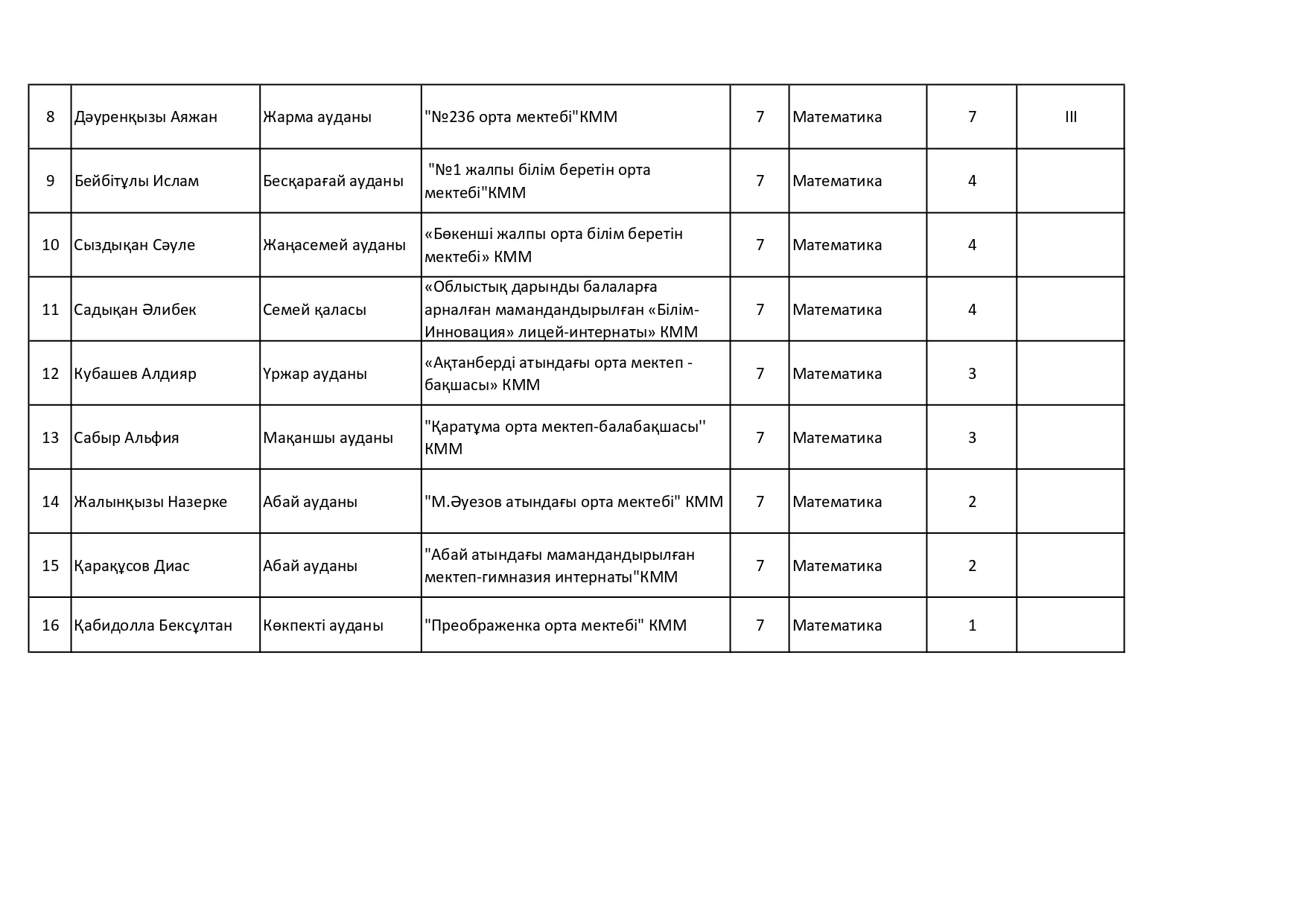 Жалпы білім беретін мектептердің 7-8 сынып оқушыларына арналған Ж. Базенұлы атындағы математика, физика пәні бойынша облыстық зияткерлік  олимпиада хаттамасы