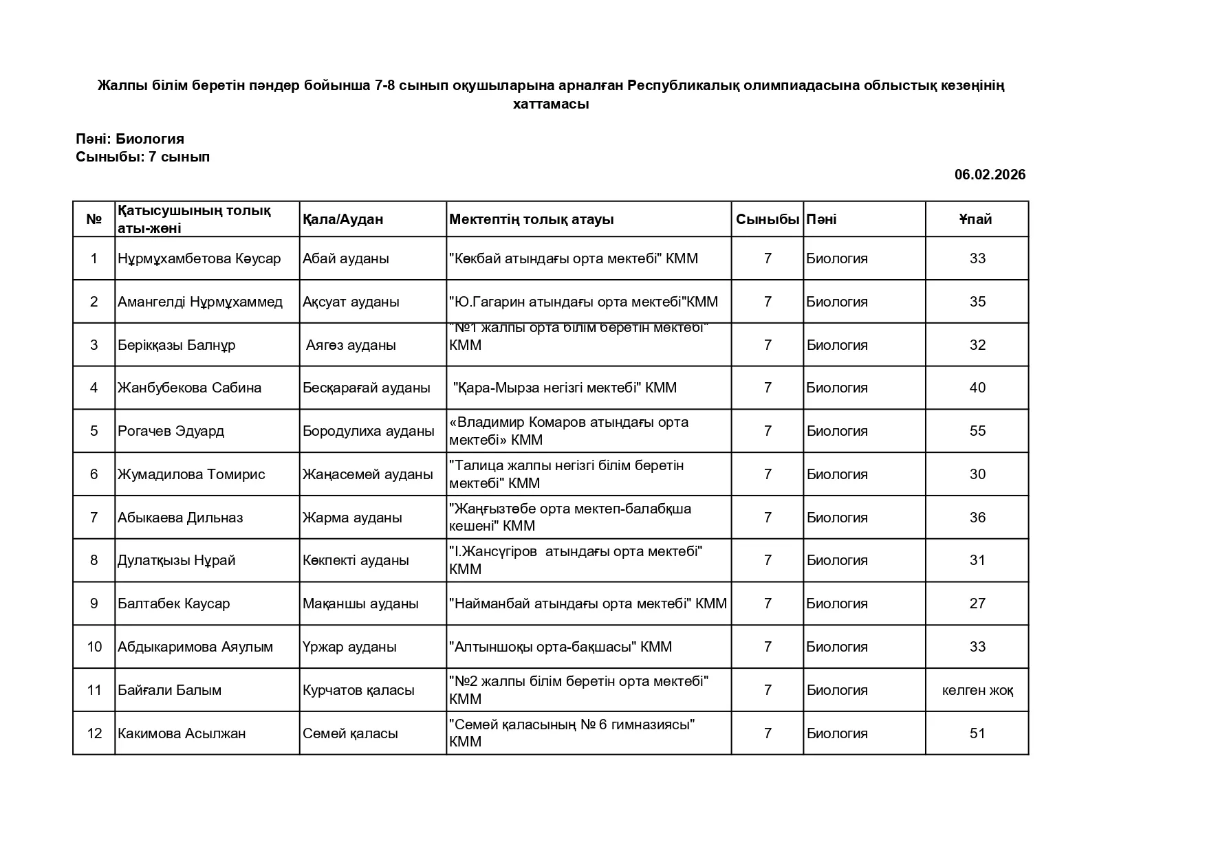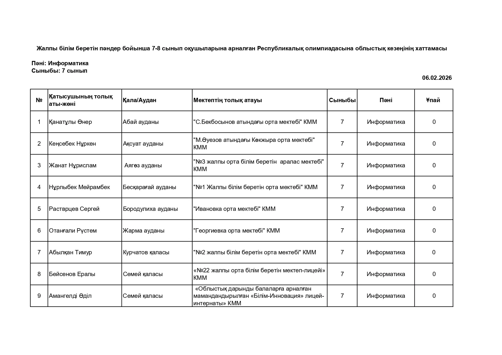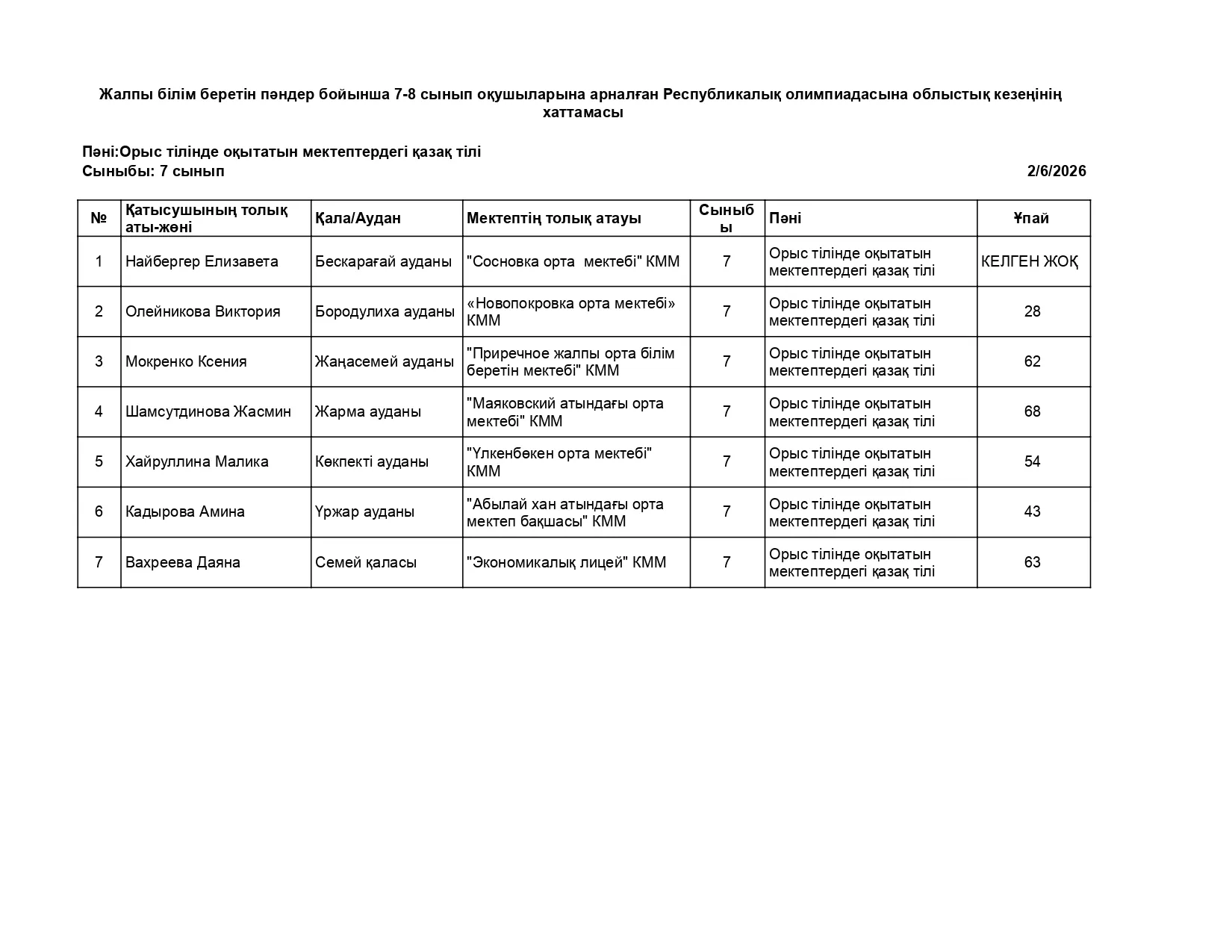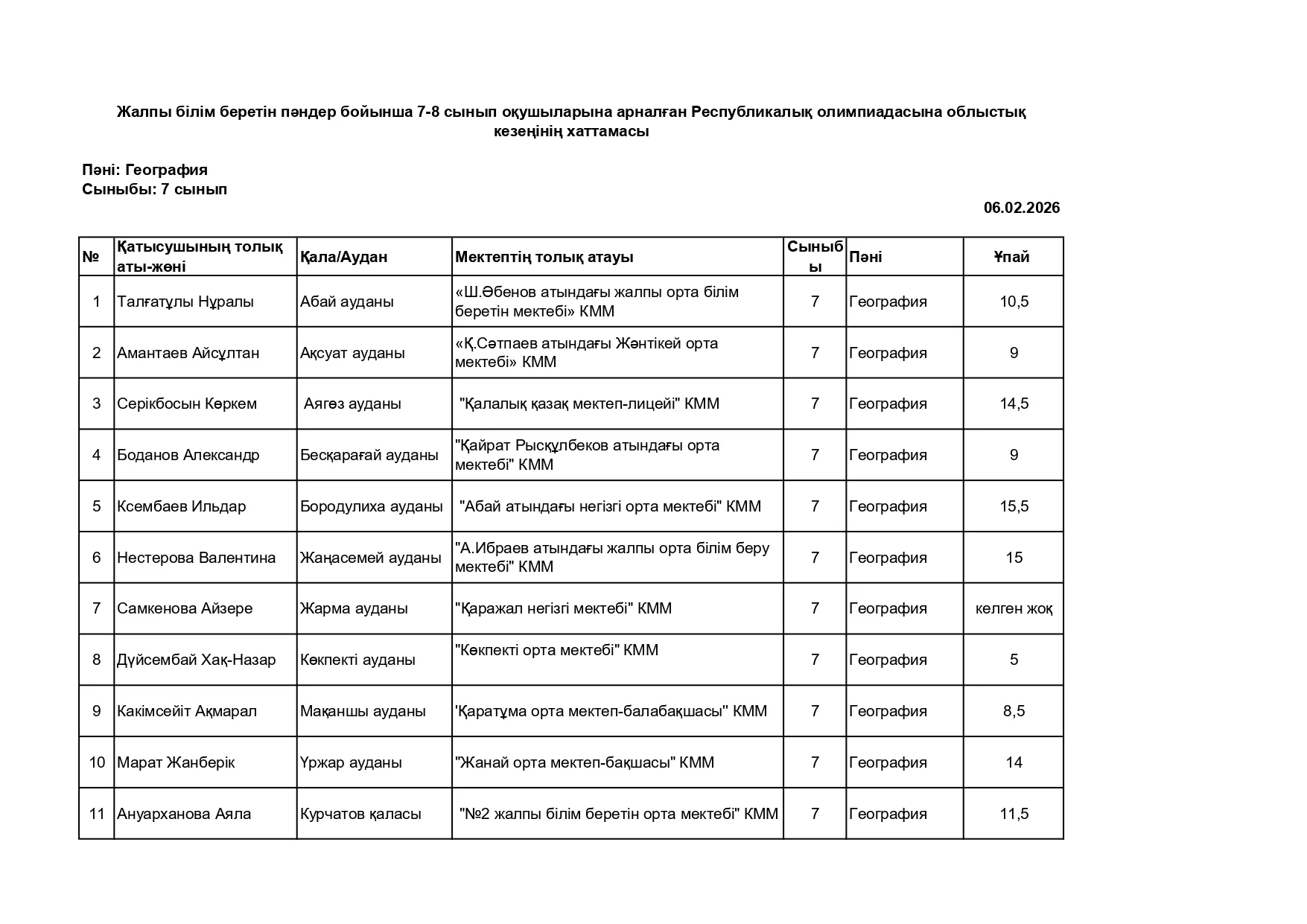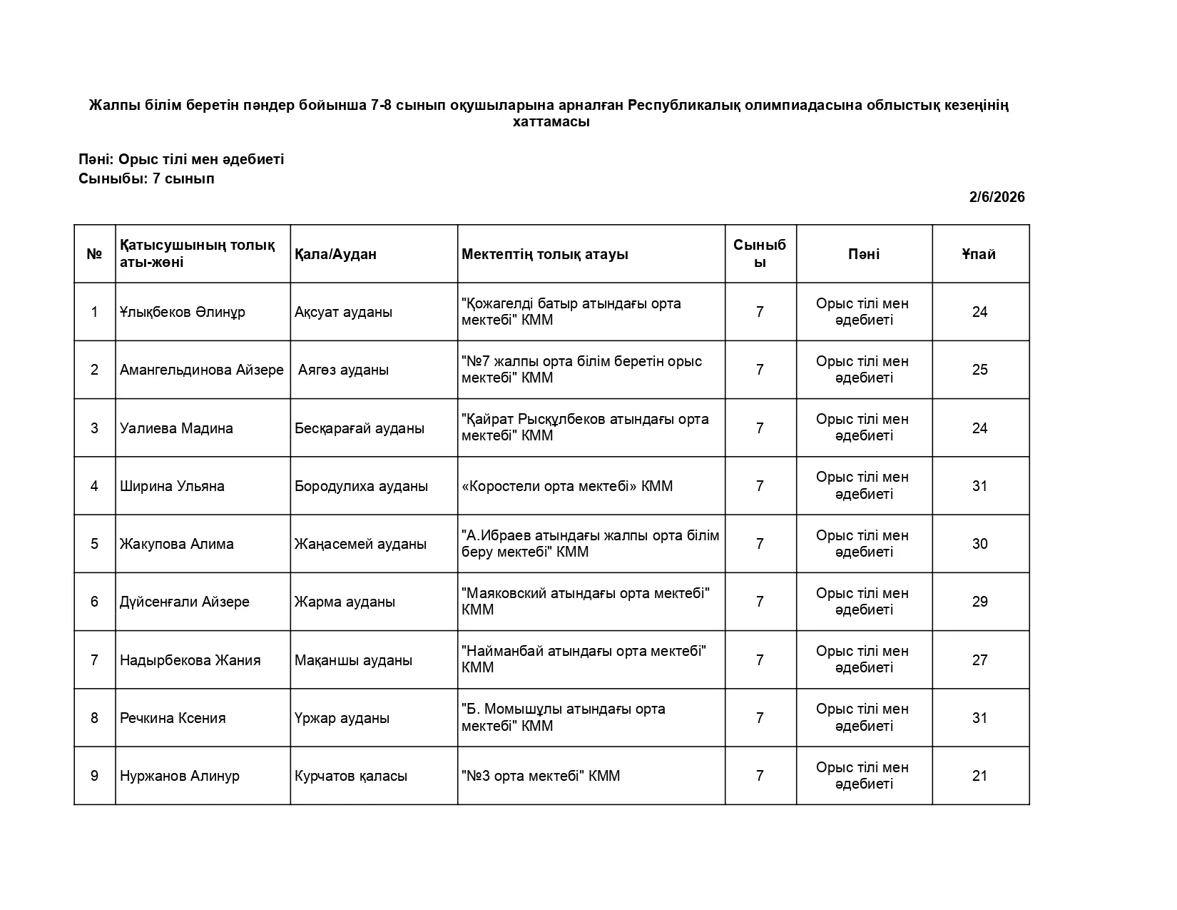 Жалпы білім беретін пәндер бойынша 7-8 сынып оқушыларына арналған республикалық олимпиаданың облыстық кезеңінің хаттамасы Дарын Орталығы 06.02.2026