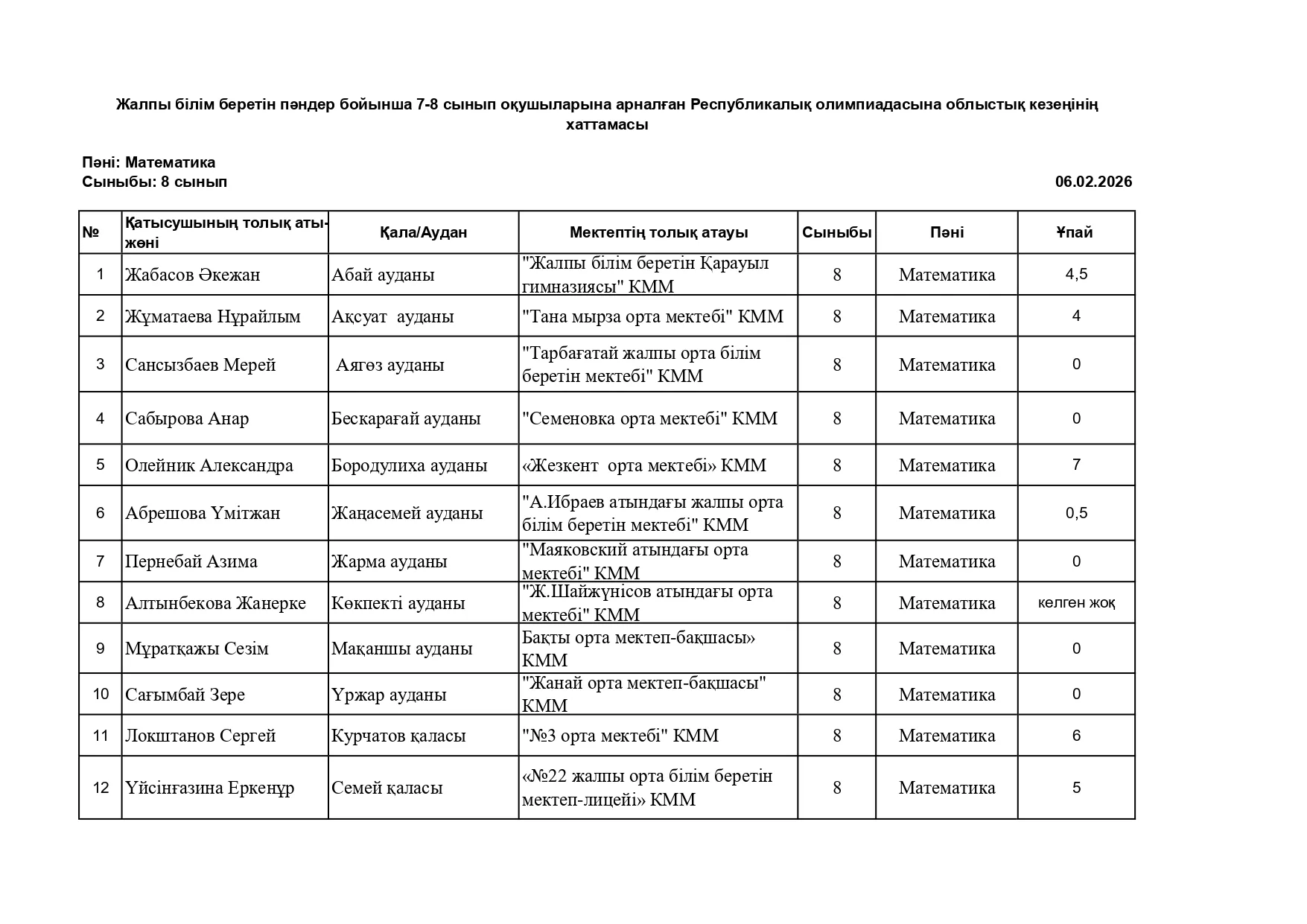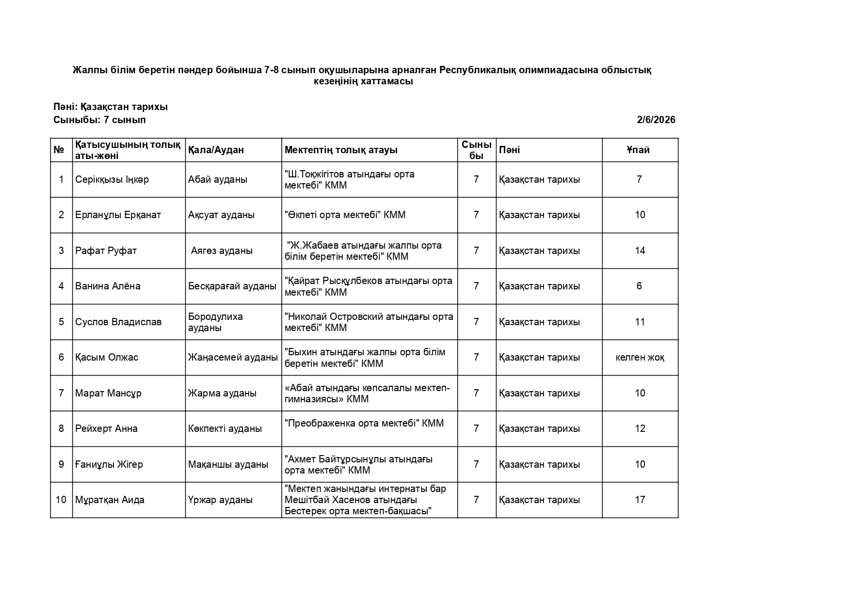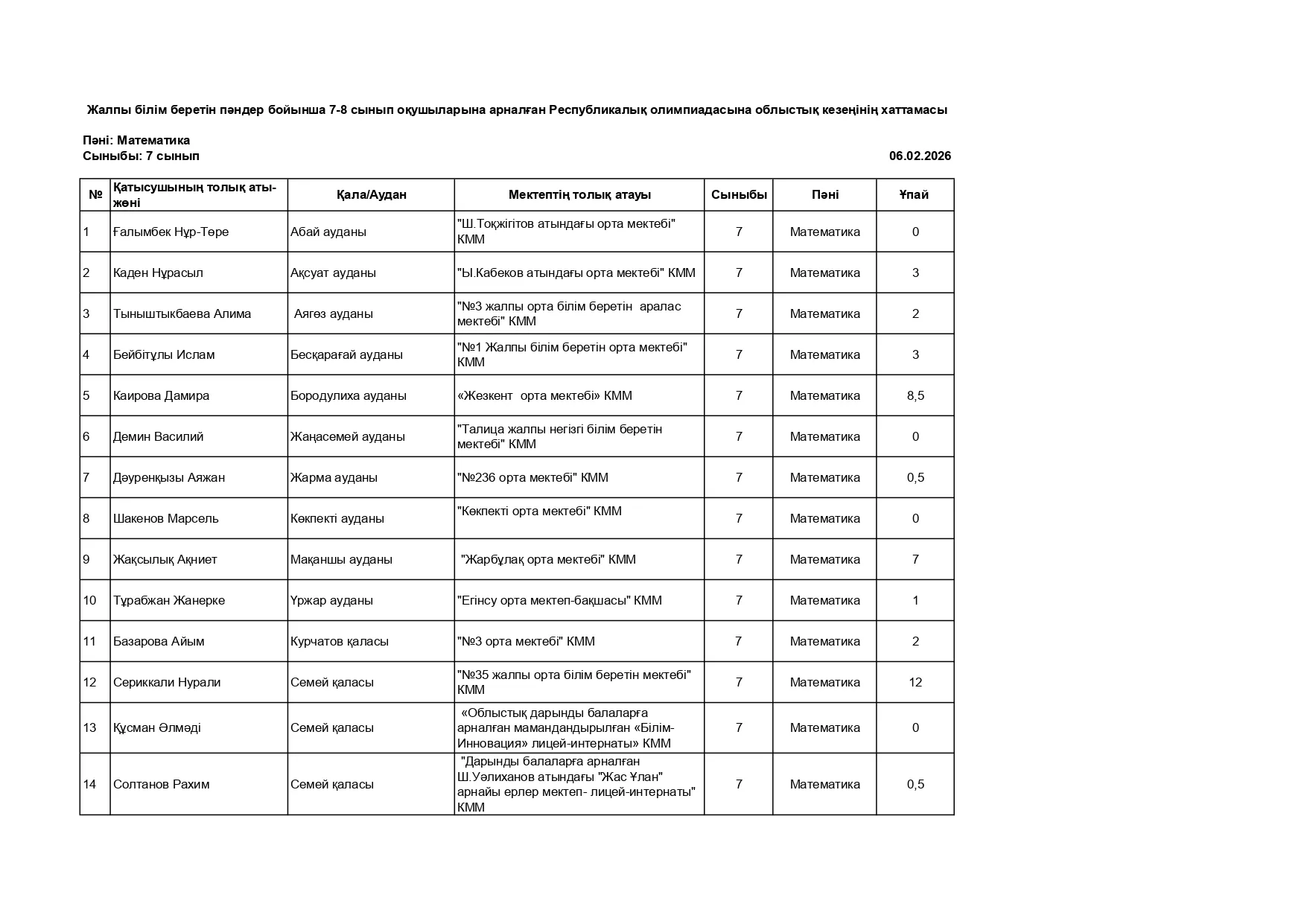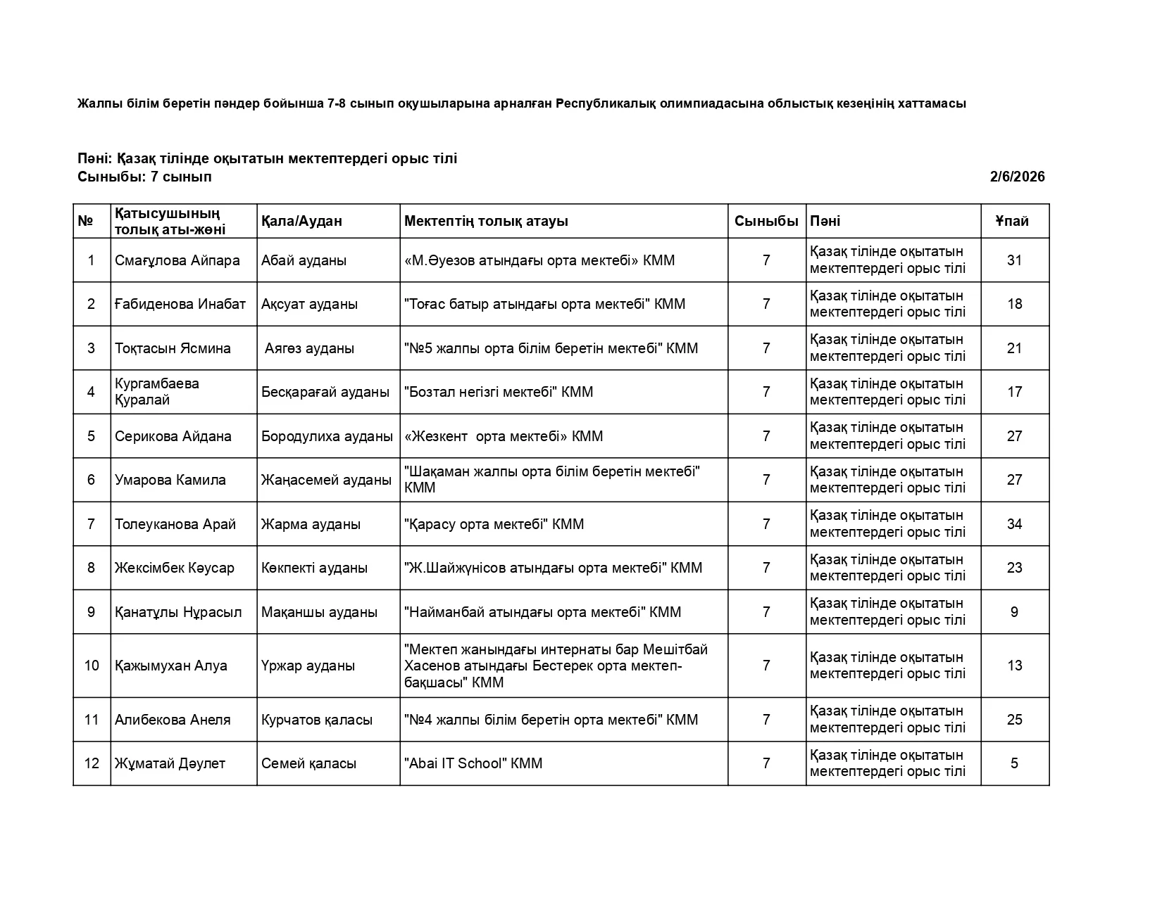 Жалпы білім беретін пәндер бойынша 7-8 сынып оқушыларына арналған республикалық олимпиаданың облыстық кезеңінің хаттамасы Дарын Орталығы 06.02.2026