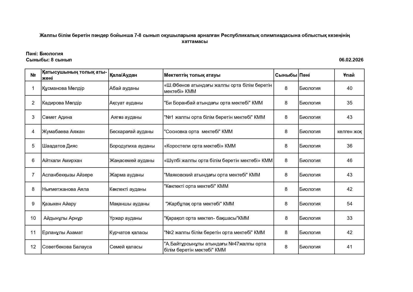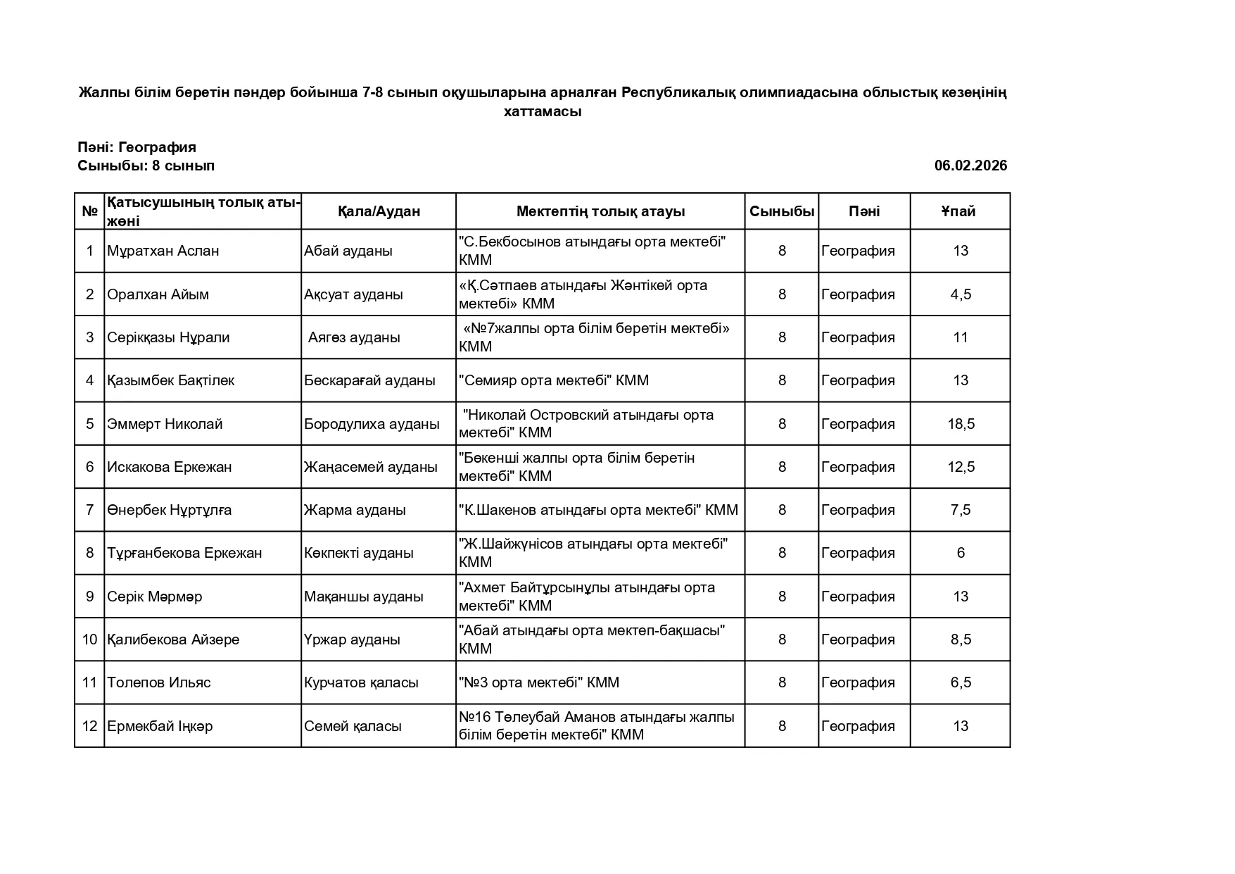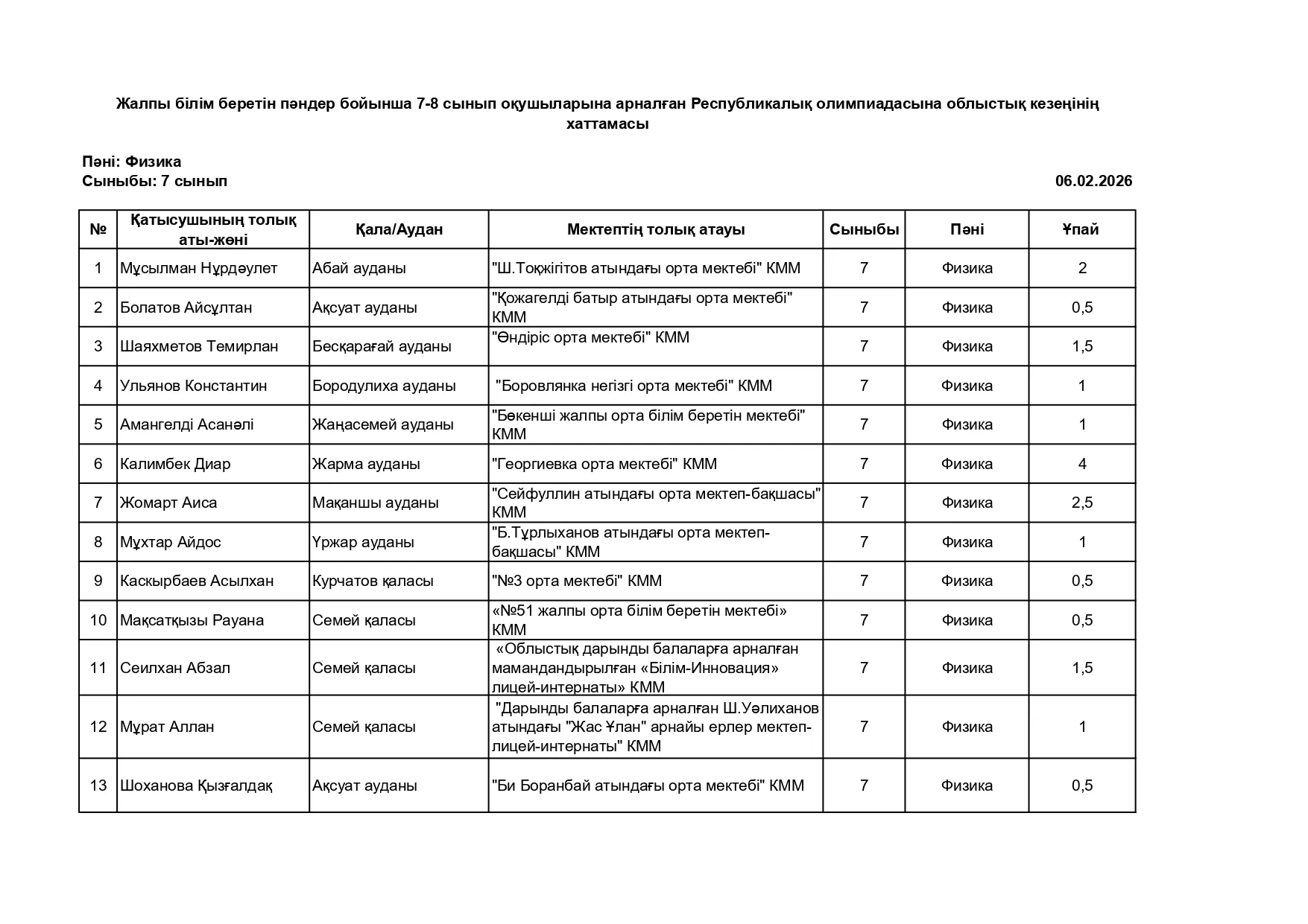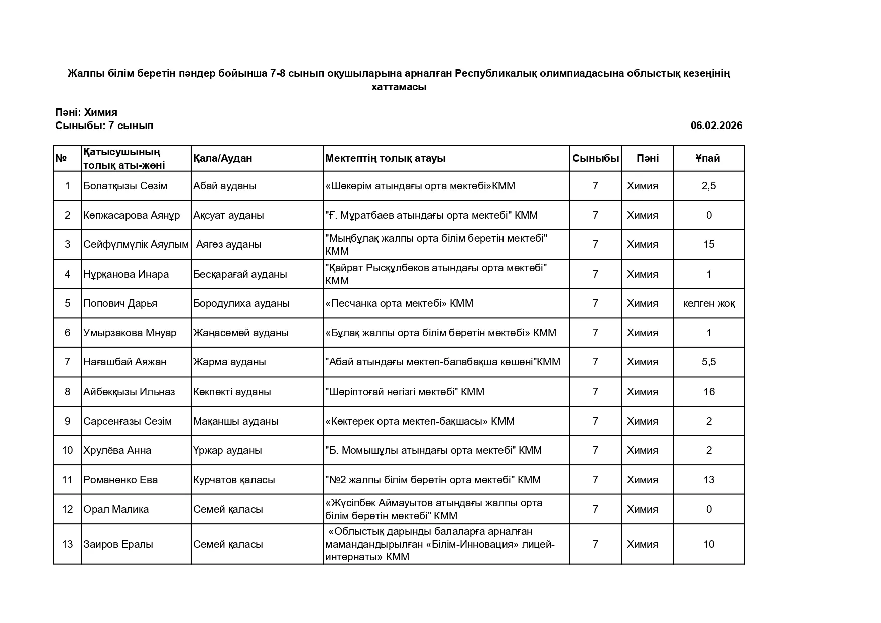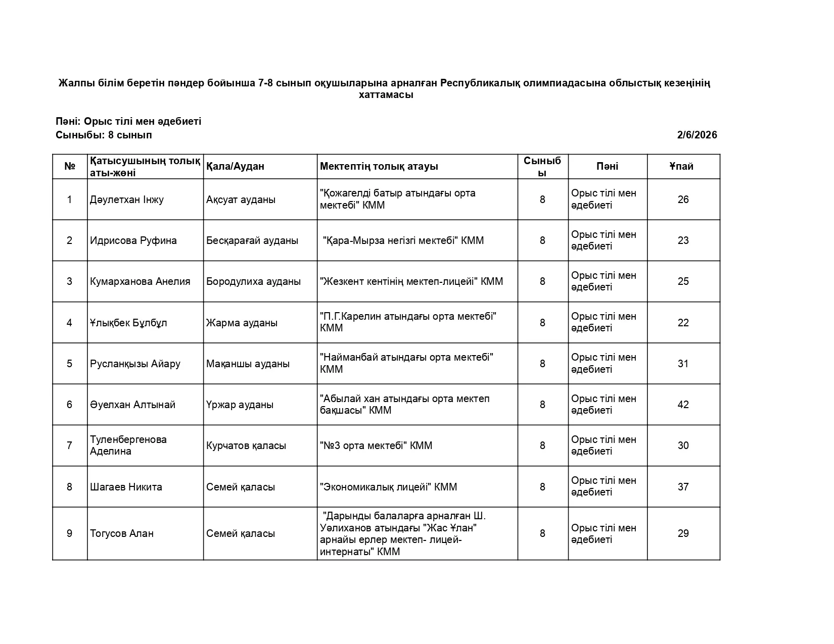 Жалпы білім беретін пәндер бойынша 7-8 сынып оқушыларына арналған республикалық олимпиаданың облыстық кезеңінің хаттамасы Дарын Орталығы 06.02.2026