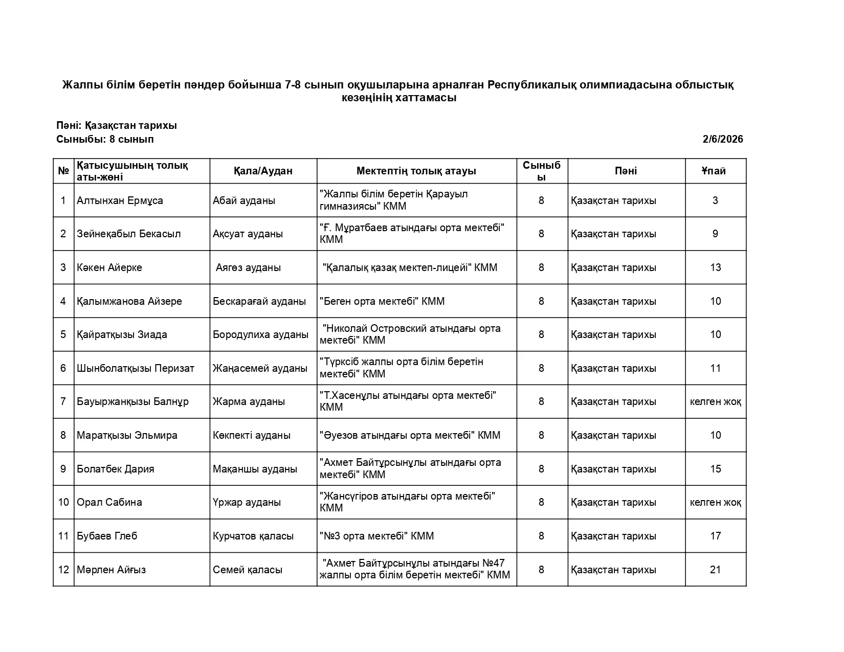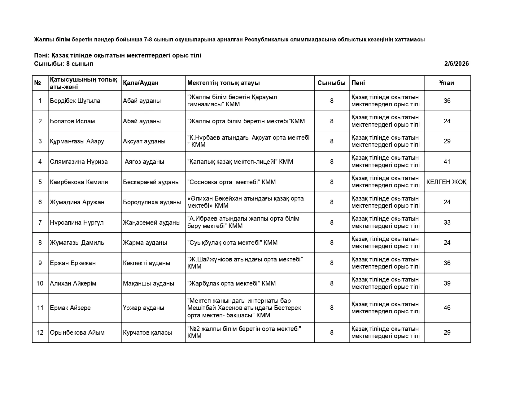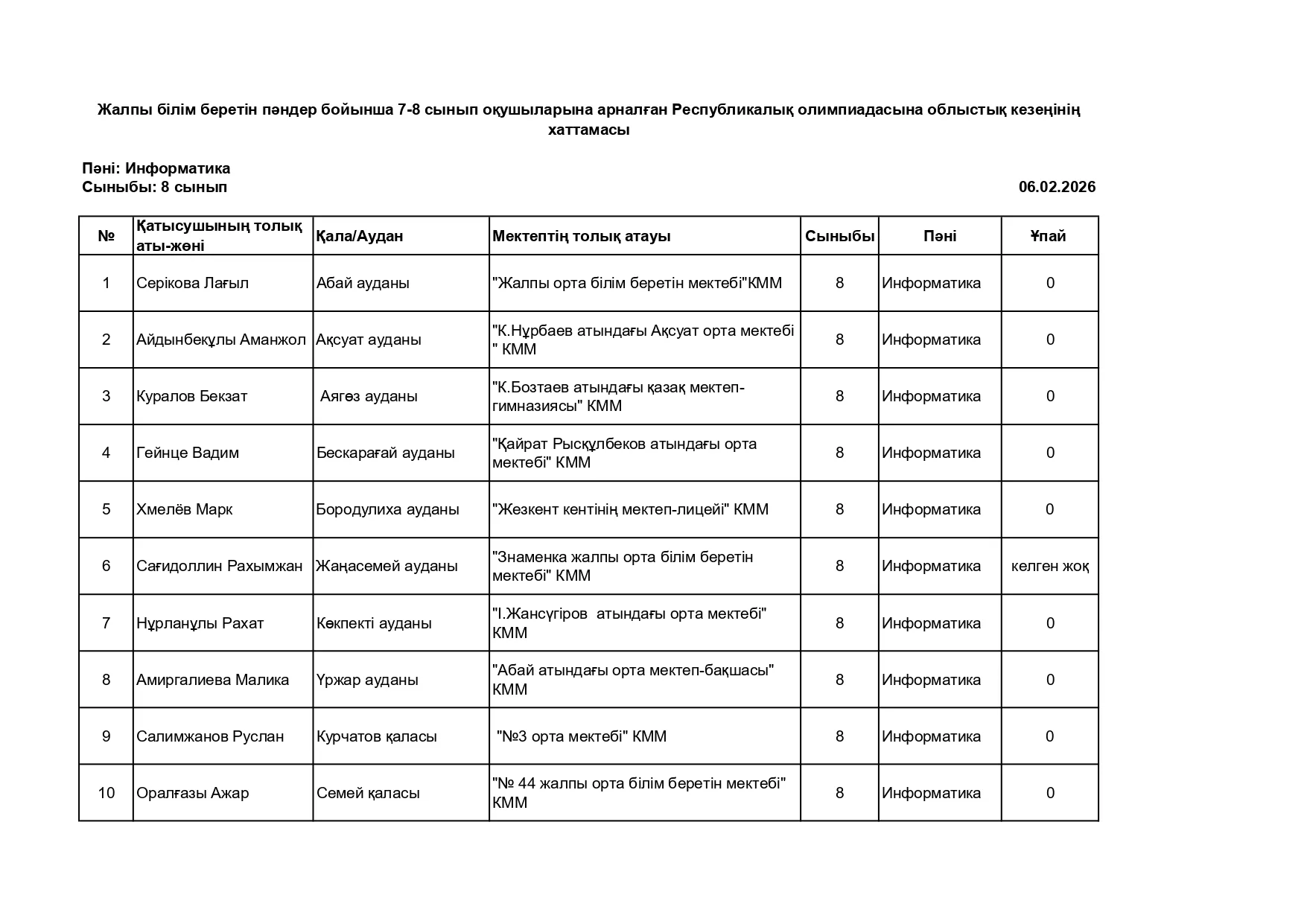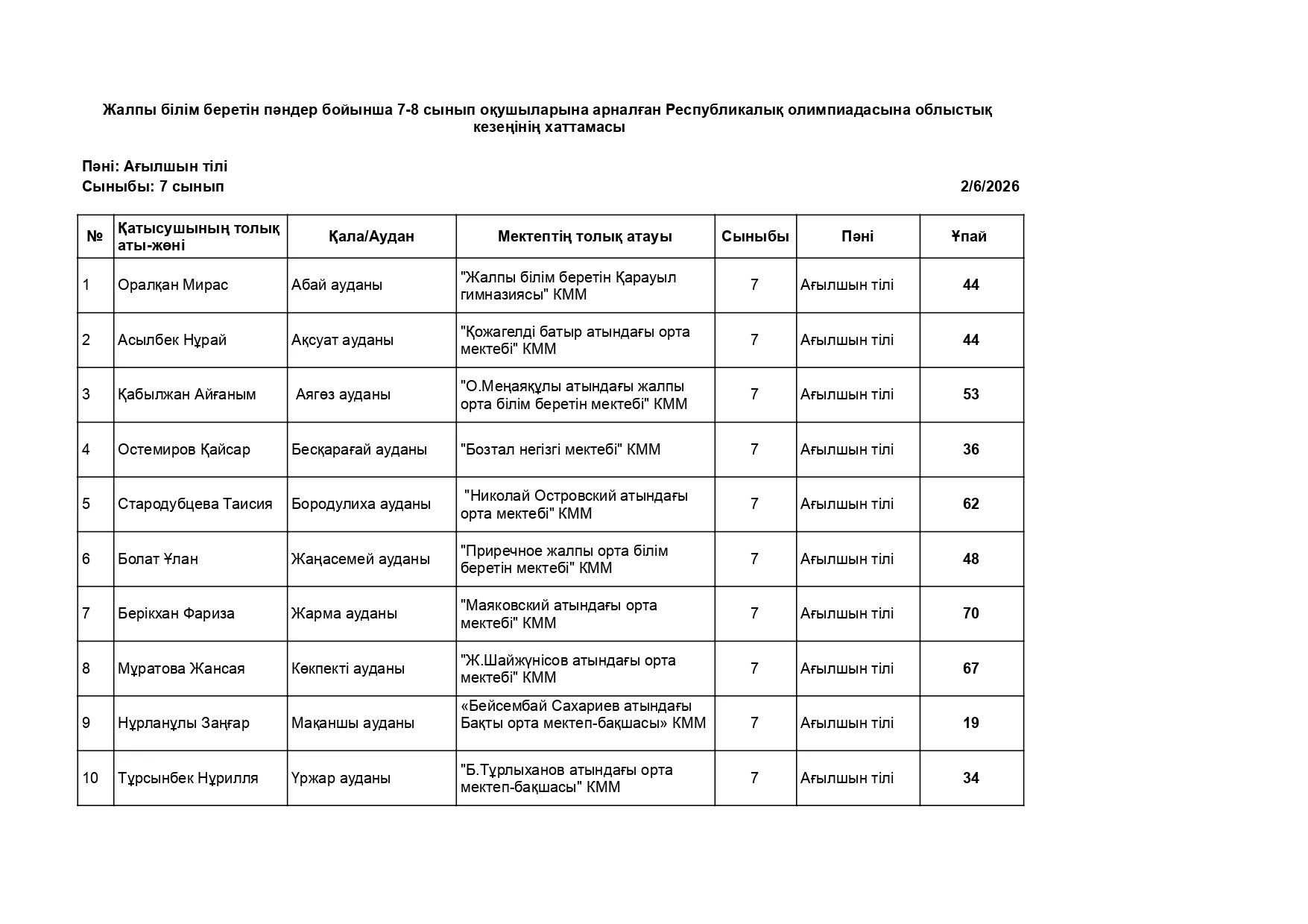 Жалпы білім беретін пәндер бойынша 7-8 сынып оқушыларына арналған республикалық олимпиаданың облыстық кезеңінің хаттамасы Дарын Орталығы 06.02.2026
