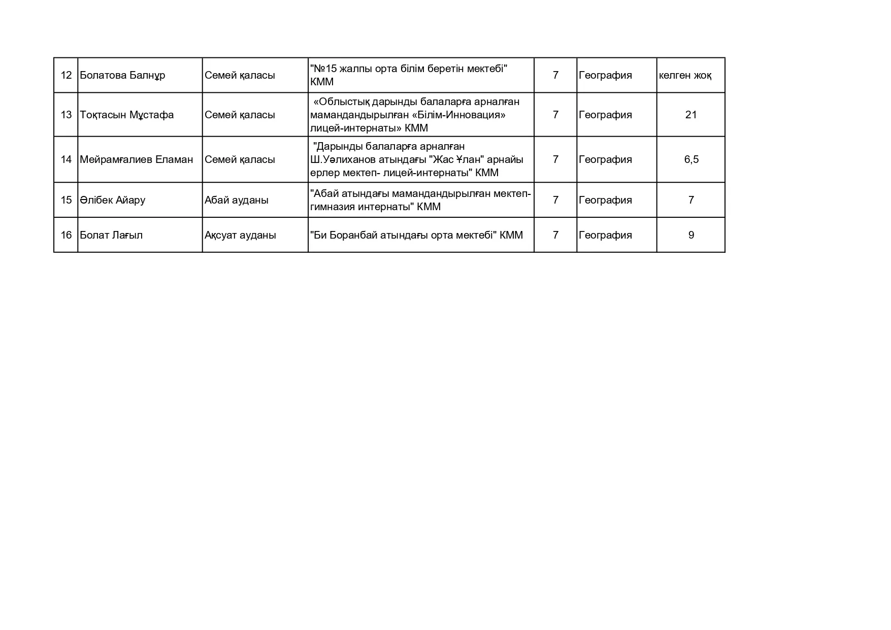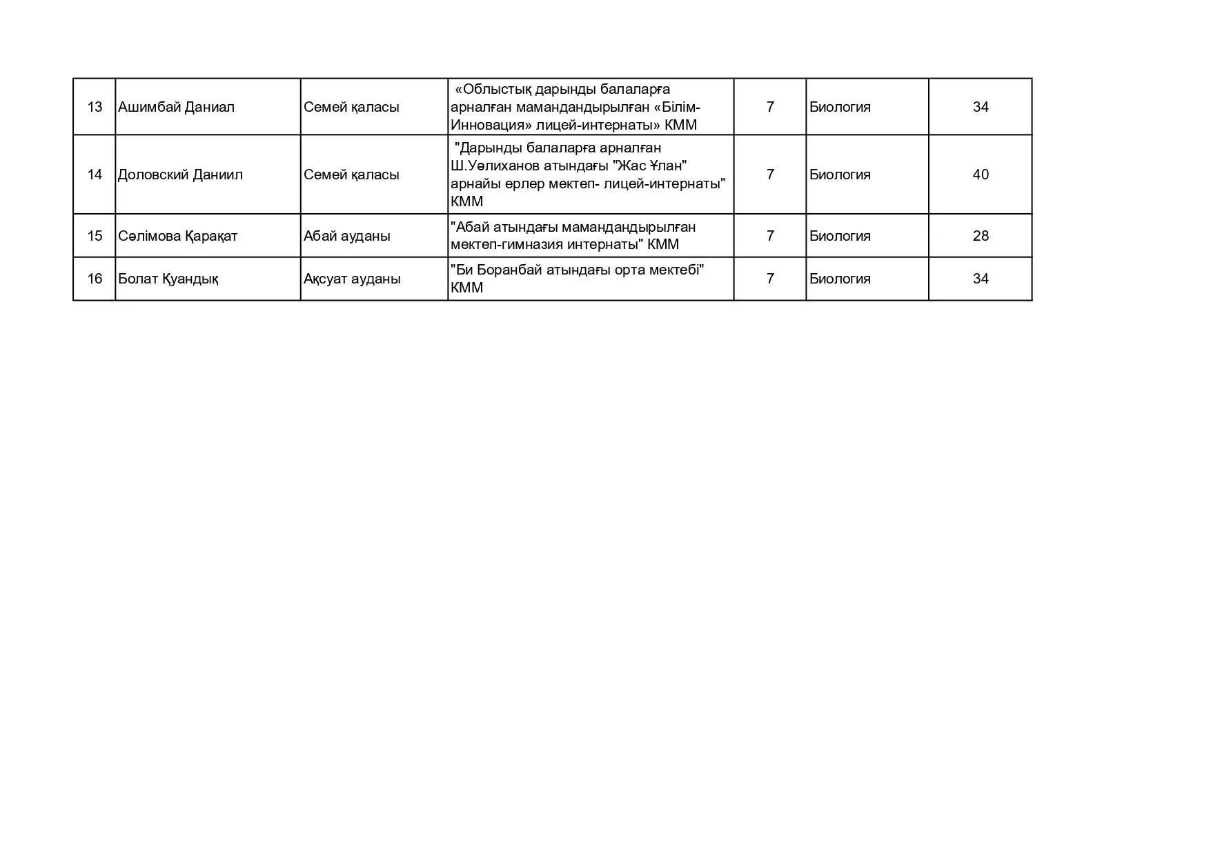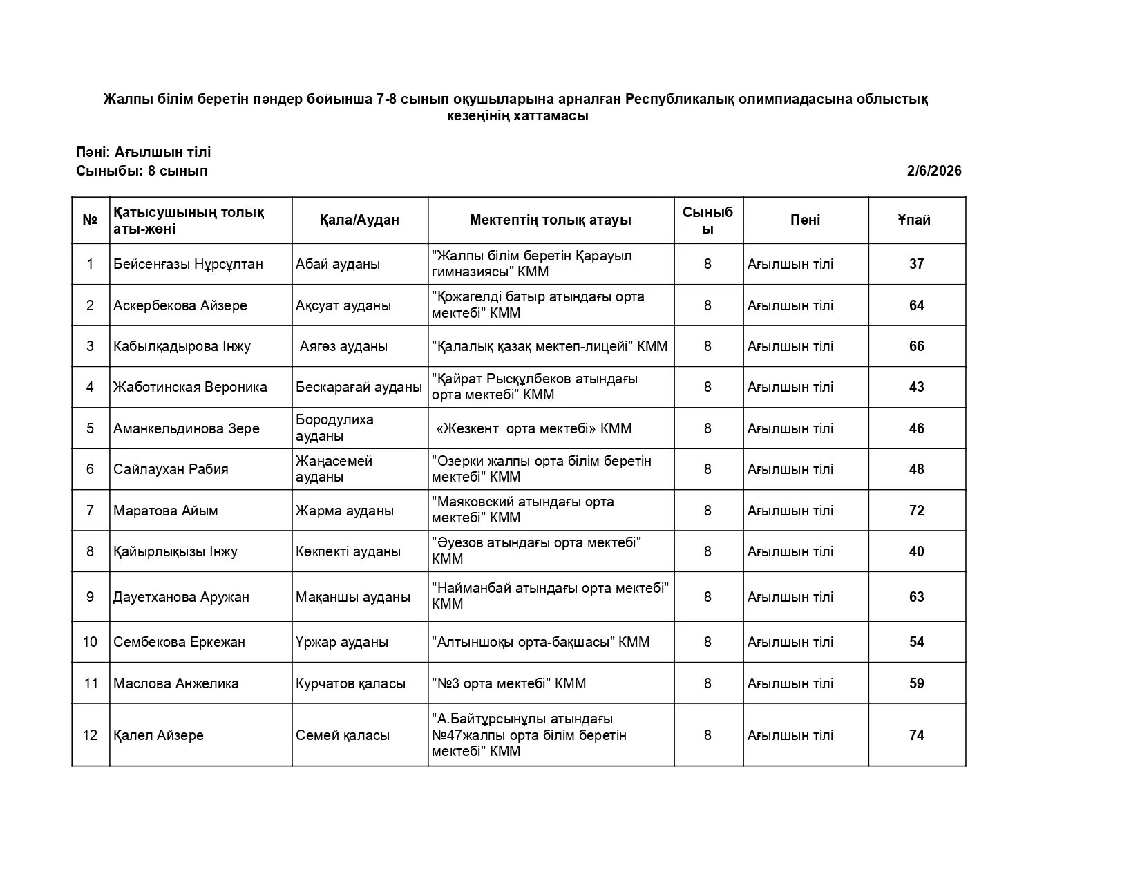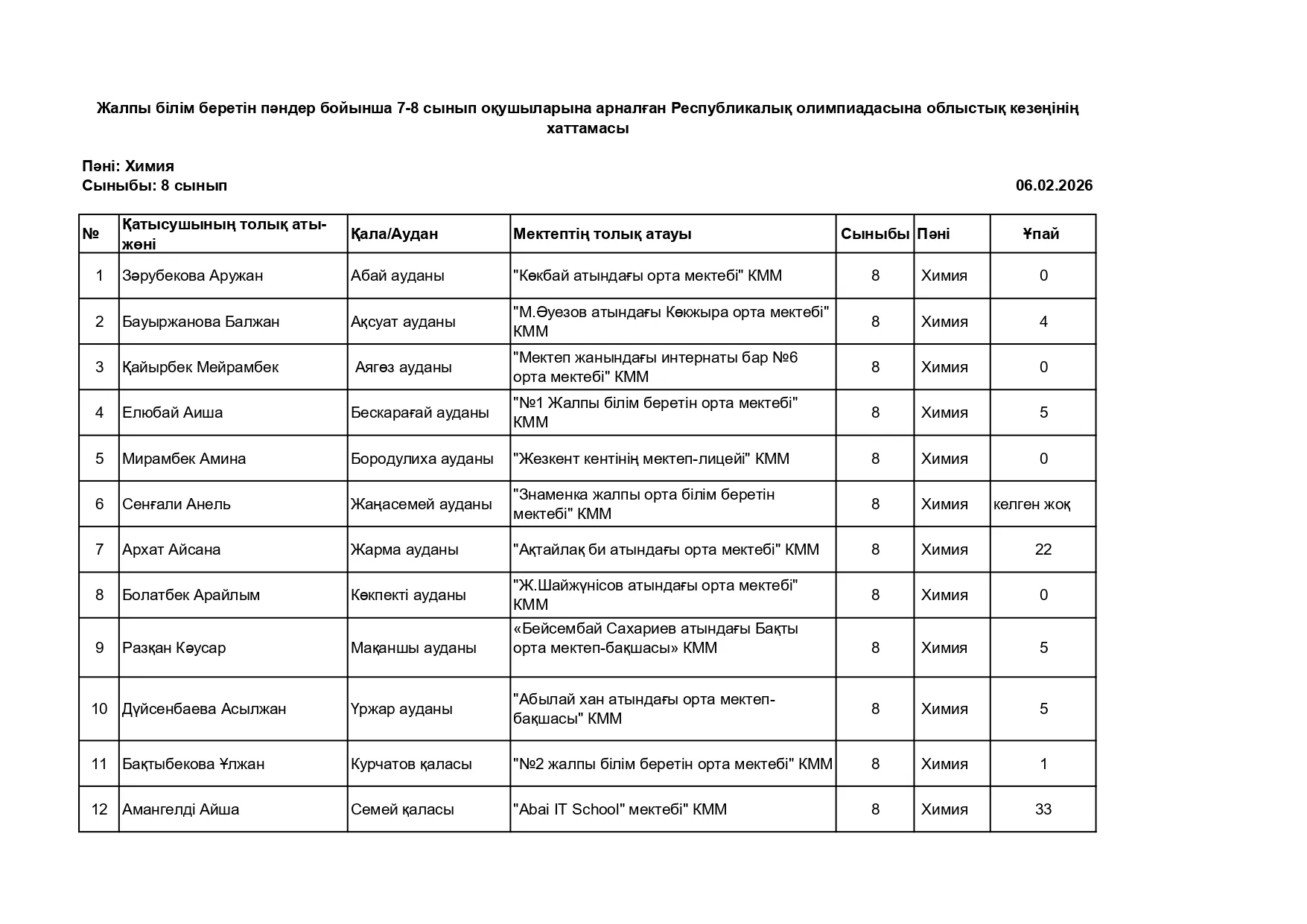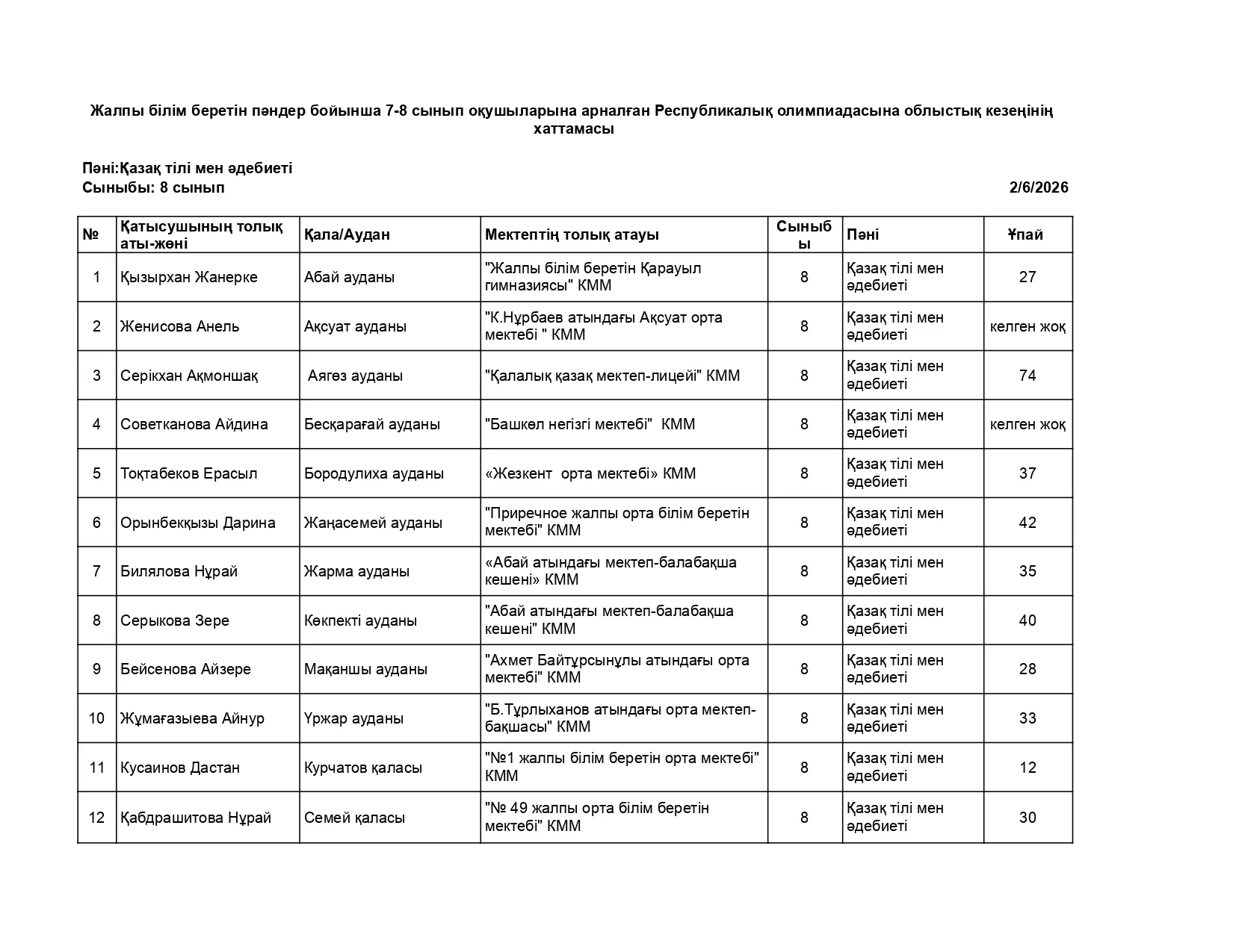 Жалпы білім беретін пәндер бойынша 7-8 сынып оқушыларына арналған республикалық олимпиаданың облыстық кезеңінің хаттамасы Дарын Орталығы 06.02.2026