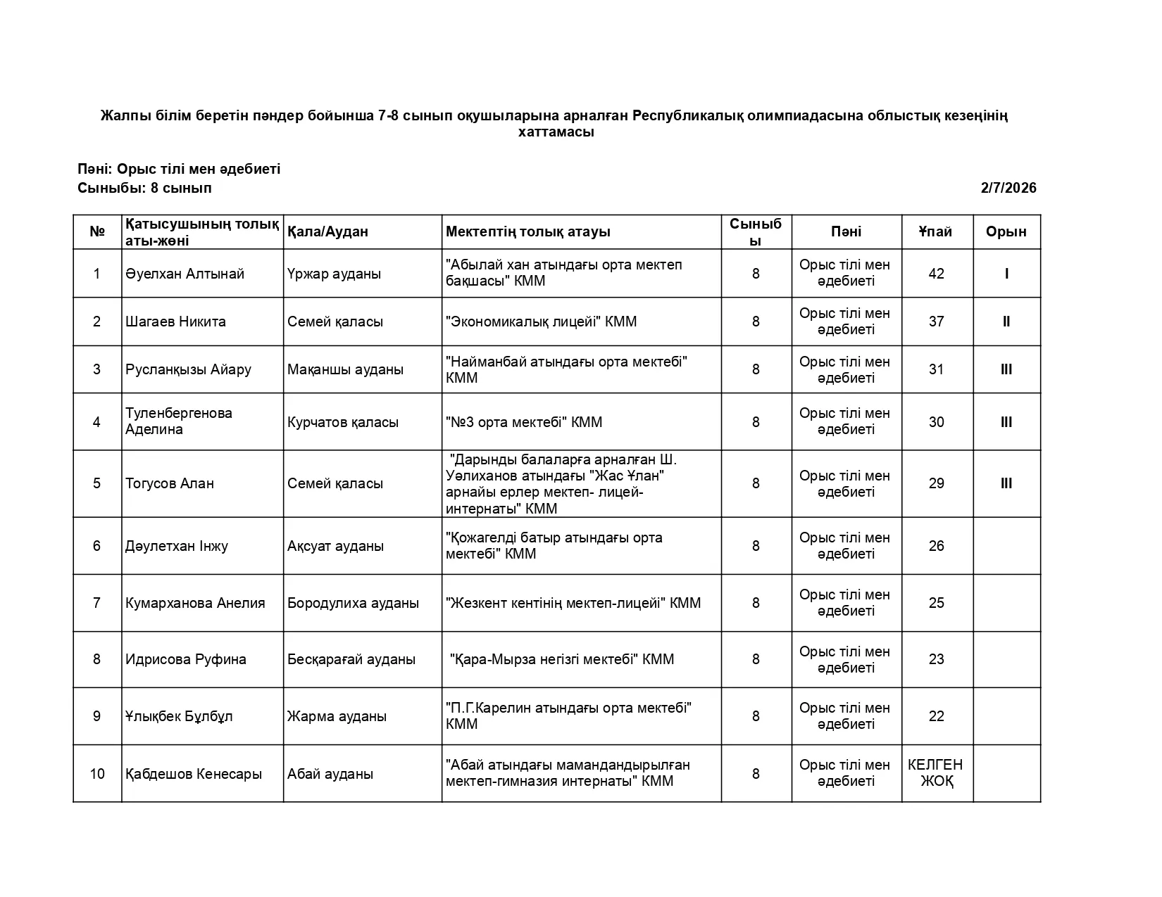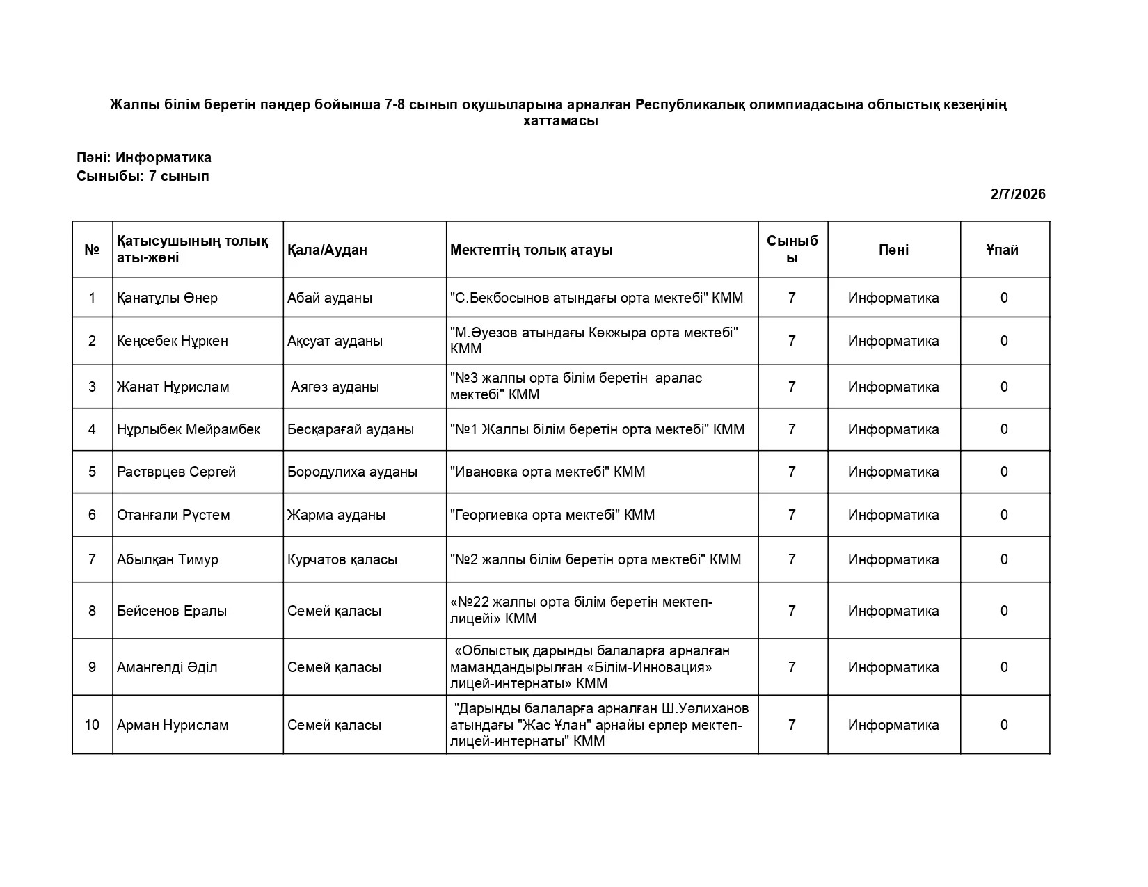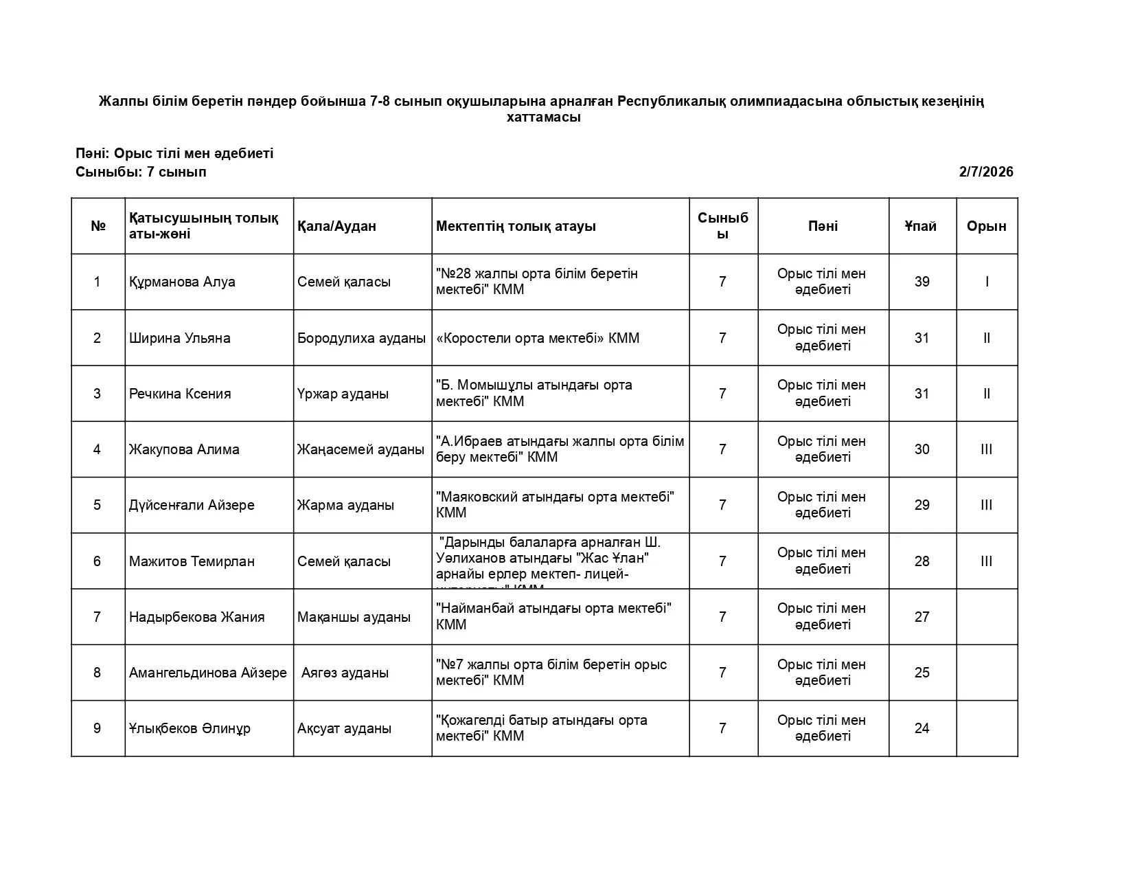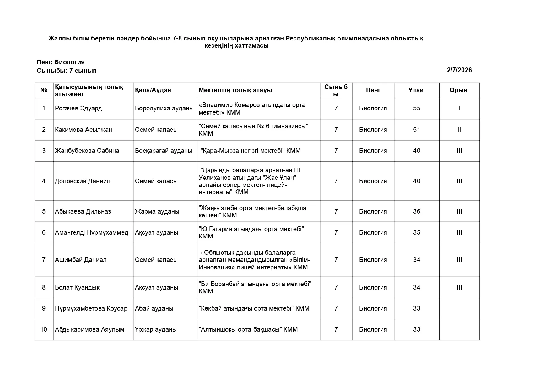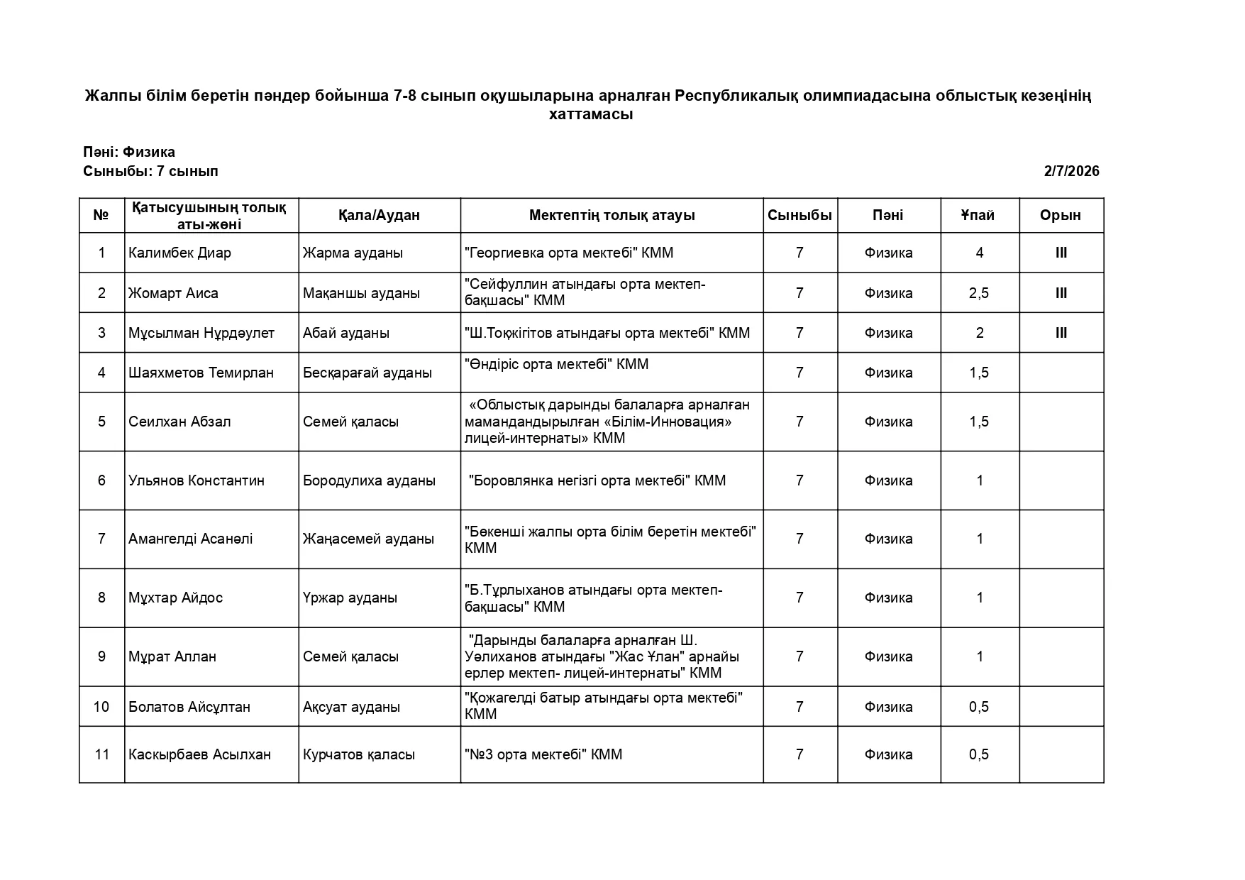 Жалпы білім беретін пәндер бойынша 7-8 сынып оқушыларына арналған республикалық олимпиаданың облыстық кезеңінің қорытынды хаттамасы Дарын Орталығы 07.02.2026