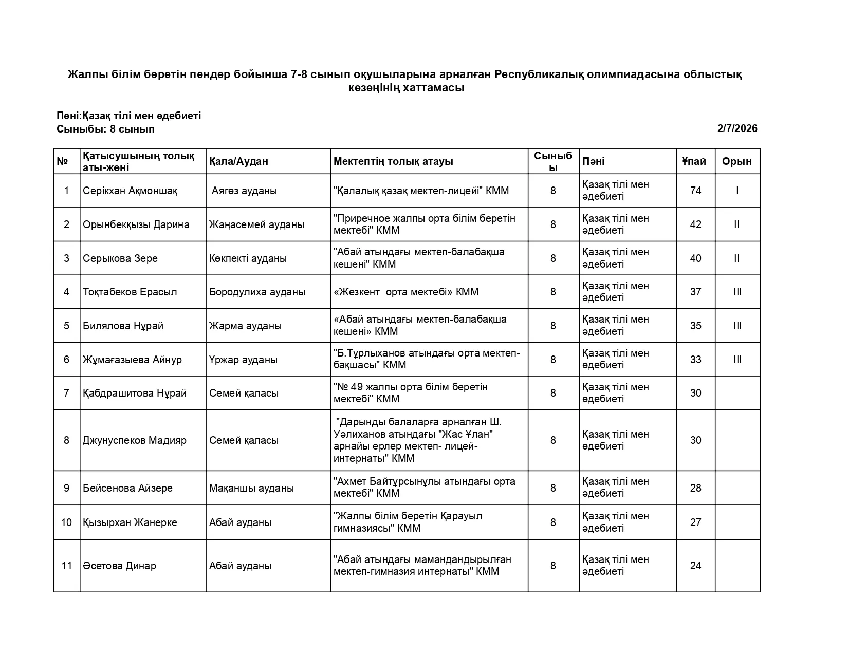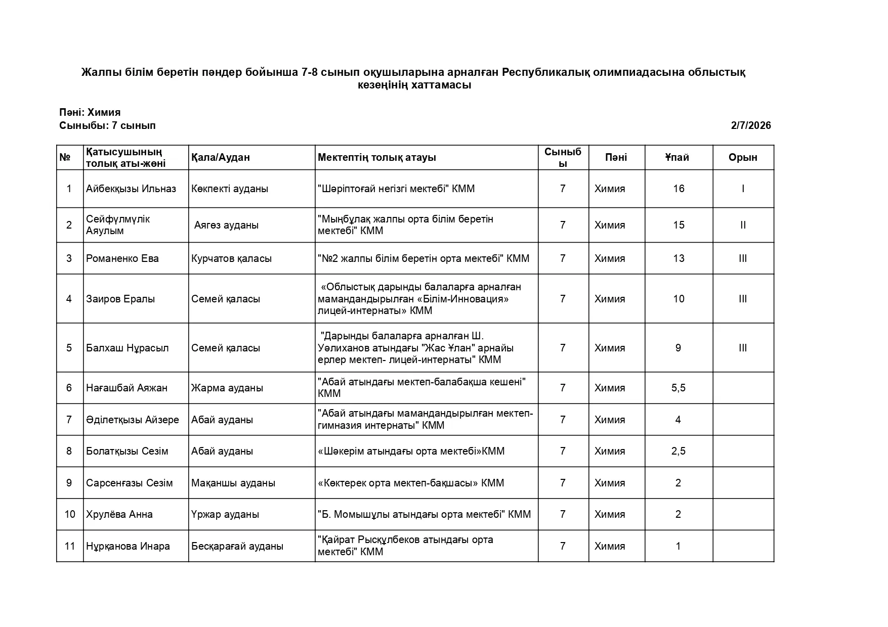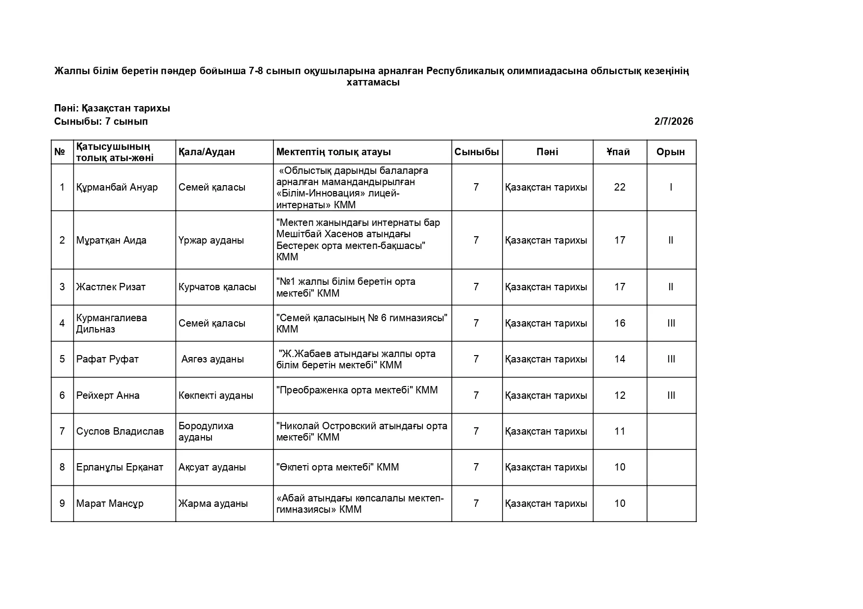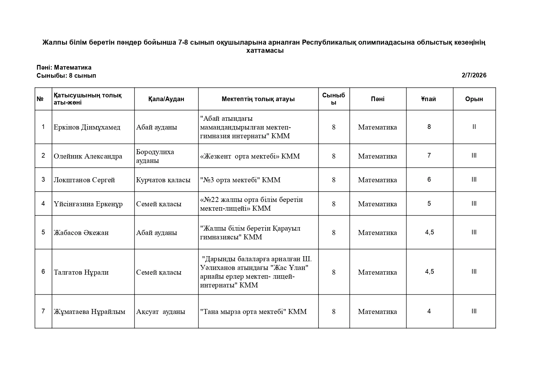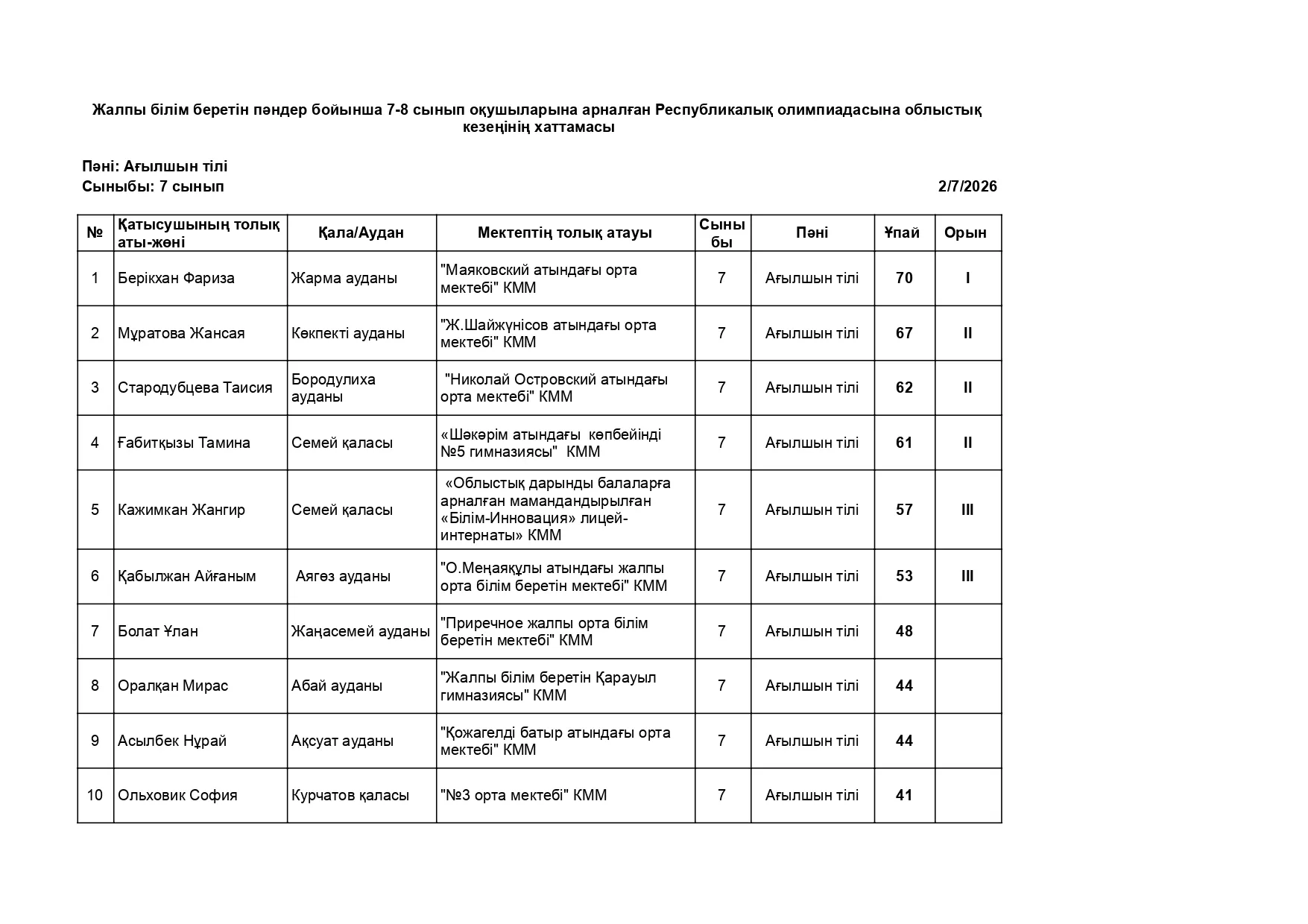 Жалпы білім беретін пәндер бойынша 7-8 сынып оқушыларына арналған республикалық олимпиаданың облыстық кезеңінің қорытынды хаттамасы Дарын Орталығы 07.02.2026