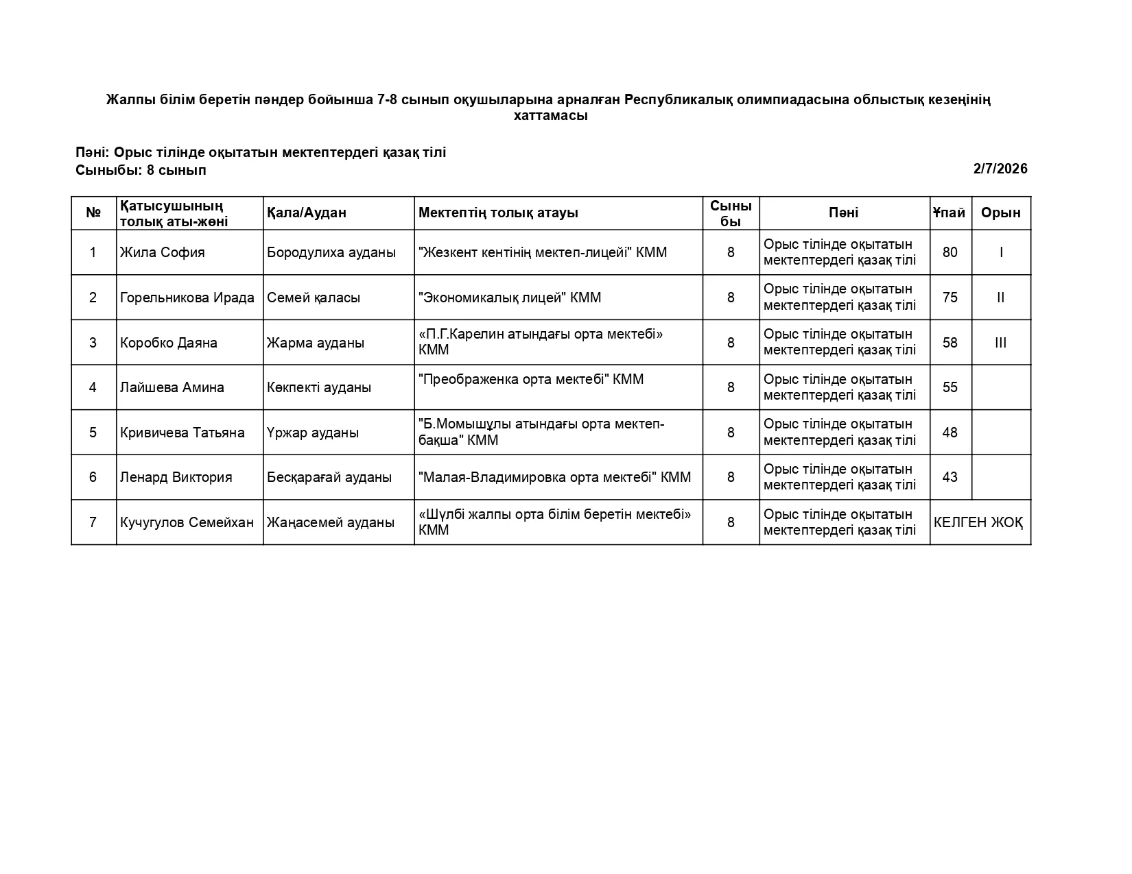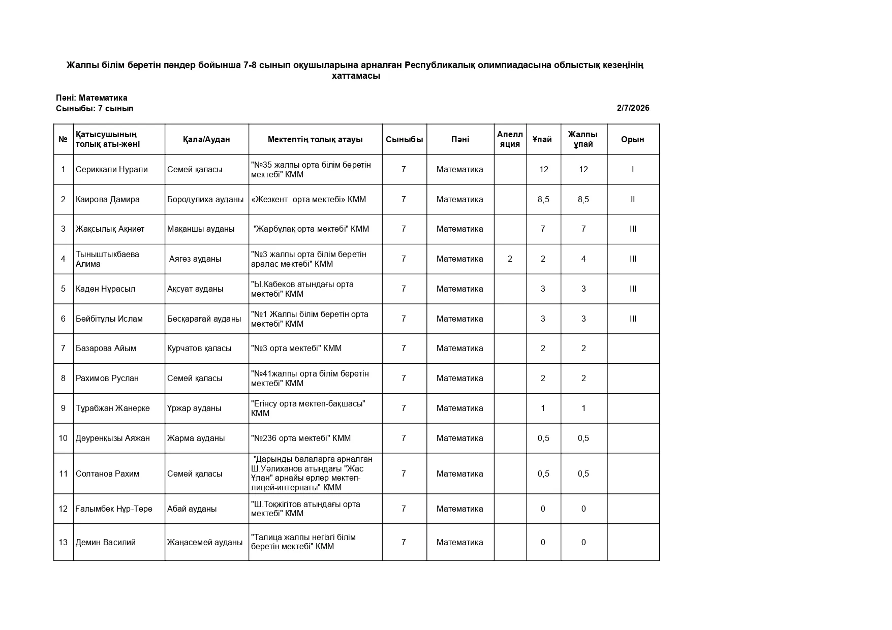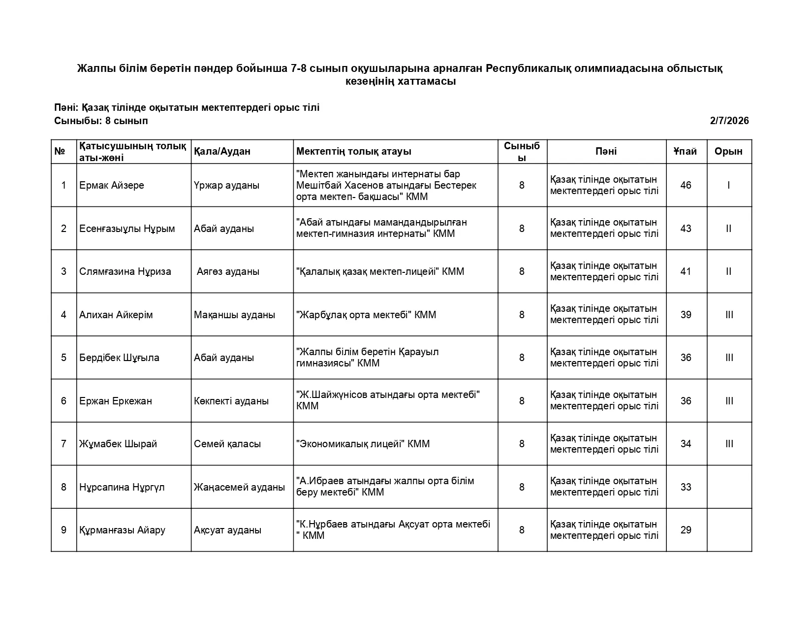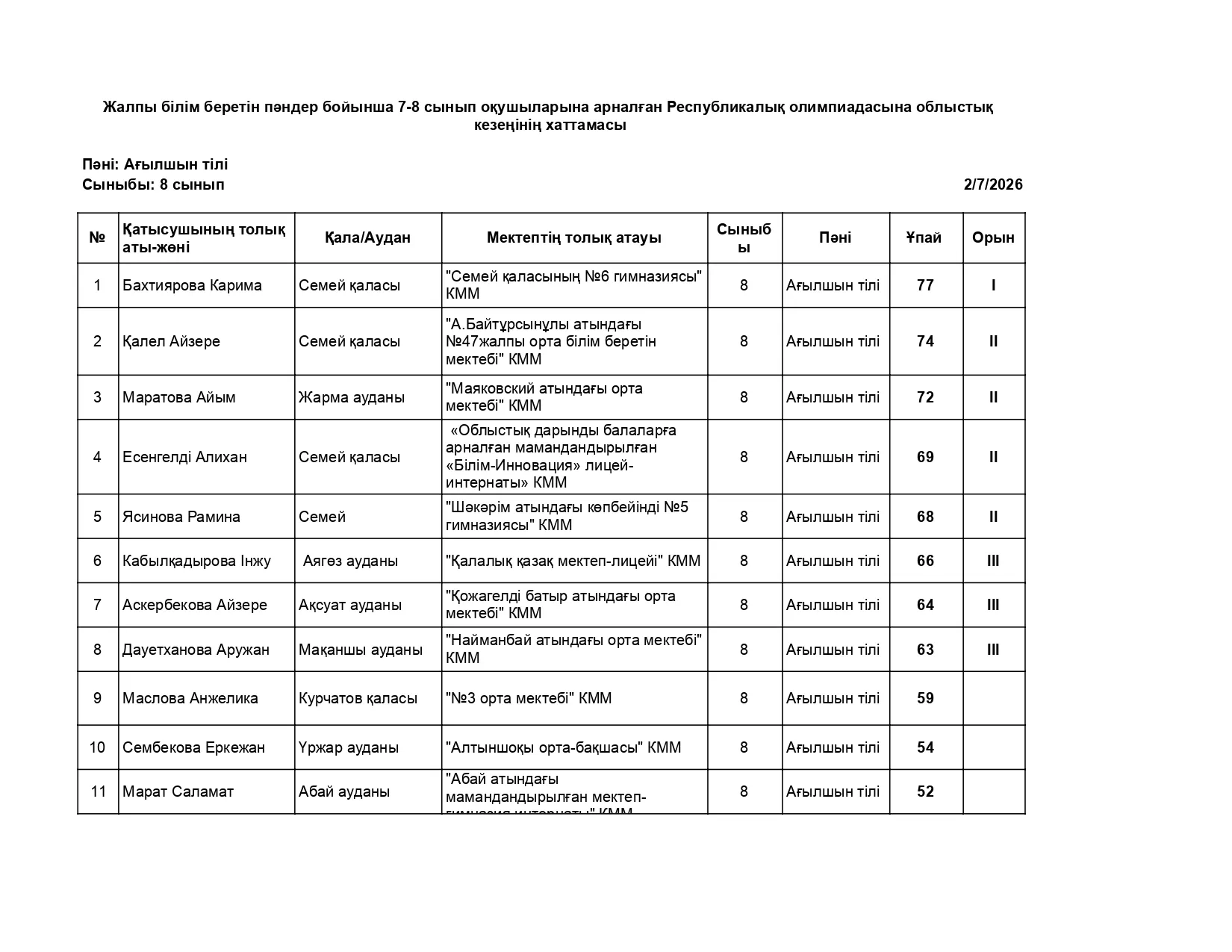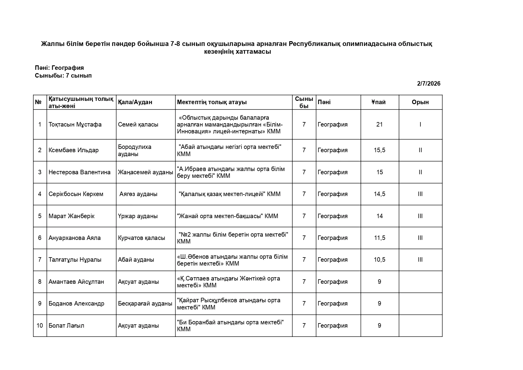 Жалпы білім беретін пәндер бойынша 7-8 сынып оқушыларына арналған республикалық олимпиаданың облыстық кезеңінің қорытынды хаттамасы Дарын Орталығы 07.02.2026