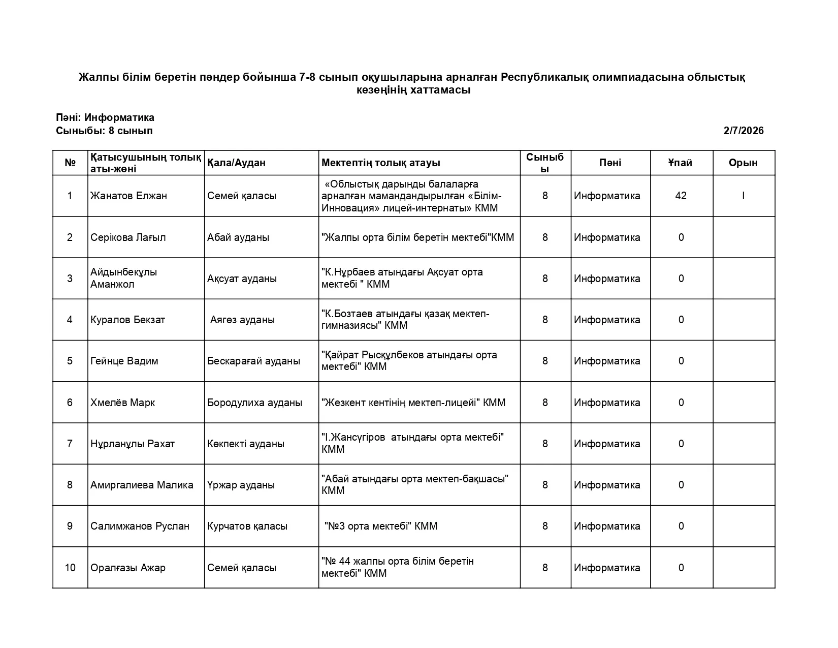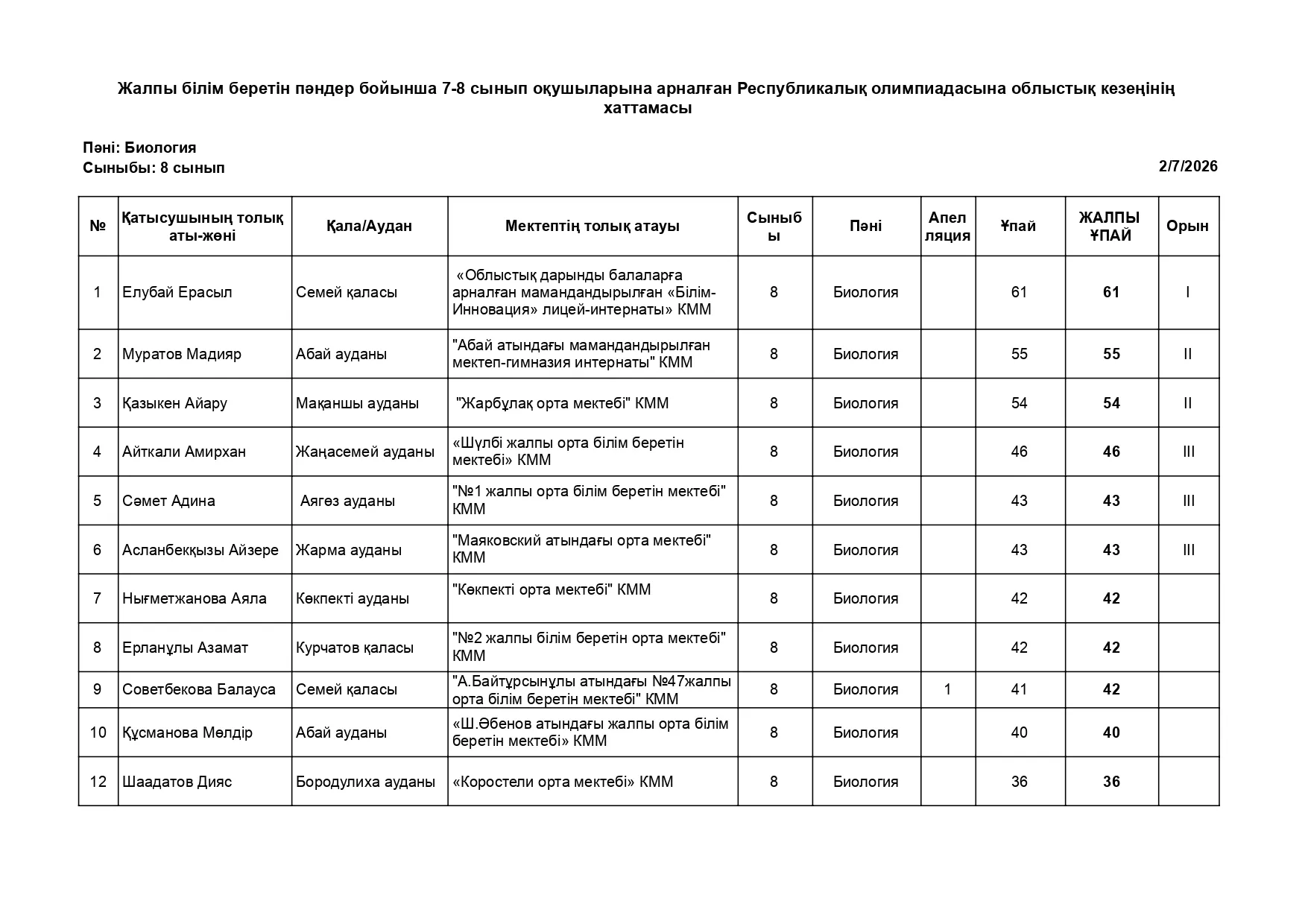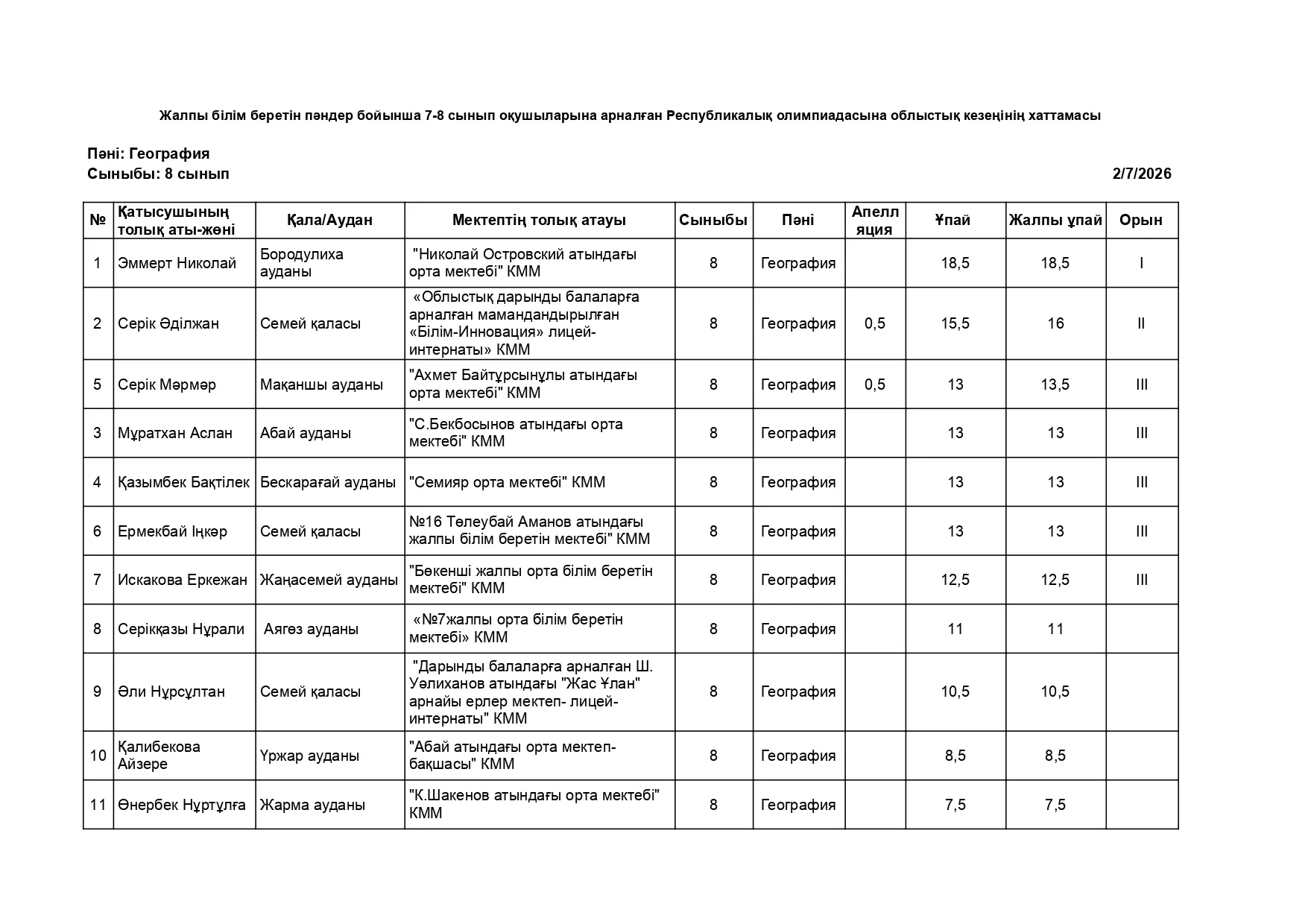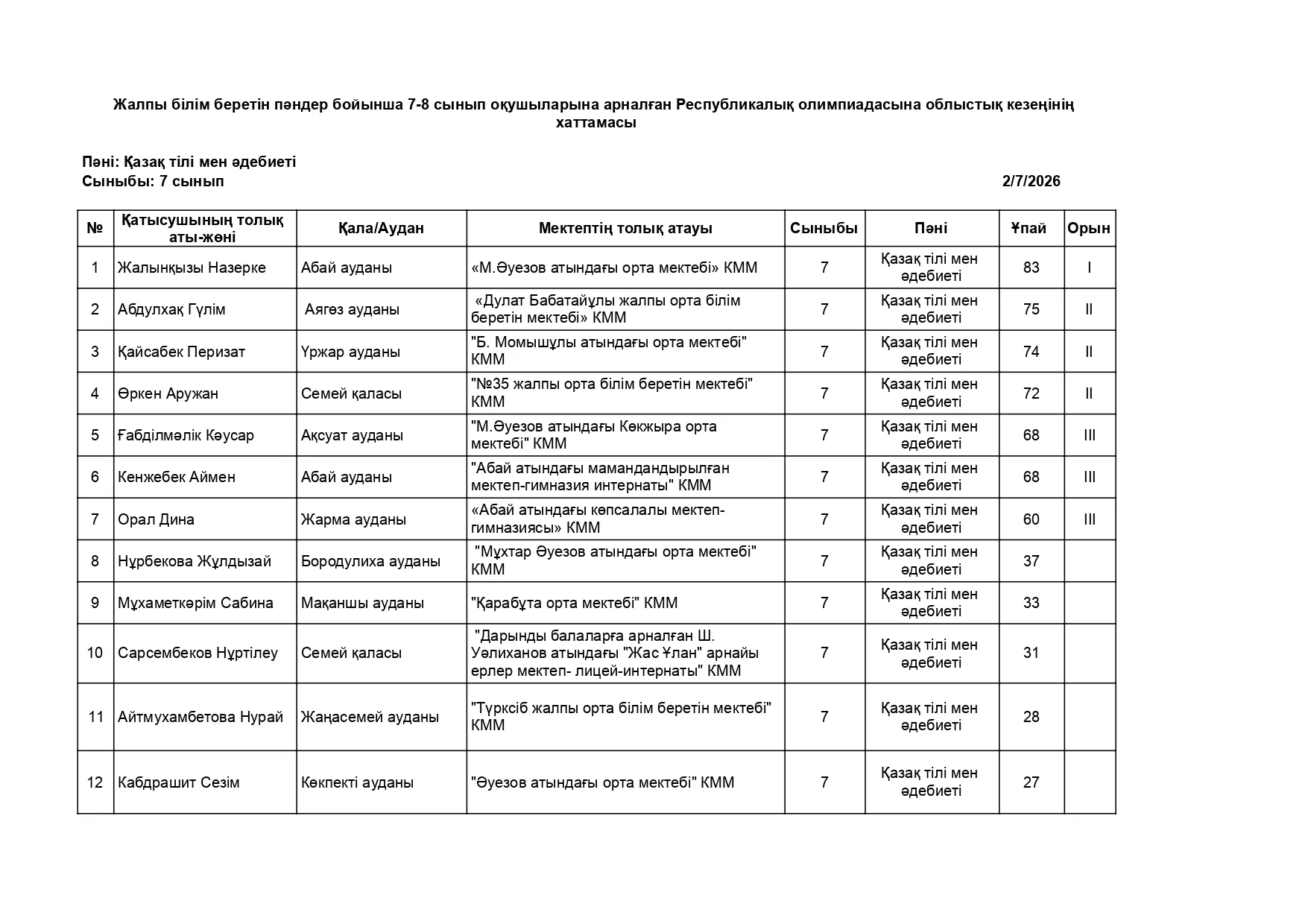 Жалпы білім беретін пәндер бойынша 7-8 сынып оқушыларына арналған республикалық олимпиаданың облыстық кезеңінің қорытынды хаттамасы Дарын Орталығы 07.02.2026