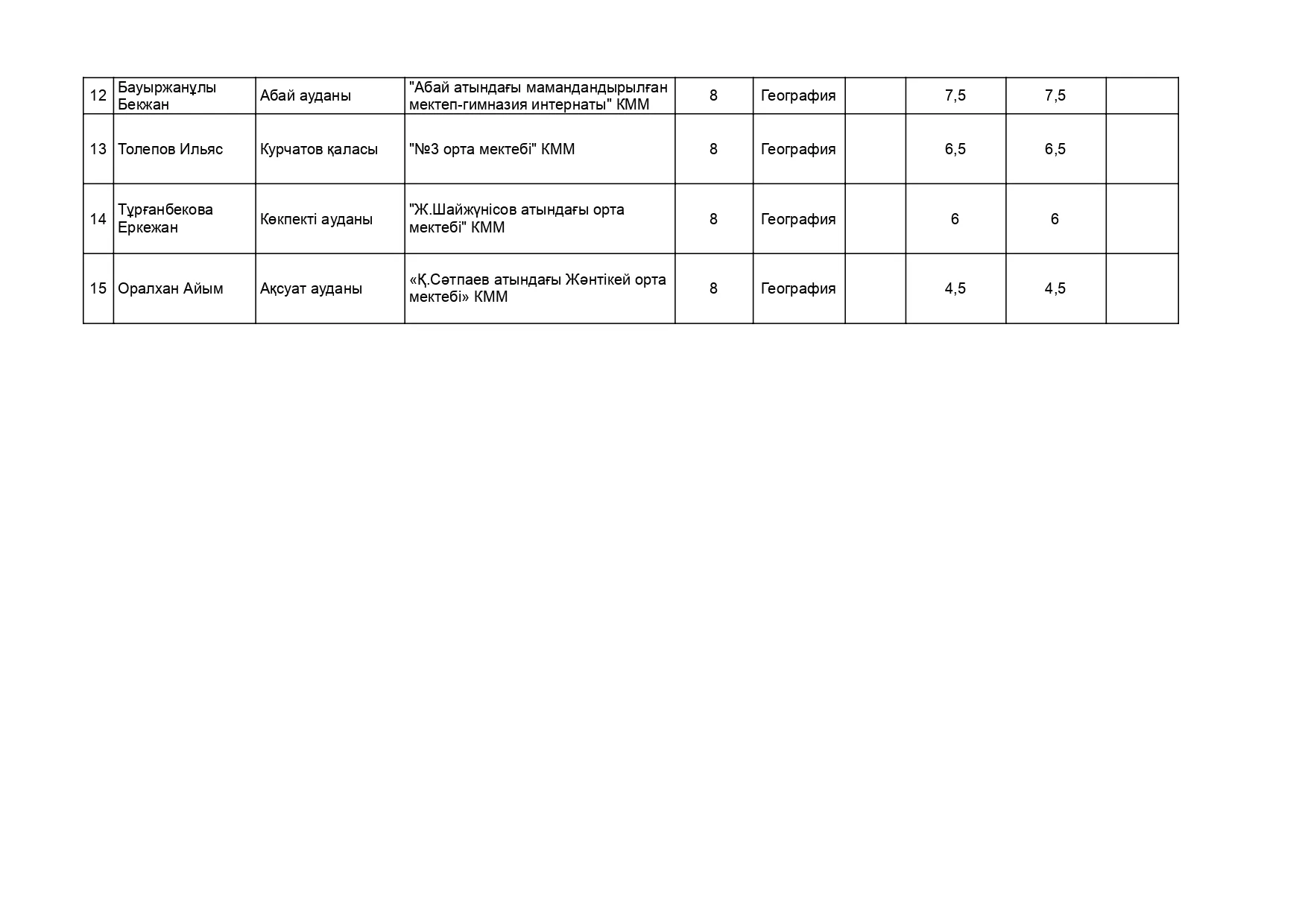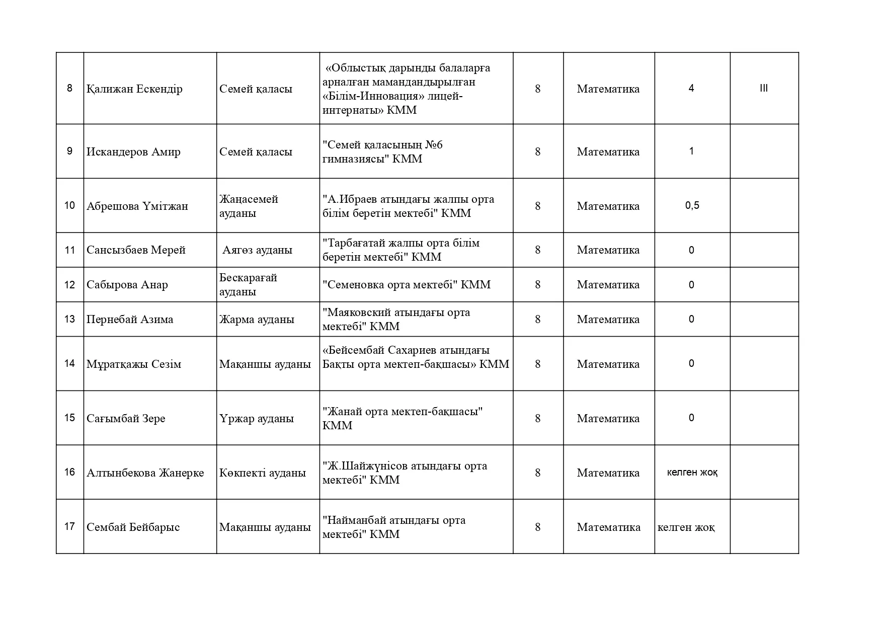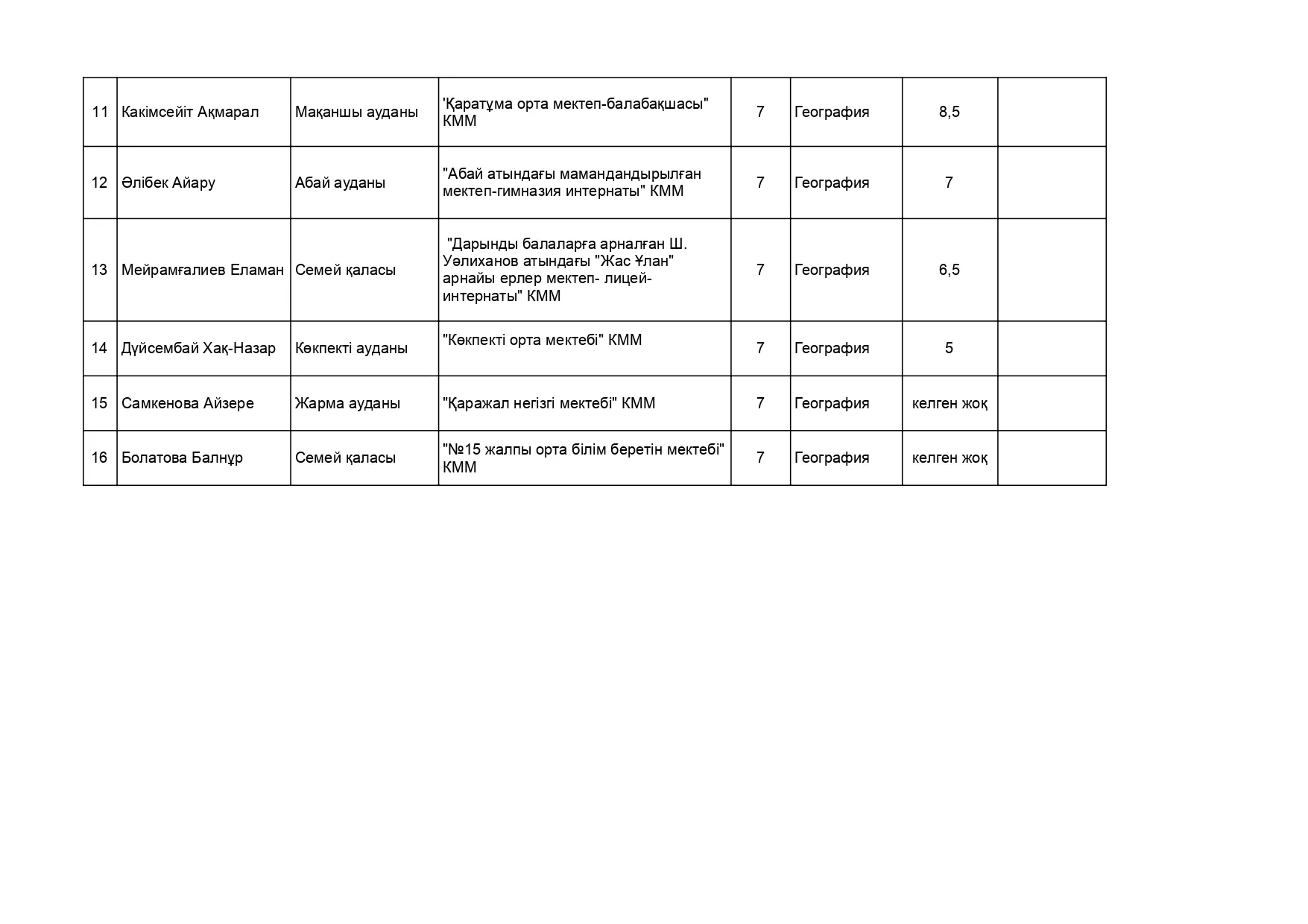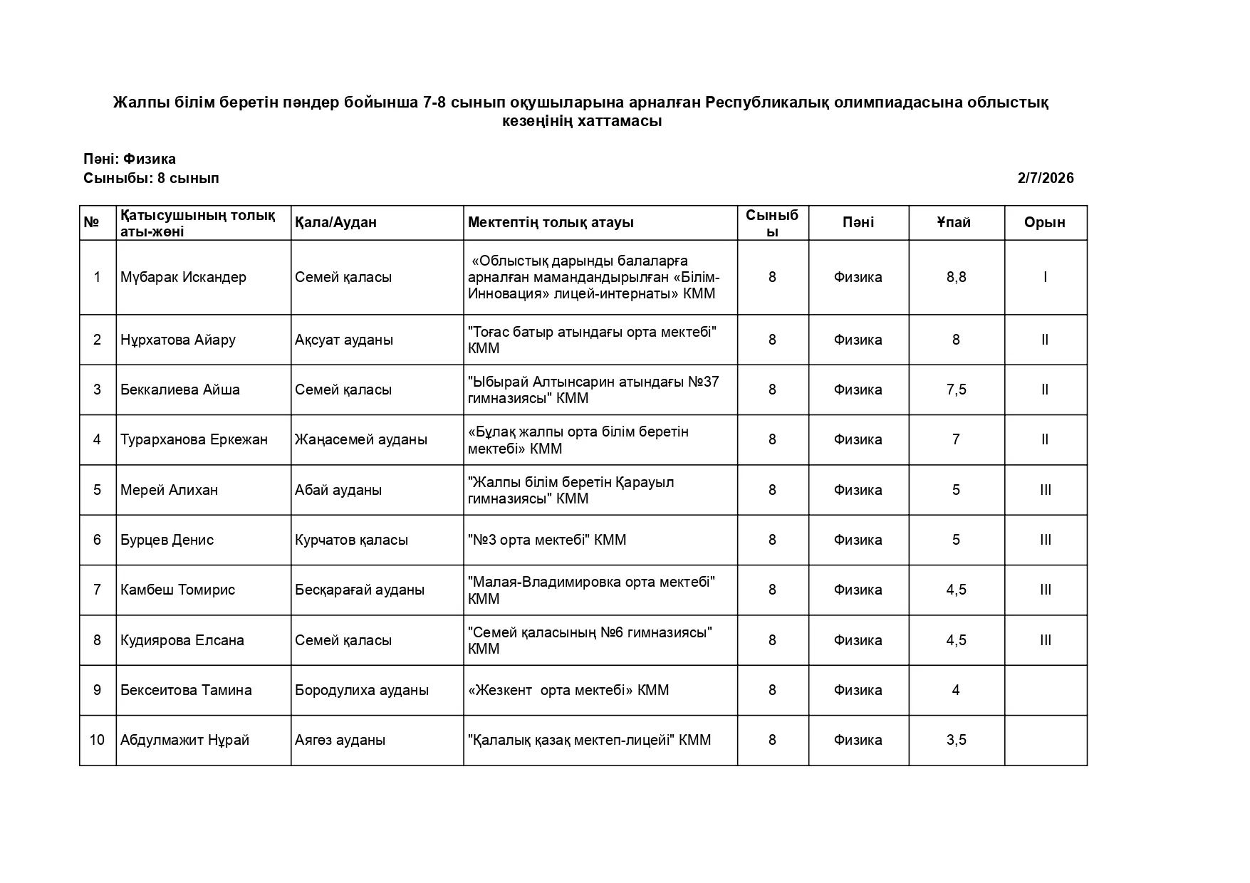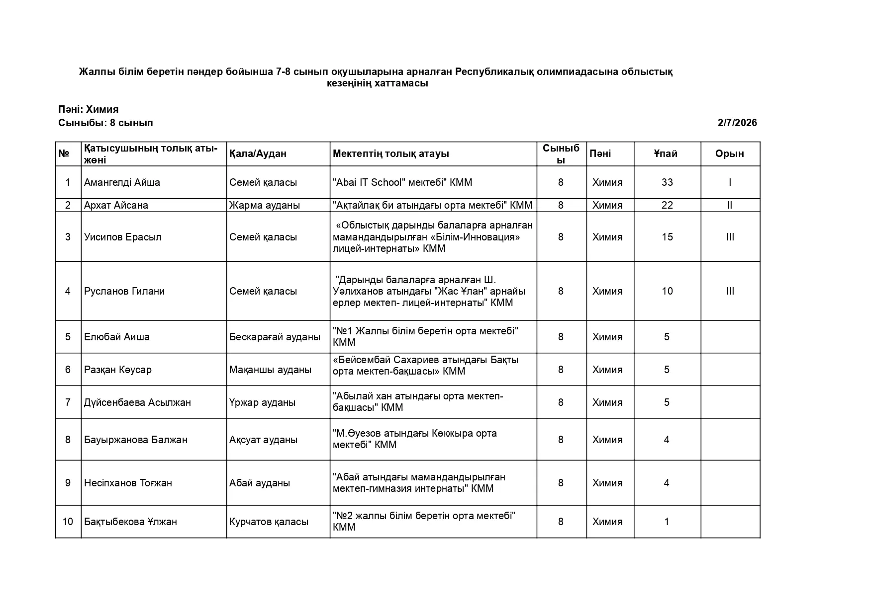 Жалпы білім беретін пәндер бойынша 7-8 сынып оқушыларына арналған республикалық олимпиаданың облыстық кезеңінің қорытынды хаттамасы Дарын Орталығы 07.02.2026