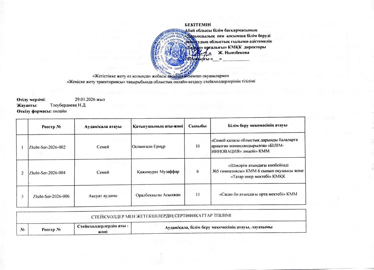 «Жетістікке жету өз қолыңда» жобасы аясында дарынды оқушылармен «Жеңіске жету траекториясы» облыстық онлайн-кездесу хаттамасы Дарын Орталығы 09.02.2026