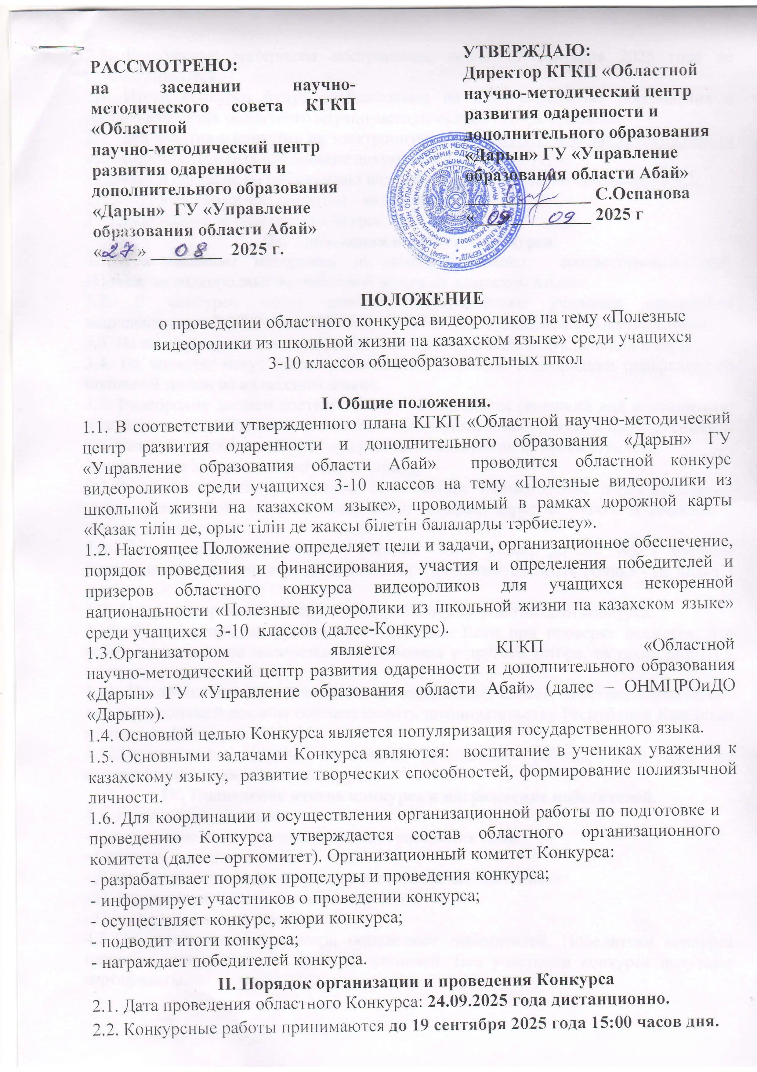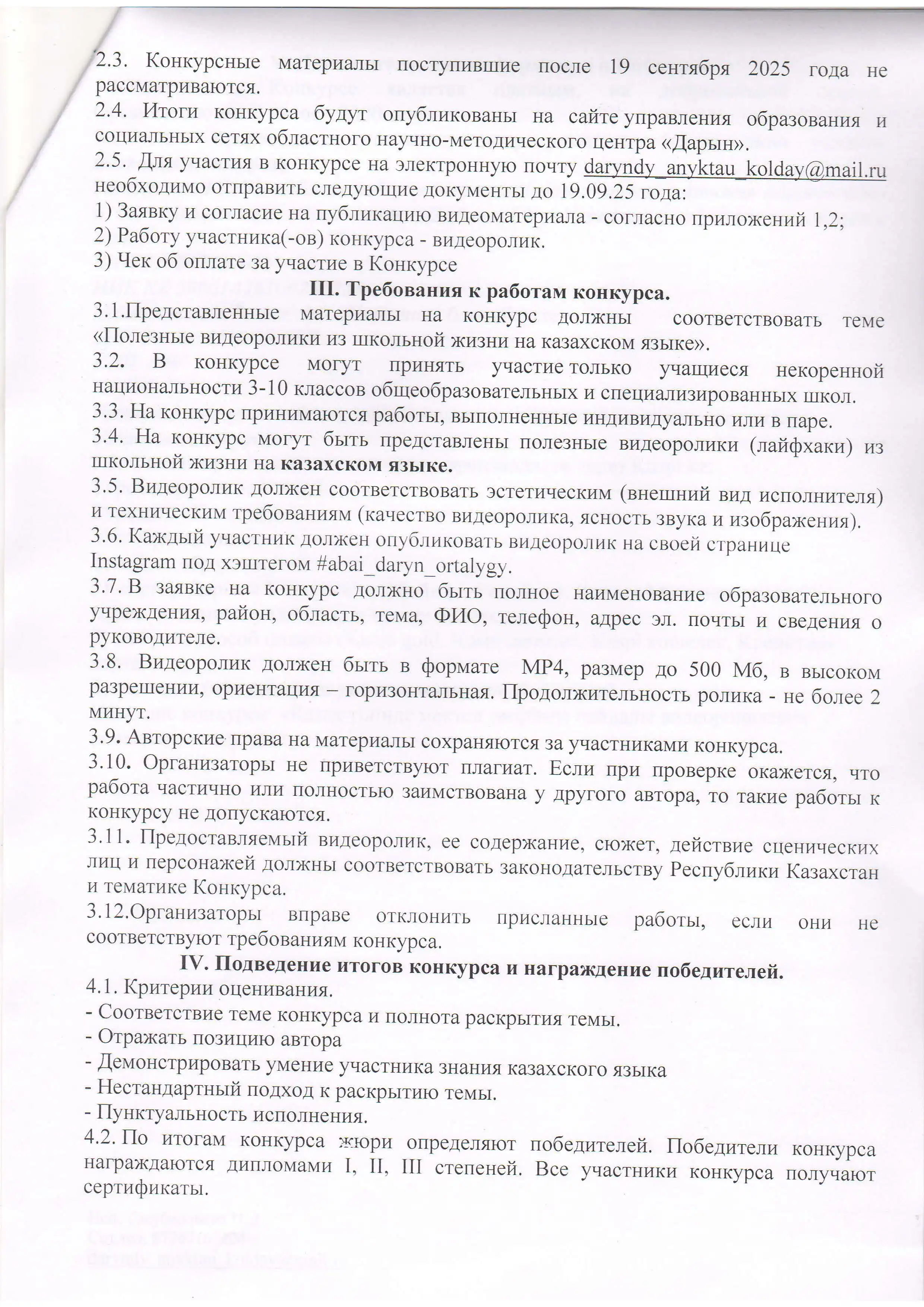 Жалпы білім беретін мектептердің 3-10 сынып оқушыларымен өтетін өзге ұлт оқушылары арасында "Қазақ тілінде мектеп өмірінен пайдалы видеороликтер" облыстық конкурсының ережесі Дарын Орталығы 10.09.2025