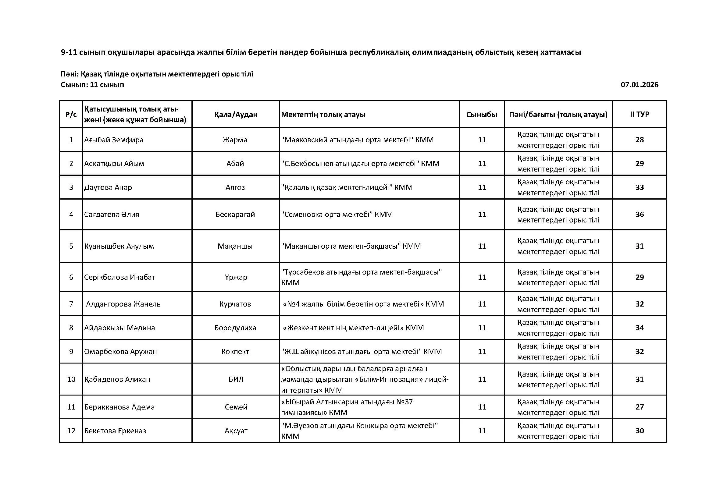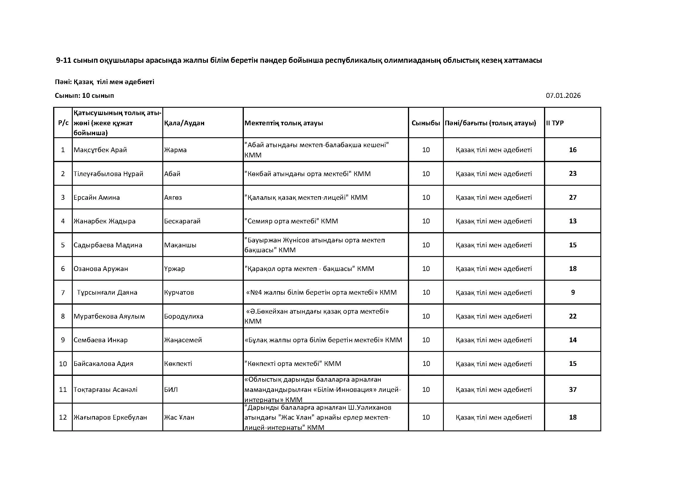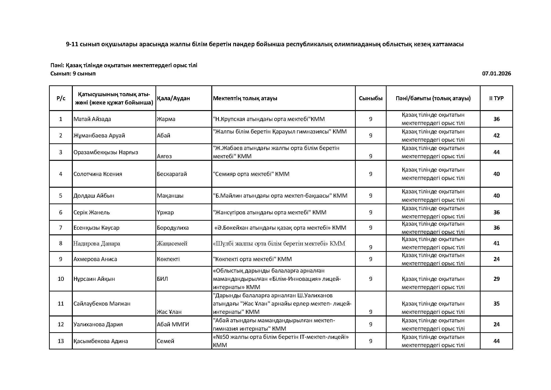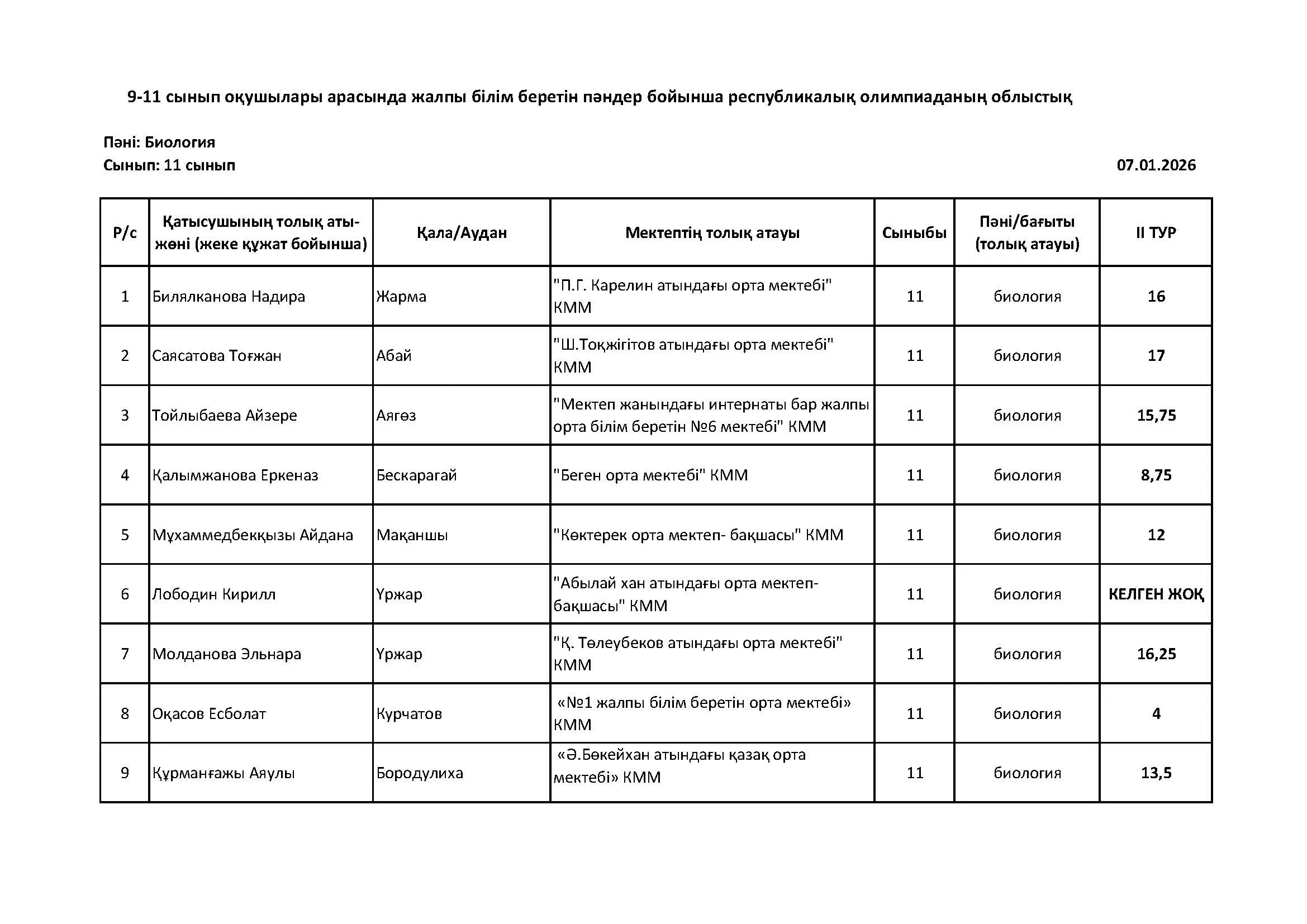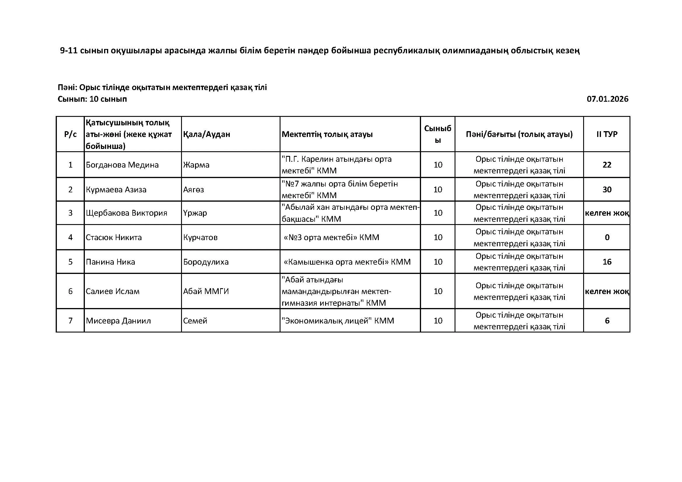 Жалпы білім беретін пәндер бойынша республикалық олимпиаданың облыстық кезеңінің қорытындысы (2 тур) Дарын Орталығы 07.01.2026