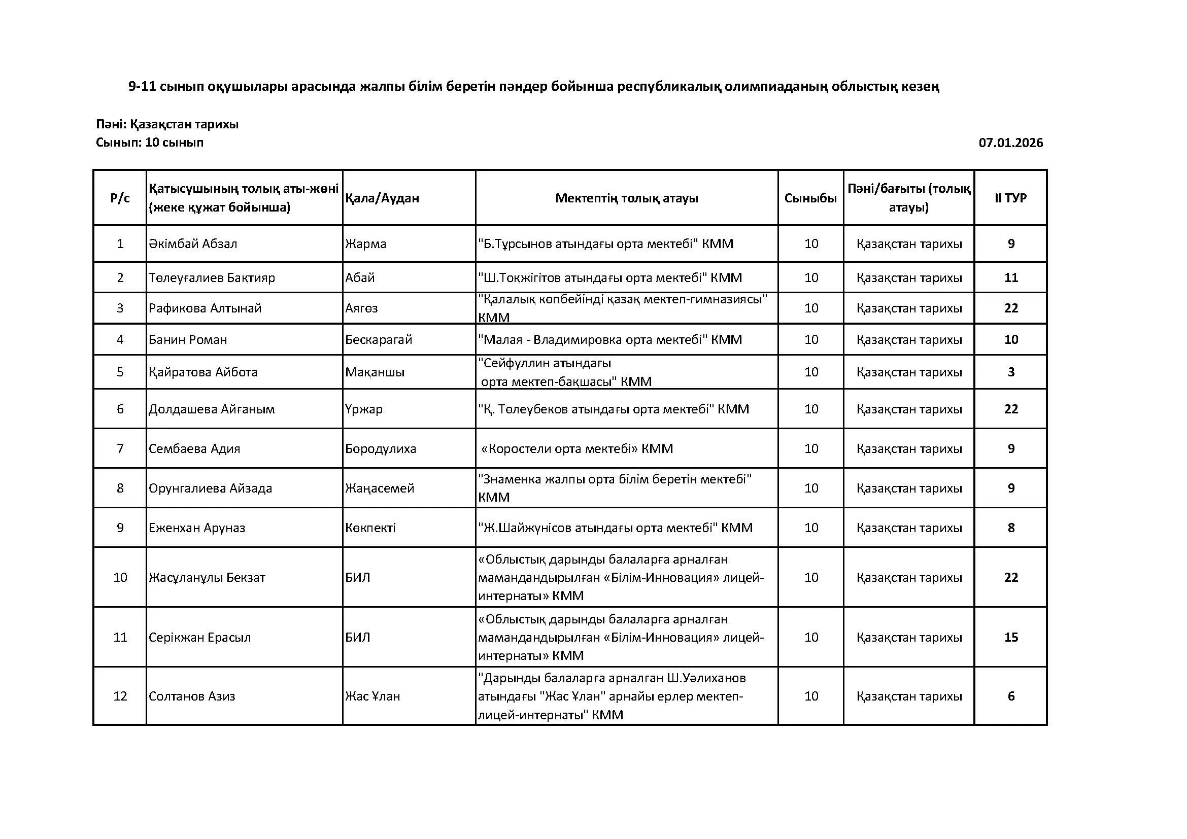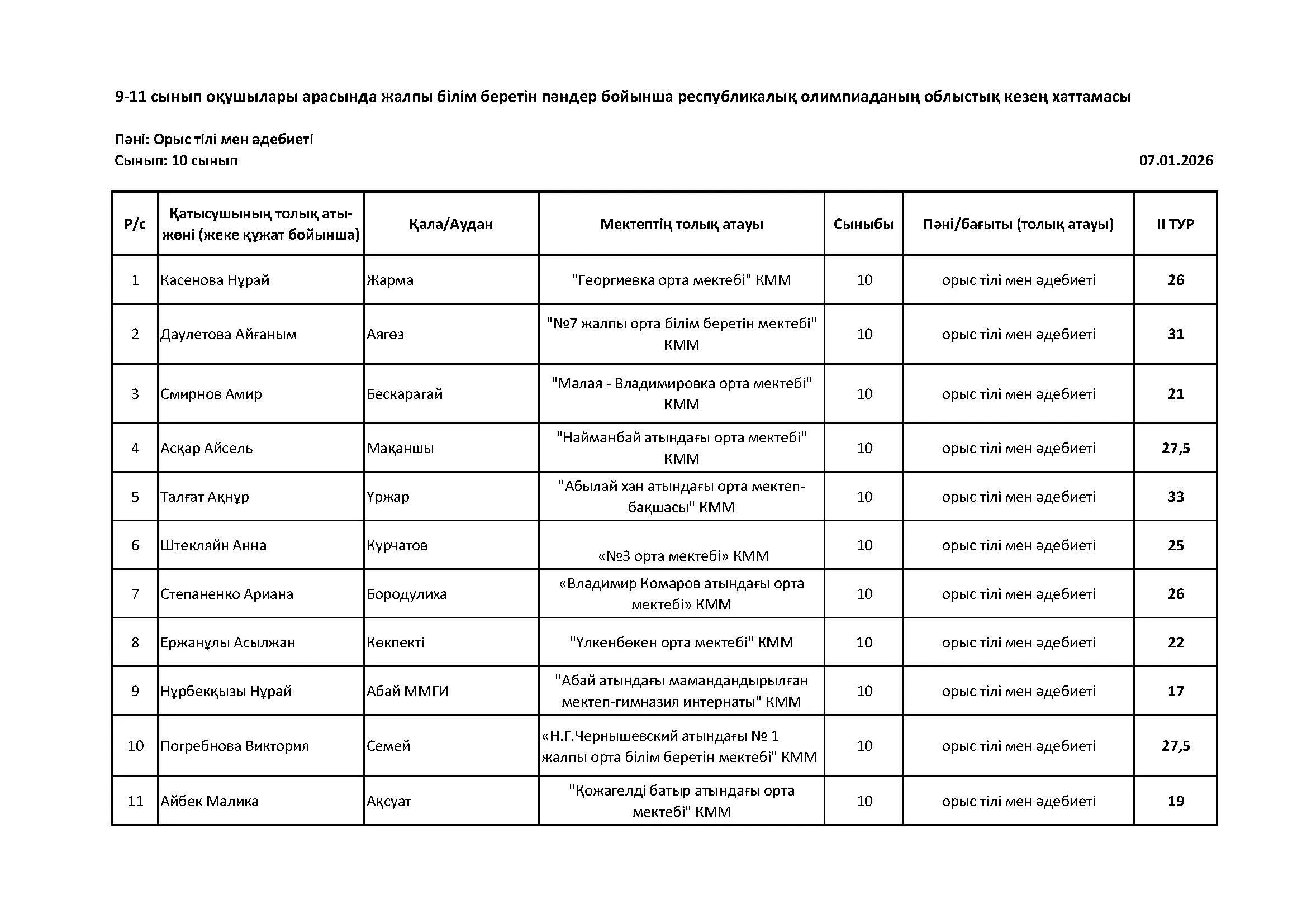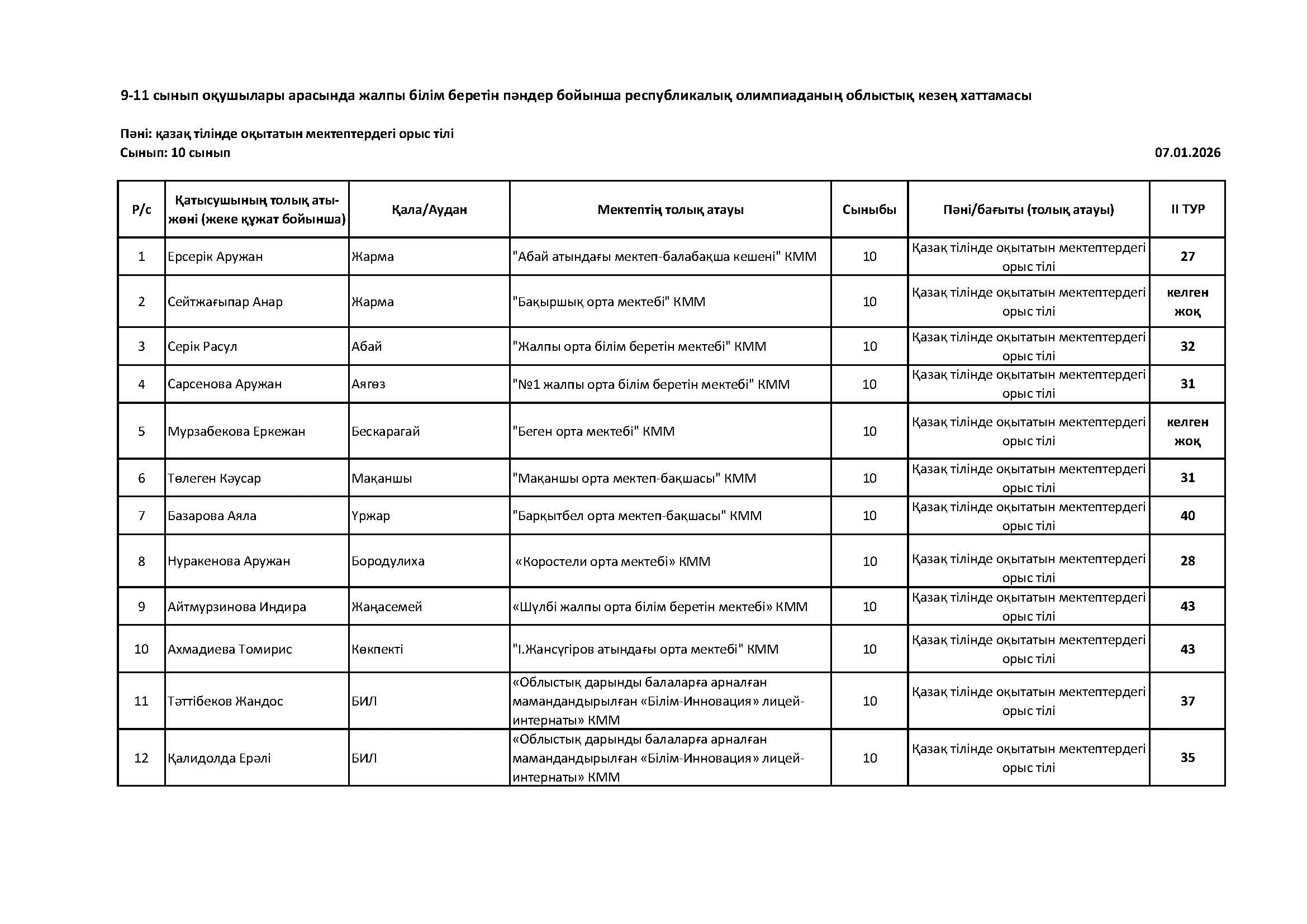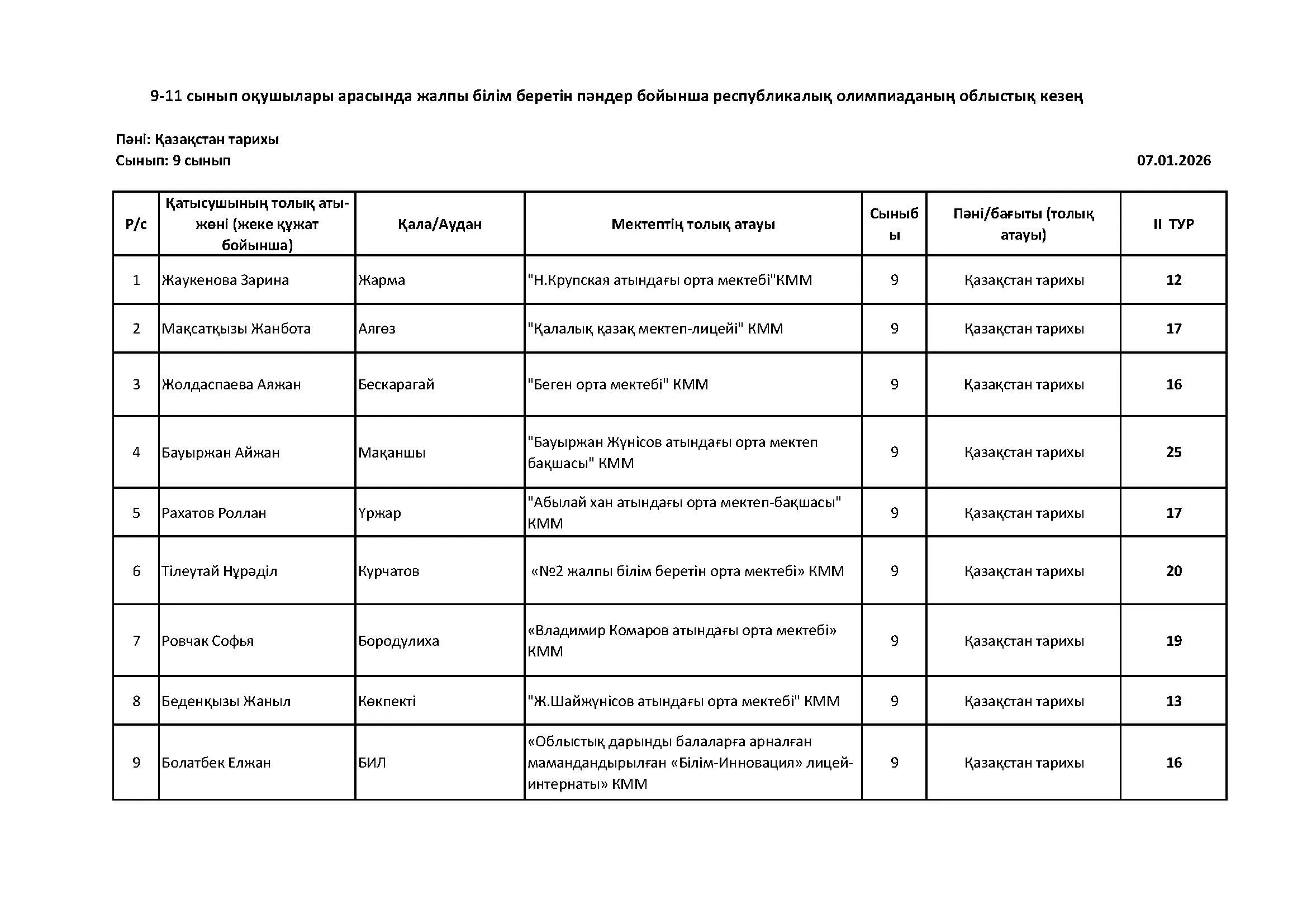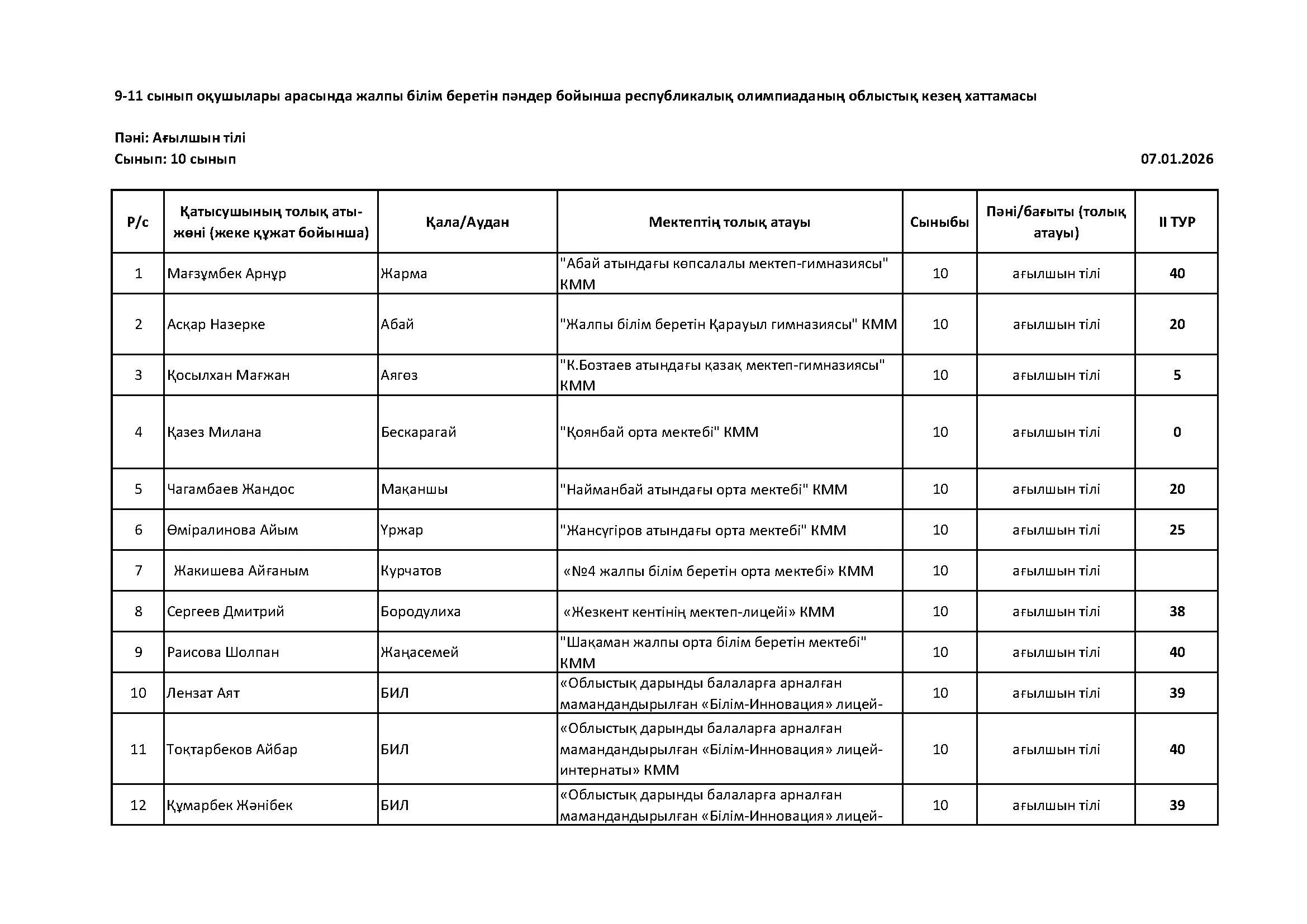 Жалпы білім беретін пәндер бойынша республикалық олимпиаданың облыстық кезеңінің қорытындысы (2 тур) Дарын Орталығы 07.01.2026