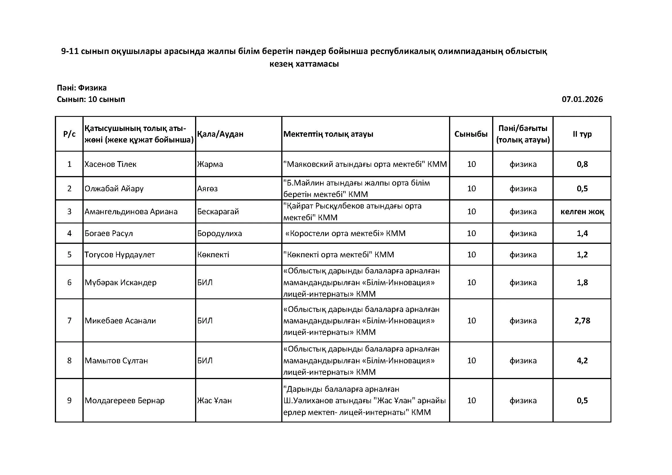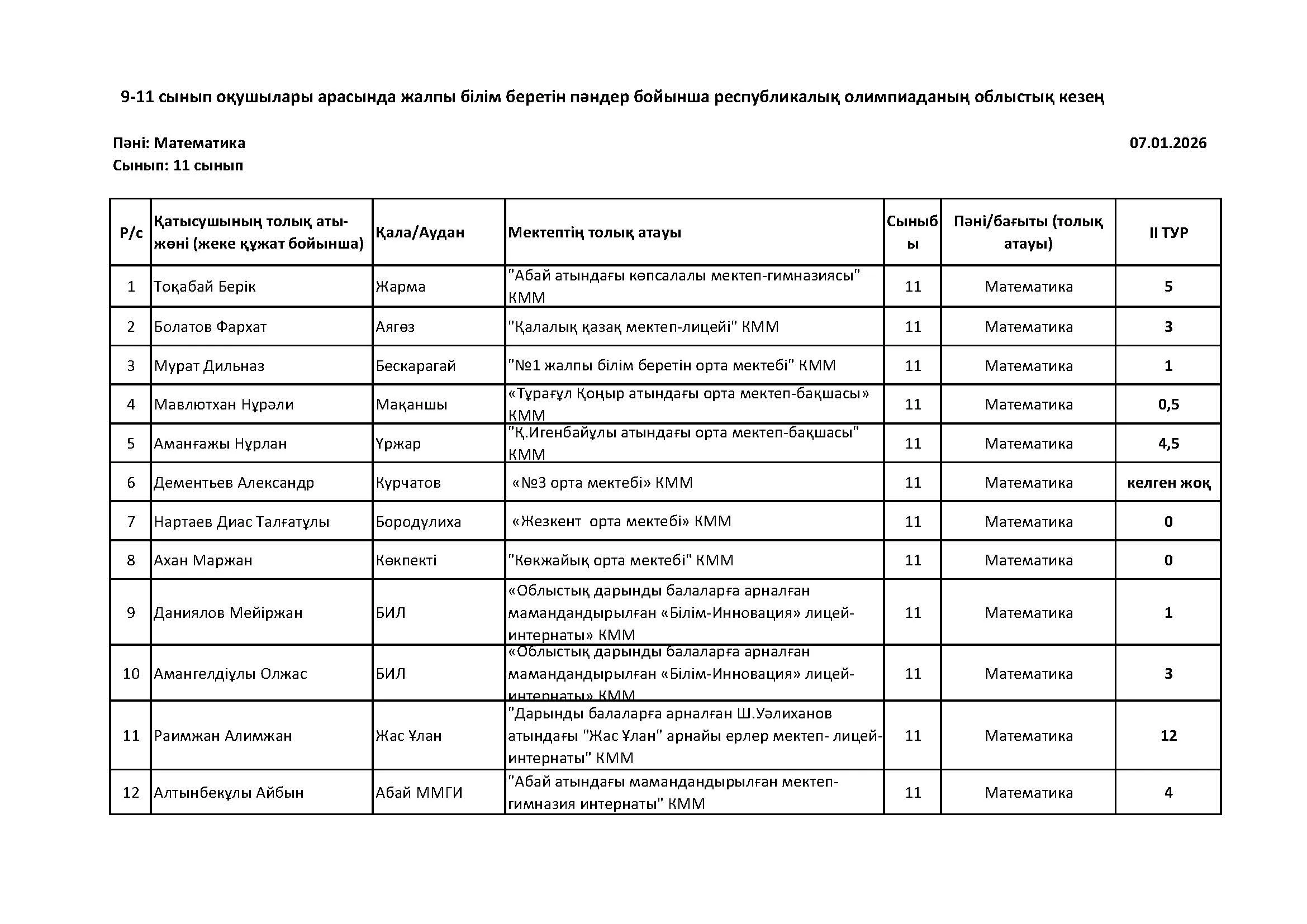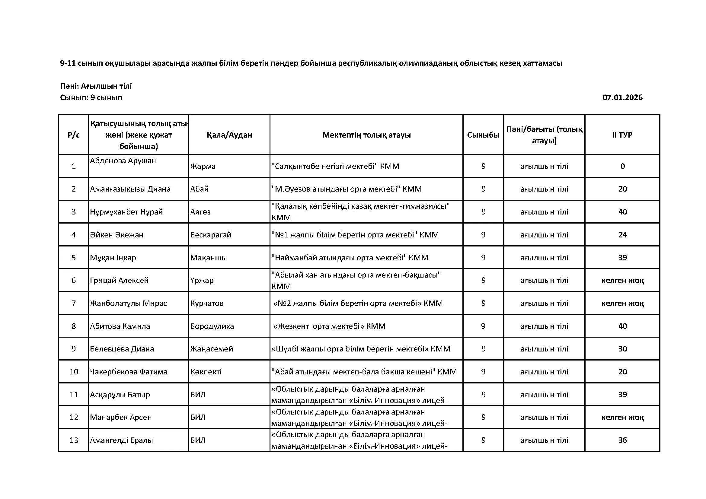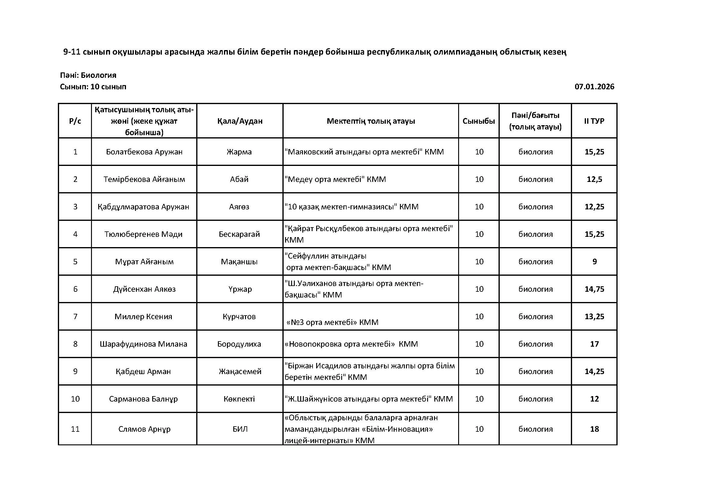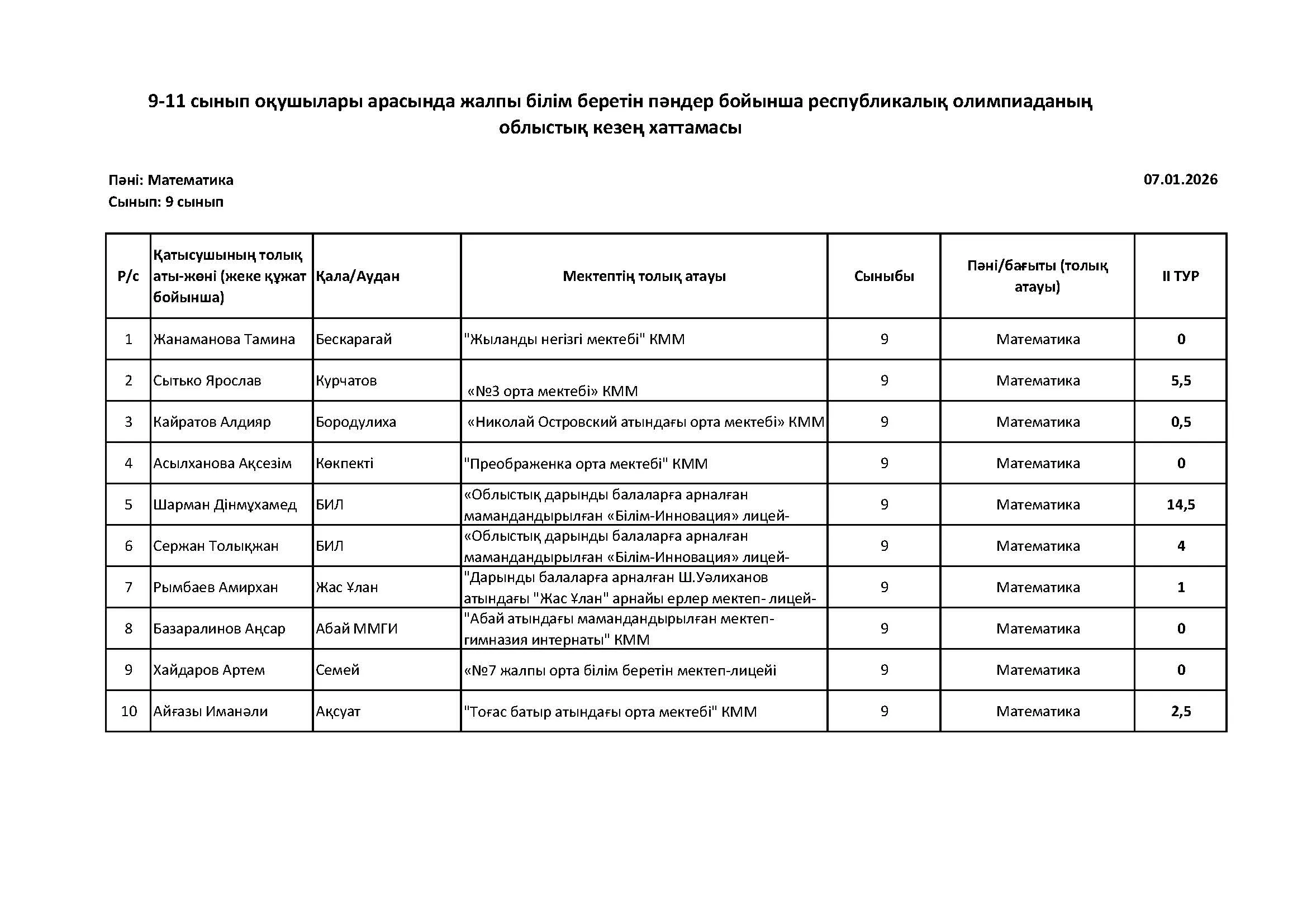 Жалпы білім беретін пәндер бойынша республикалық олимпиаданың облыстық кезеңінің қорытындысы (2 тур) Дарын Орталығы 07.01.2026