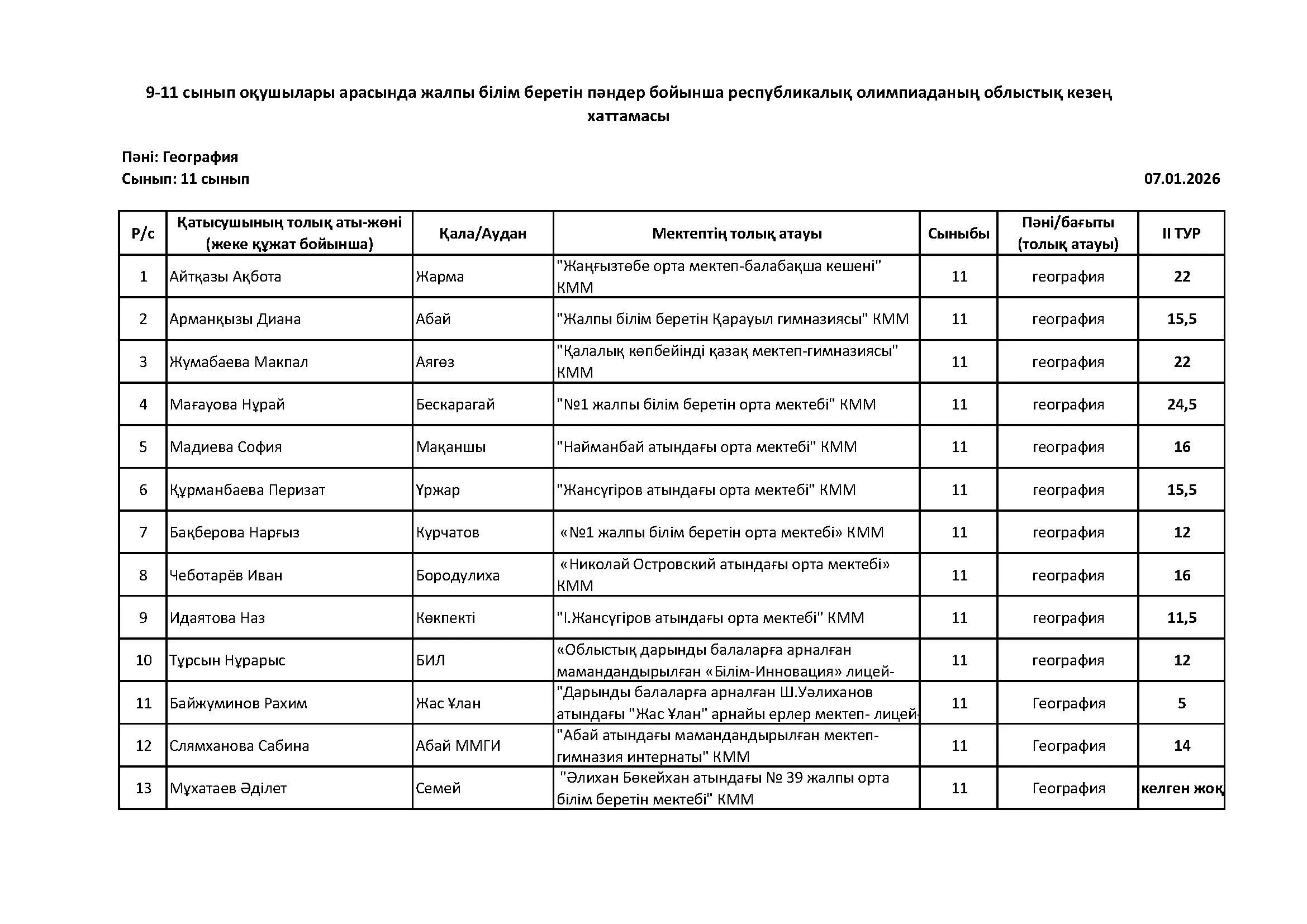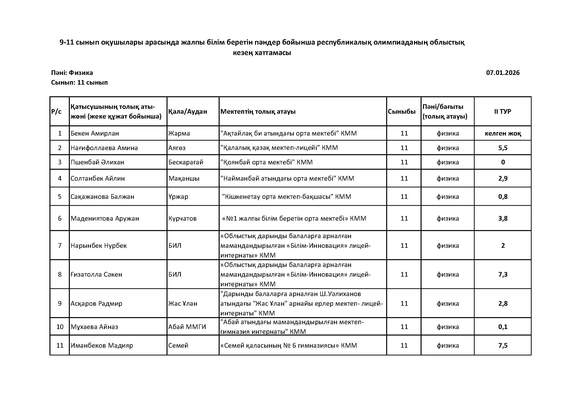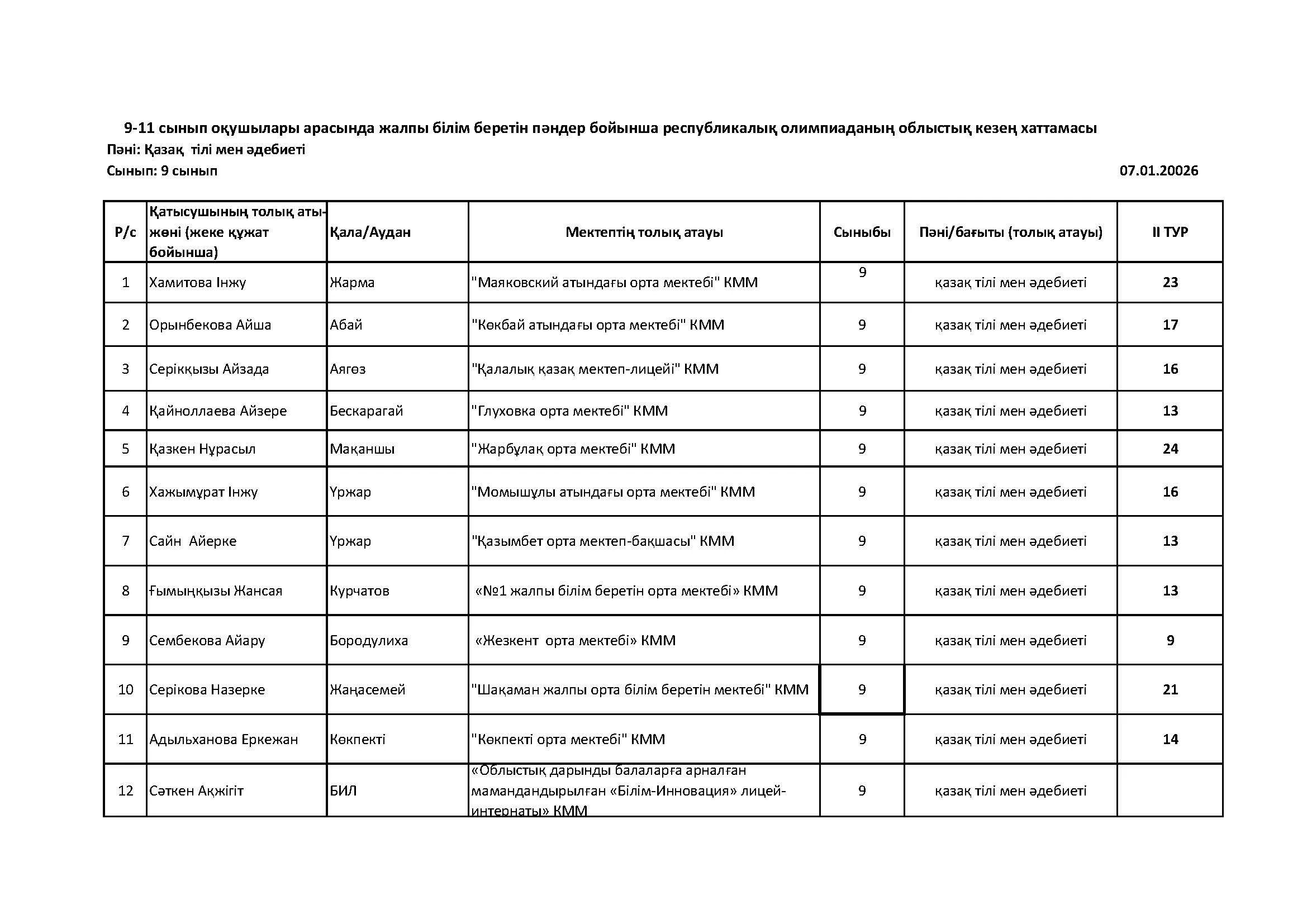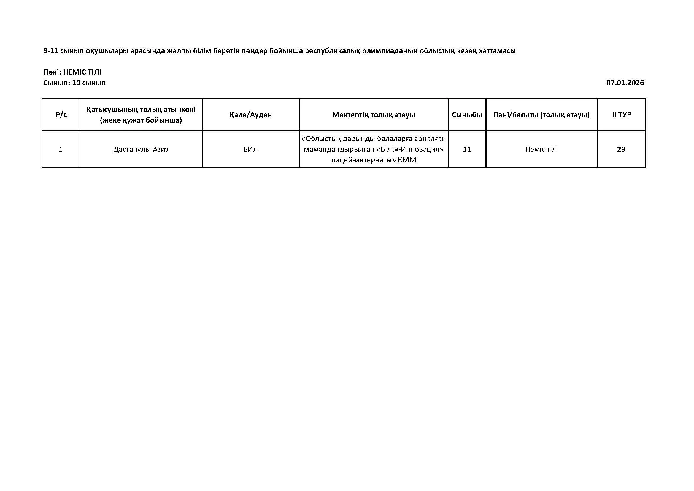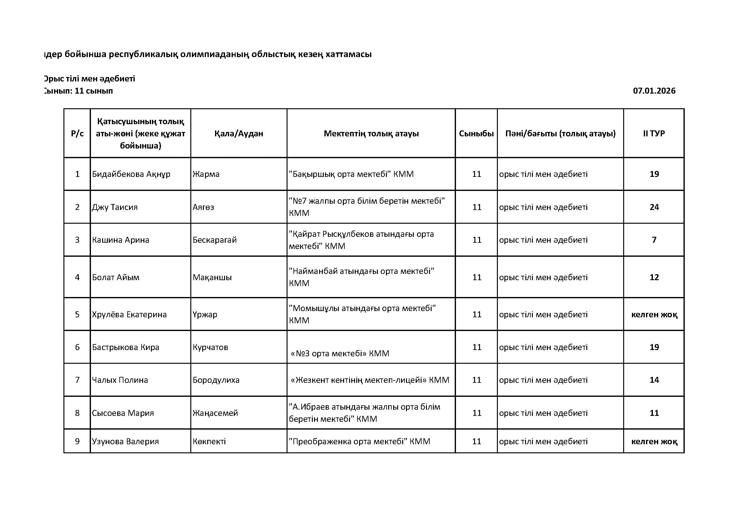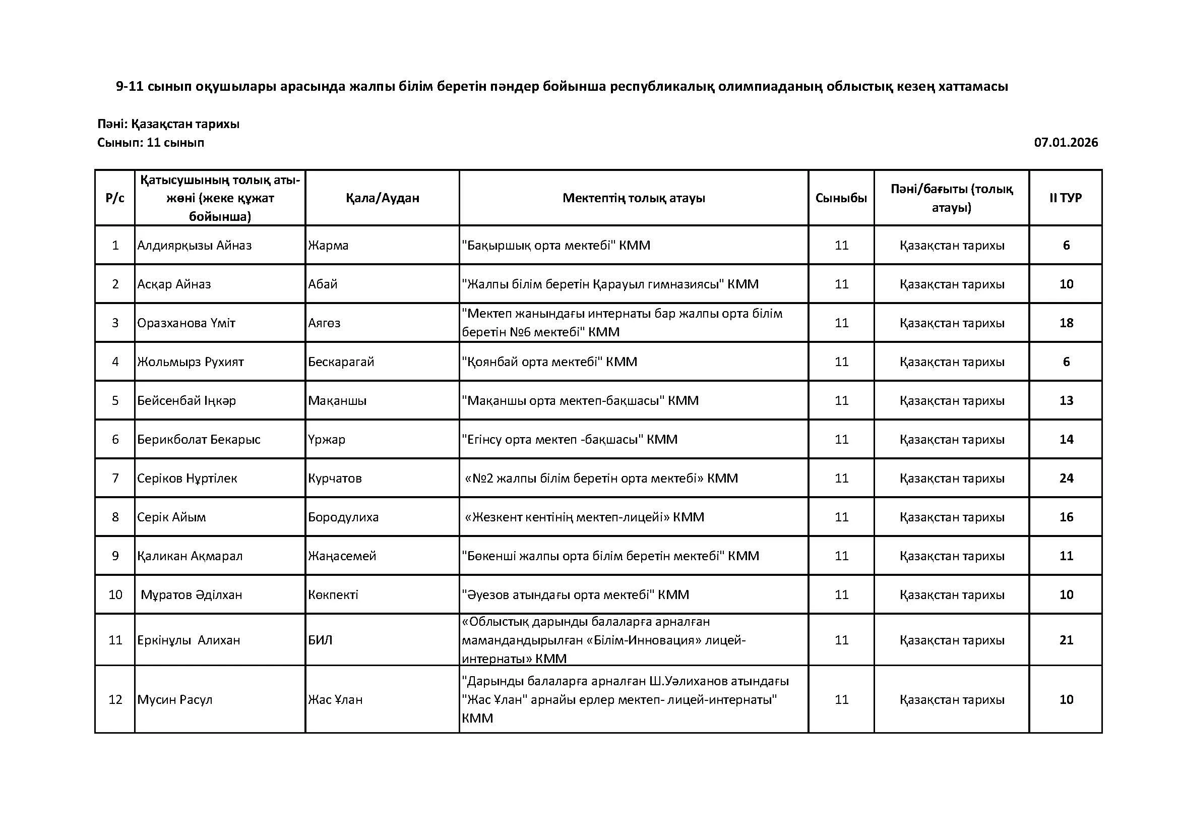 Жалпы білім беретін пәндер бойынша республикалық олимпиаданың облыстық кезеңінің қорытындысы (2 тур) Дарын Орталығы 07.01.2026