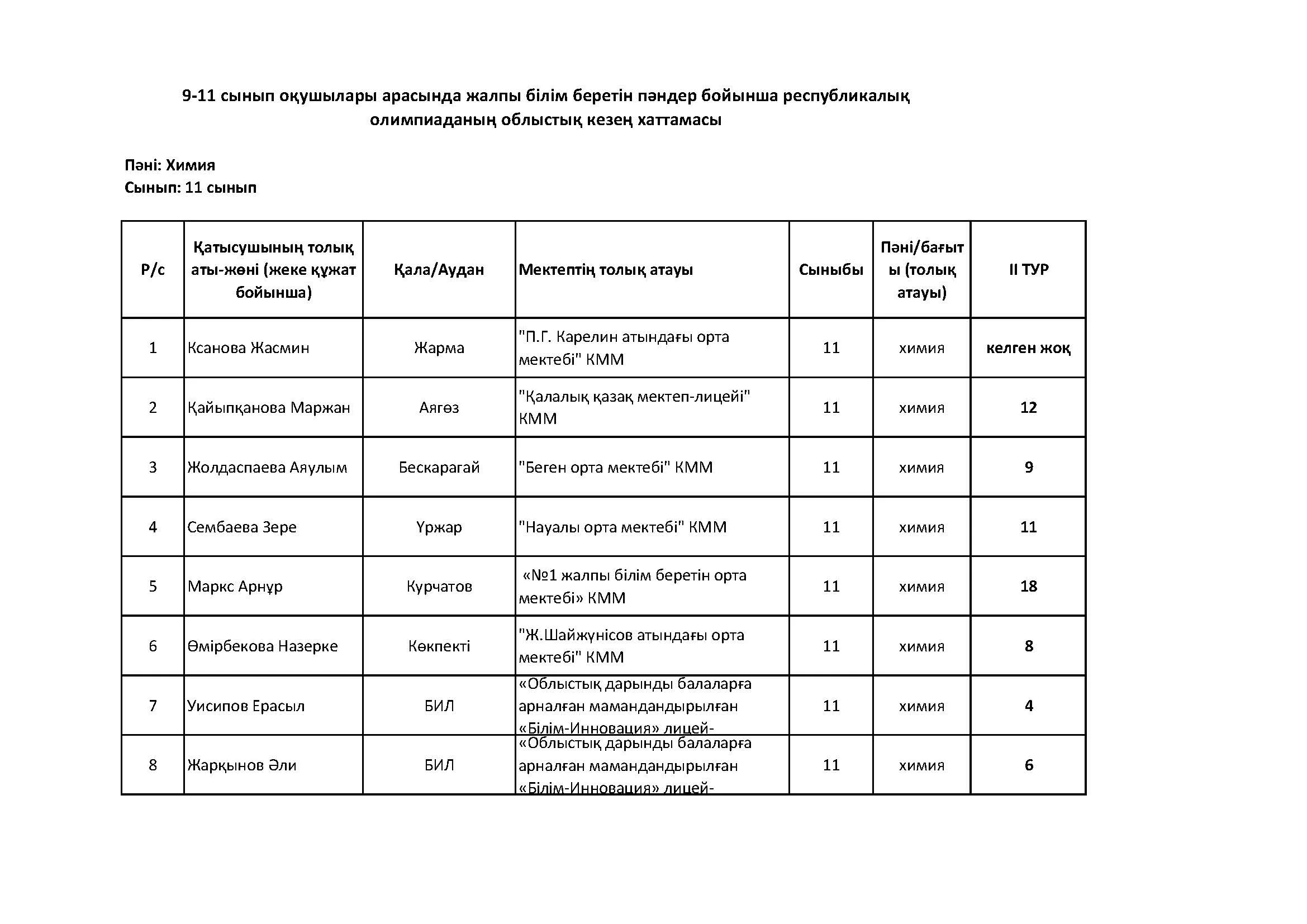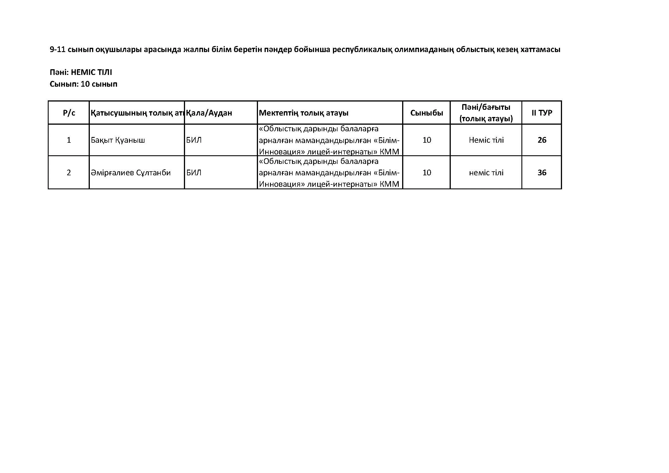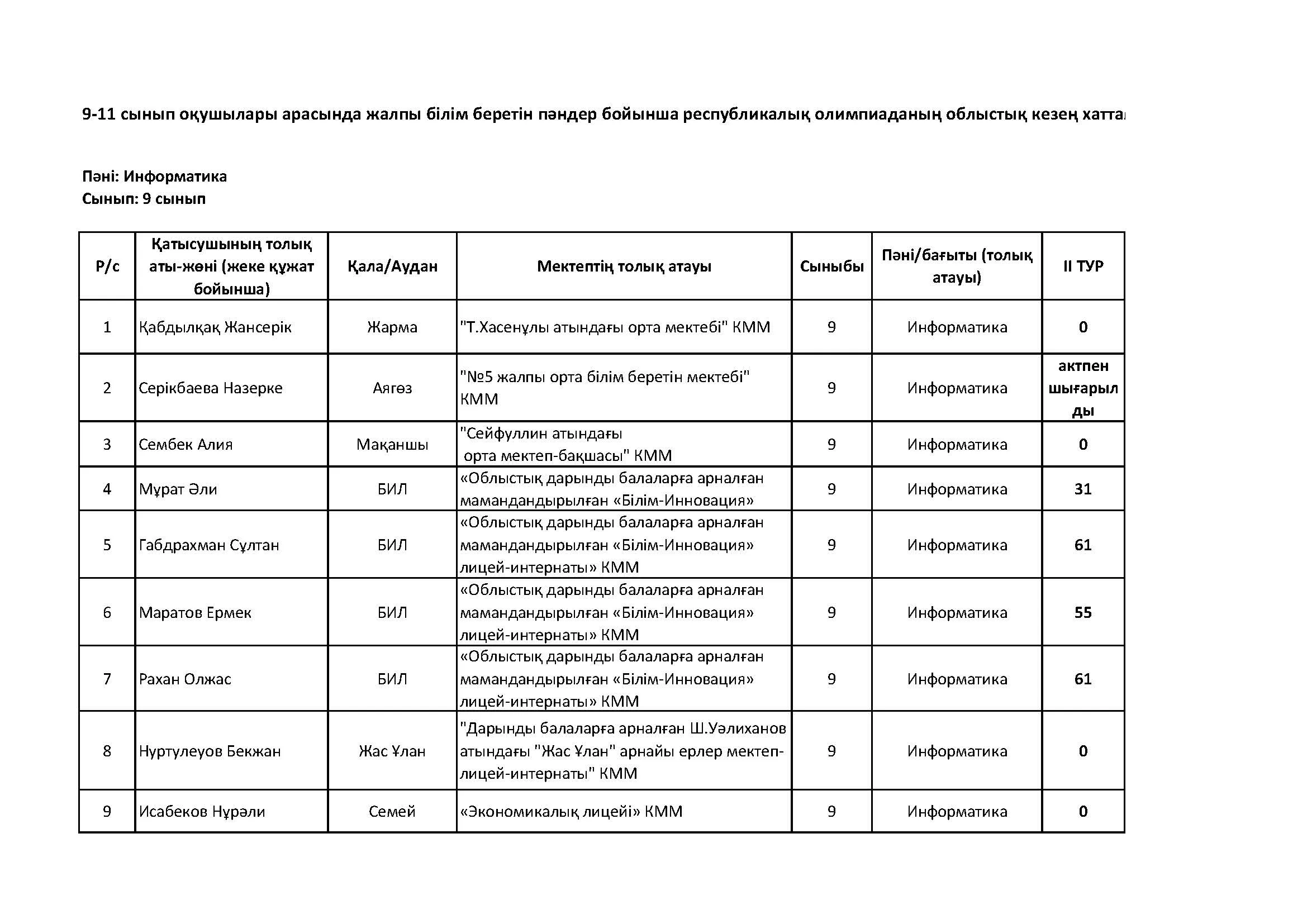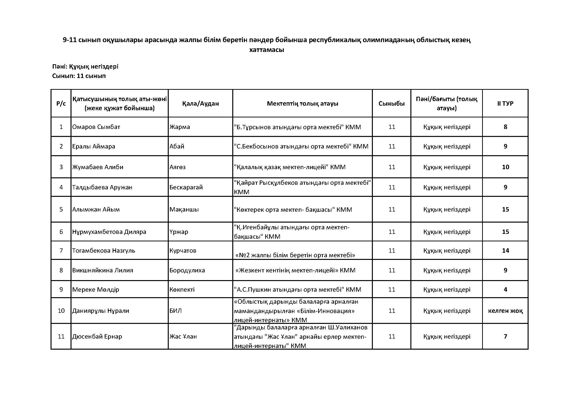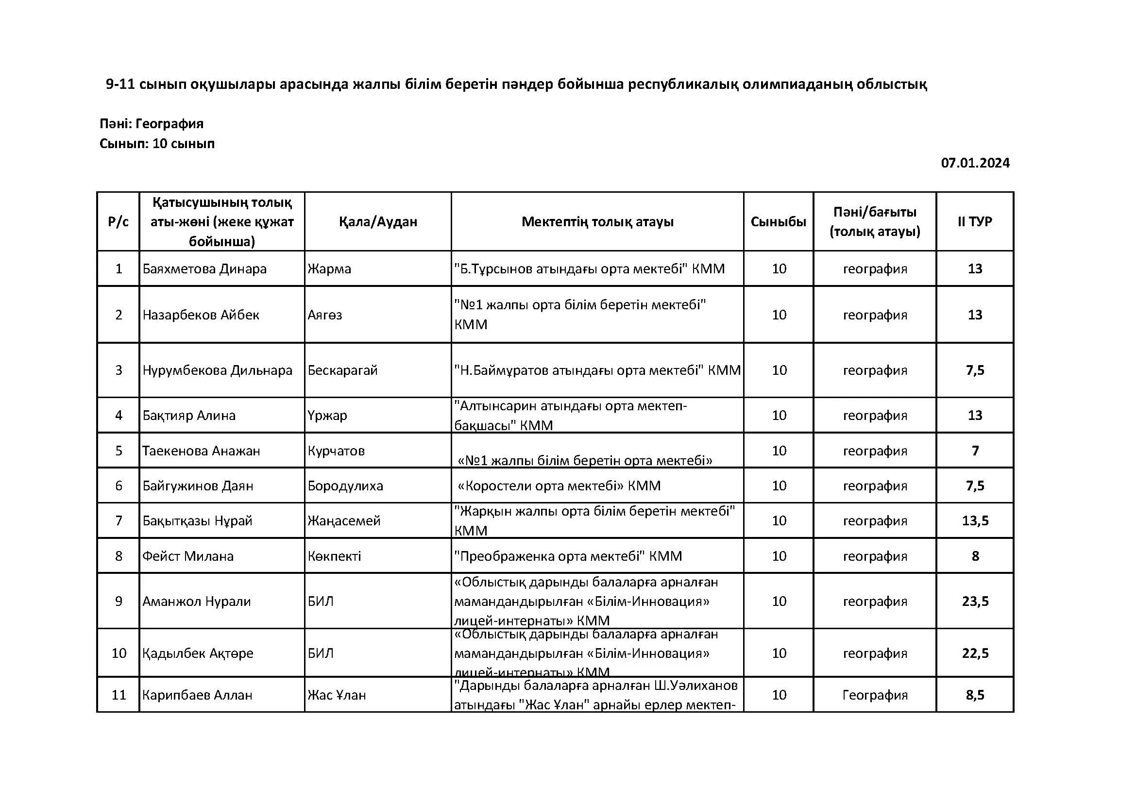 Жалпы білім беретін пәндер бойынша республикалық олимпиаданың облыстық кезеңінің қорытындысы (2 тур) Дарын Орталығы 07.01.2026
